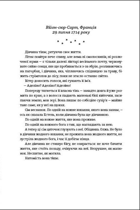 Так починається неймовірне життя Адді Лярю, її приголомшлива подорож століттями і континентами, історією і мистецтвом, під час якої вона шукає способу залишити слід у світі.