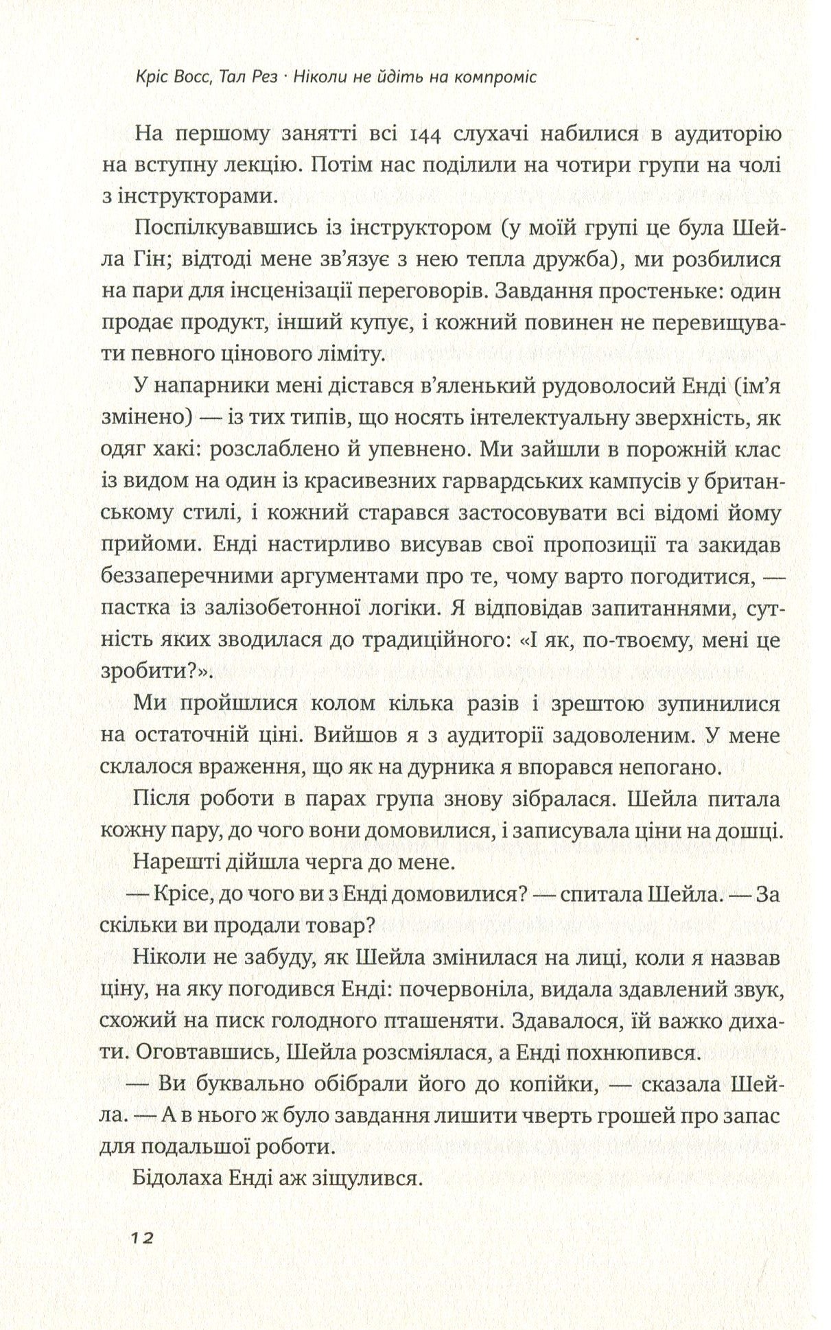 Кріс Восс - колишній міжнародний переговорник ФБР, який займався звільненням заручників. У своїй книжці, написаній у співавторстві з Талом Резом, він пропонує практичний підхід до ведення важливих переговорів, де ставки дуже високі. Восс описує навички, які допомагали йому та його колегам вести переговори, результатом яких ставав порятунок життя. Він описує дев'ять тактик і стратегій, які можна застосовувати будь-де: і на переговорах ради директорів, і в особистому житті.