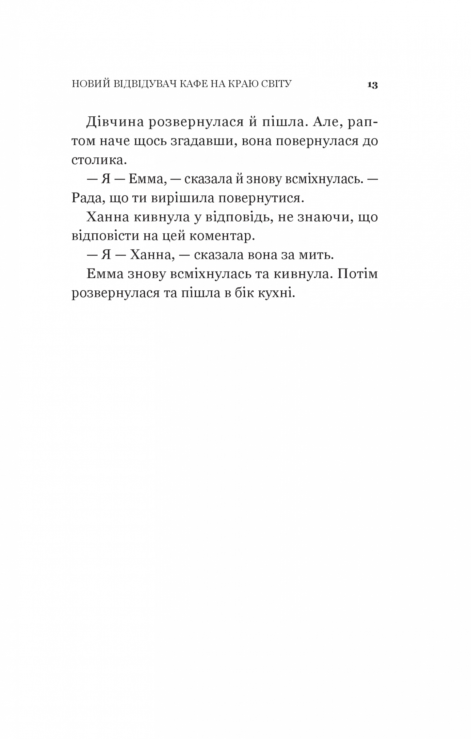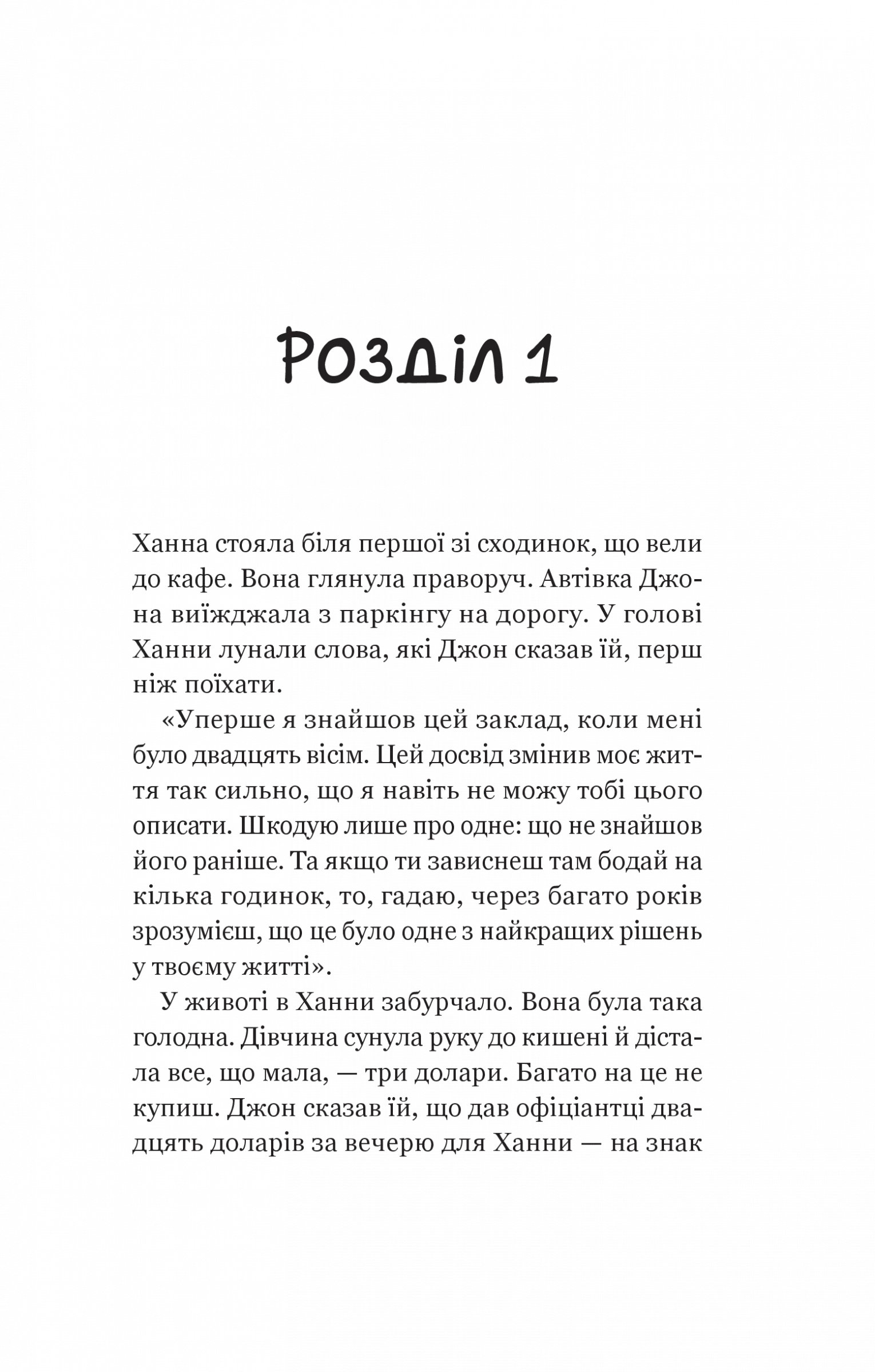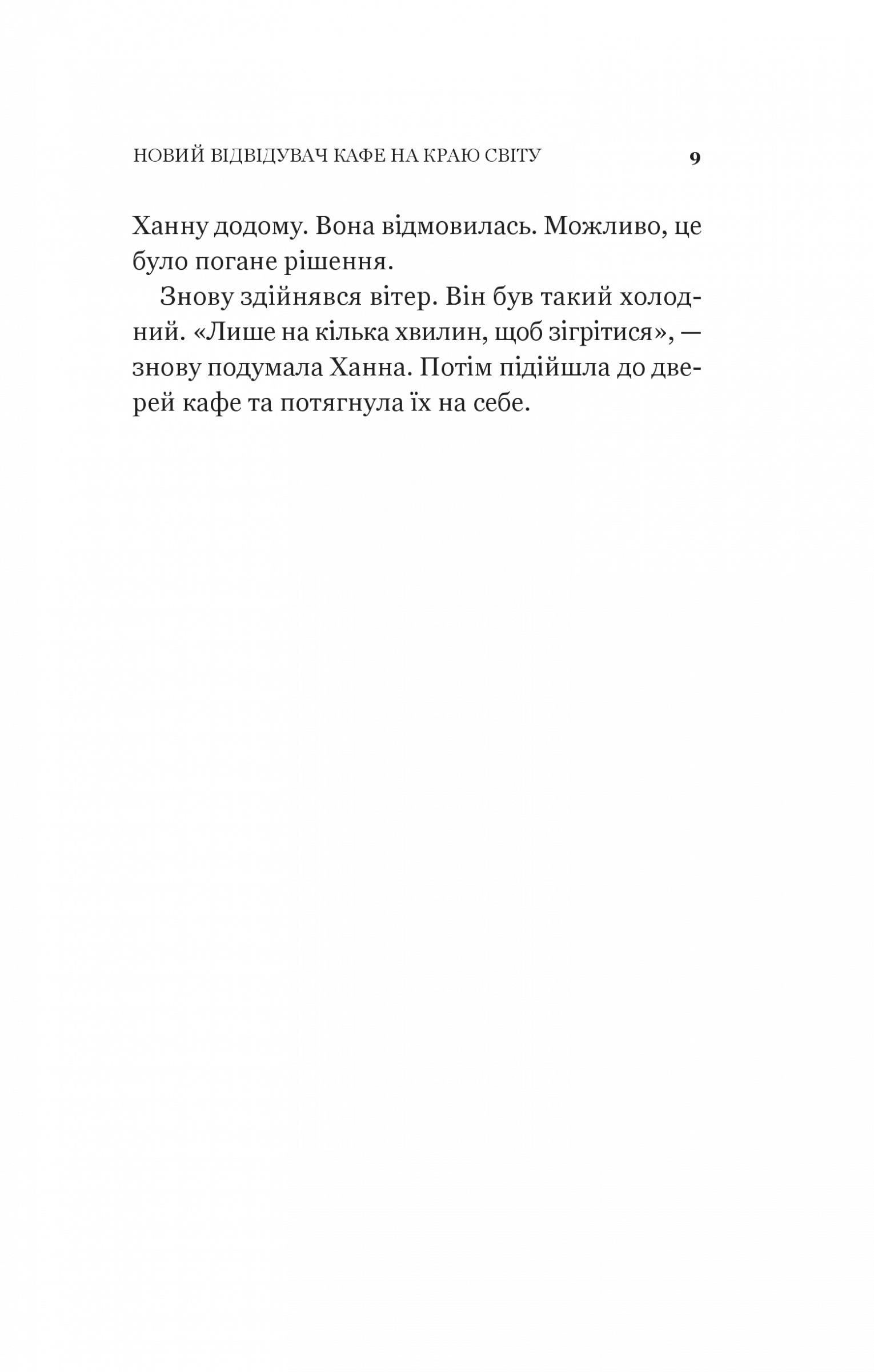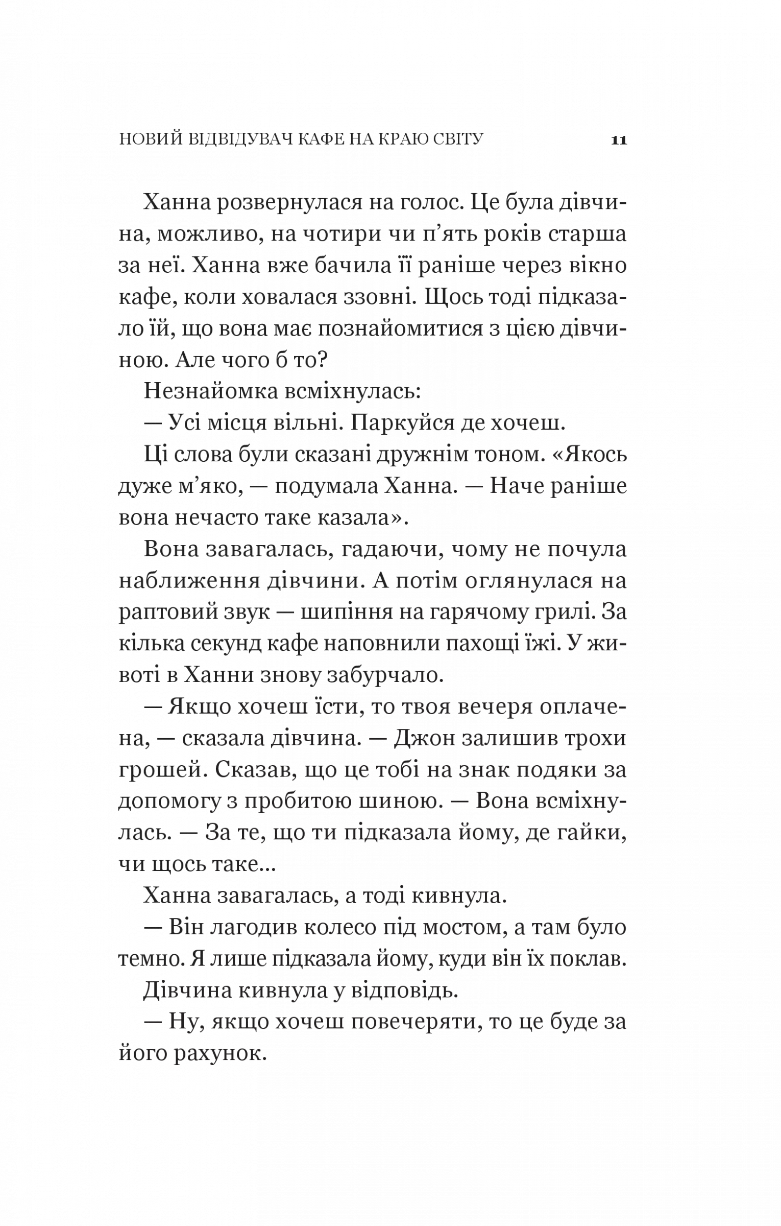 Ханні п’ятнадцять, але вона вже багато пережила. Їй завжди бракувало батьківської уваги, тож мусила піклуватися про себе самотужки. Дівчина почувалася непотрібною. Була переконана, що світ — небезпечний і недобрий. Чимало речей у цьому кафе видалися їй дивними, а питання на звороті меню схвилювали: Хто ви? Звідки ви будете? Чому ви тут? Ханна почала обговорювати їх із привітним персоналом і відкрила для себе світ нових можливостей. Так, ніби вона потребувала окулярів, щоб побачити те, про що навіть не підозрювала. Хай як складається життя, ми завжди маємо вибір і вирішуємо, яким воно буде. А ви готові замовити власну реальність?