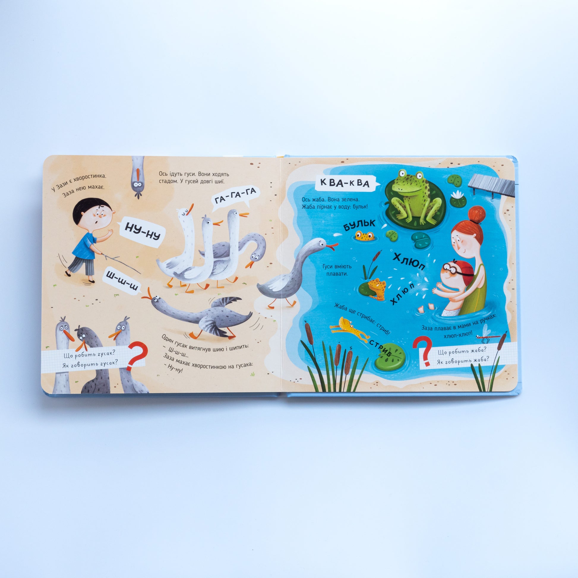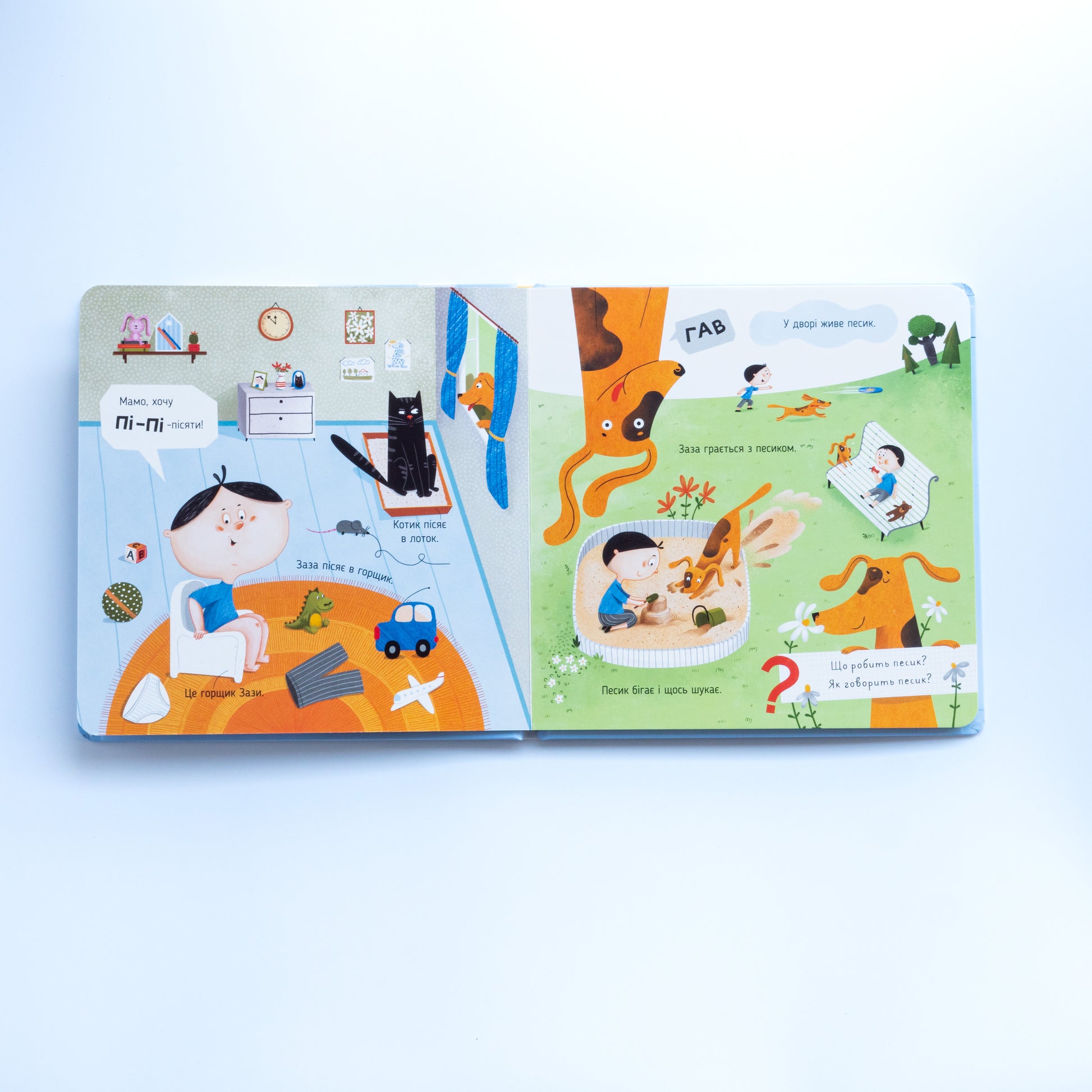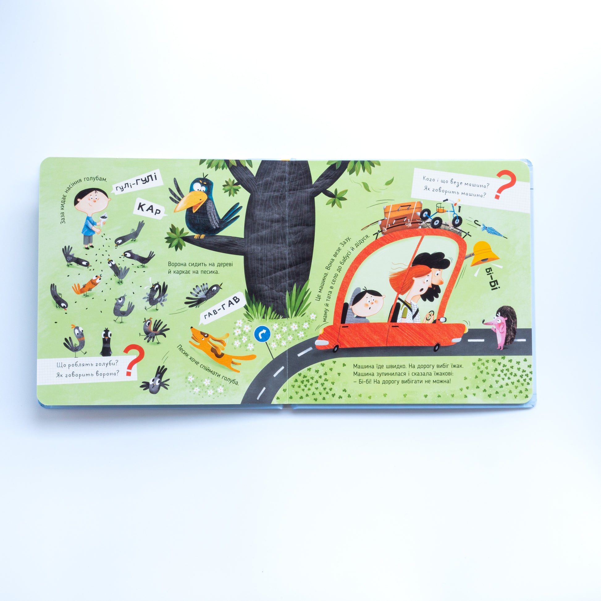 З цією книжкою дитина радіє, повторюючи звуки за тваринами, і водночас спостерігає актуальні для неї ситуації.