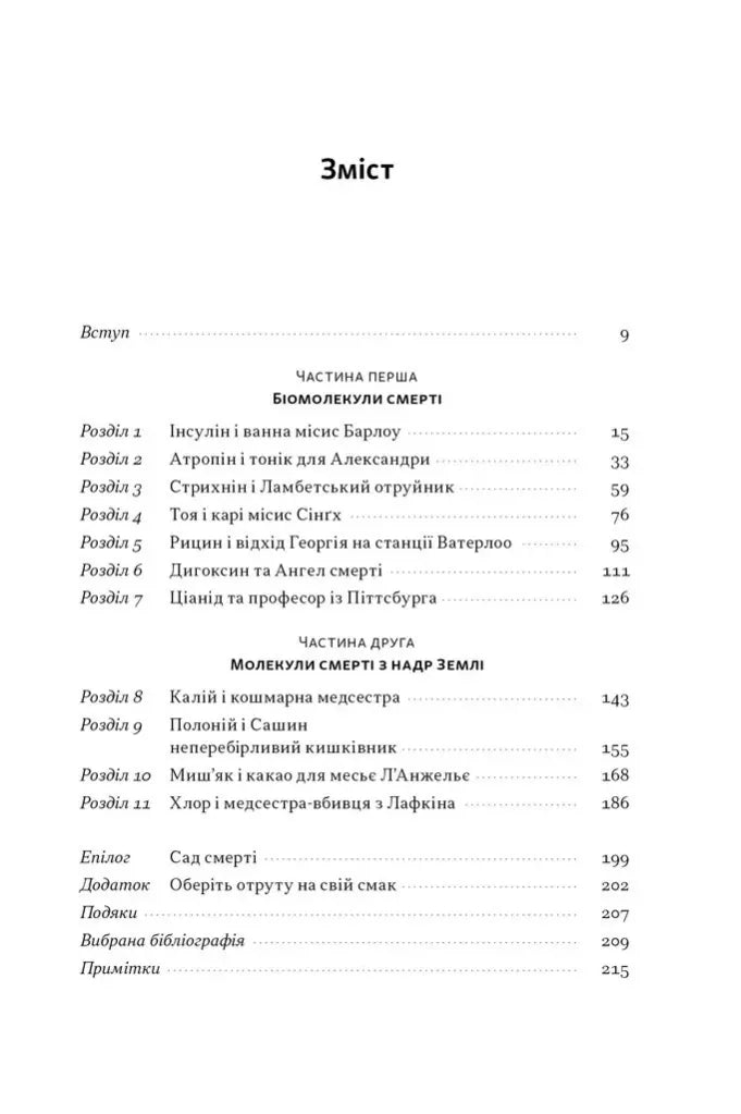 Отруєння — один із найпопулярніших способів, який вибирають підступні вбивці. Отруту можна підсипати в напій, намастити нею вістря стріли чи ручку дверей, або розпилити, щоб вона потрапила в організм через легені. Та як саме отрута руйнує нас із середини? У ваших руках — захопливе поєднання науково-популярної літератури, історії медицини і реальних злочинів. Доктор Ніл Бредбері досліджує одинадцять смертельних речовин і їхній вплив на людський організм на молекулярному, клітинному та фізіологічному рівнях. Автор сплітає воєдино розповіді про покинутих коханців, сумнівних науковців, підозрілих медиків і політичних убивць. Від смертоносного походження коктейлю джин-тонік до шпалер із миш’яком у спальні Наполеона — ця книжка занурить читачів у цікаву подорож заплутаними і складними системами, які підтримують наше життя.