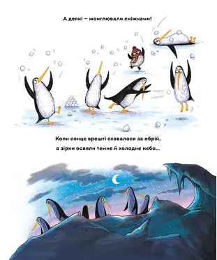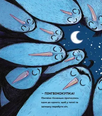 Коли сонце заходить за обрій і на Північному полюсі настає холодна ніч, зграя пінгвінів збирається у ПІНГВІНОКУПКУ, щоб їм було тепло й затишно. Та якось уночі здійнявся крижаний буревій. А наступного ранку пінгвіни змерзлися, немов велетенське ПІНГВІНЯЧЕ морозиво! Оце так пінгвіняча задачка! Та в найменшого з них, Писклика, є ідея…Це безтурботна історія про кумедних пінгвінів, силу дружби й готовність допомогти тим, хто потрапив у біду.