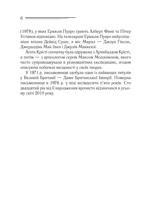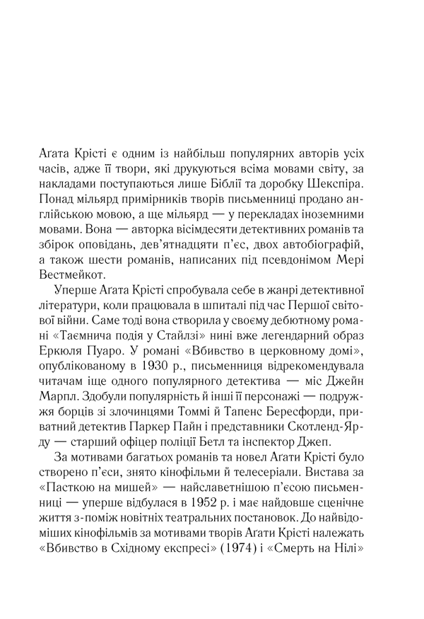Аґату Крісті знають у всьому світі як королеву детективу. Продано близько мільярда примірників її творів англійською мовою, ще один мільярд — у перекладі 100 іноземними мовами. Вона — найпопулярніший автор усіх часів. За кількістю перевидань її книжки поступаються лише Біблії та творам Шекспіра.