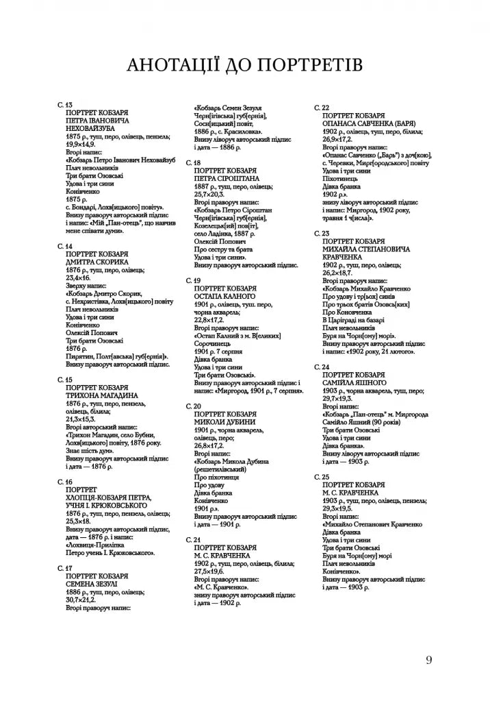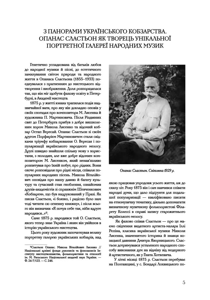 Портретна галерея українських кобзарів, створена видатним українським художником та етнографом Опанасом Сластьоном (1855-1933), вперше репродукується у кольорі з оригіналів, що зберігаються у фондах Національної бібліотеки України імені В. І. Вернадського. 23 портрети українських кобзарів, створені автором у 1875-1928 роки, свідчать про глибоке знання художником субкультури кобзарства. До портретів кобзарів долучена передмова відомого українського мистецтвознавця п. Віталія Ханка.