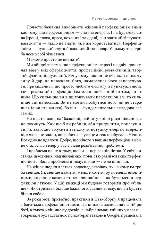 Психотерапевтка Кетрін Морґан Шафлер пропонує новий погляд на перфекціонізм, розглядаючи його як потенційну силу, а не недолік. У книзі вона виділяє п'ять типів перфекціонізму та надає індивідуальні стратегії для кожного, допомагаючи читачкам прийняти свою природу та використовувати її для досягнення успіху і гармонії.