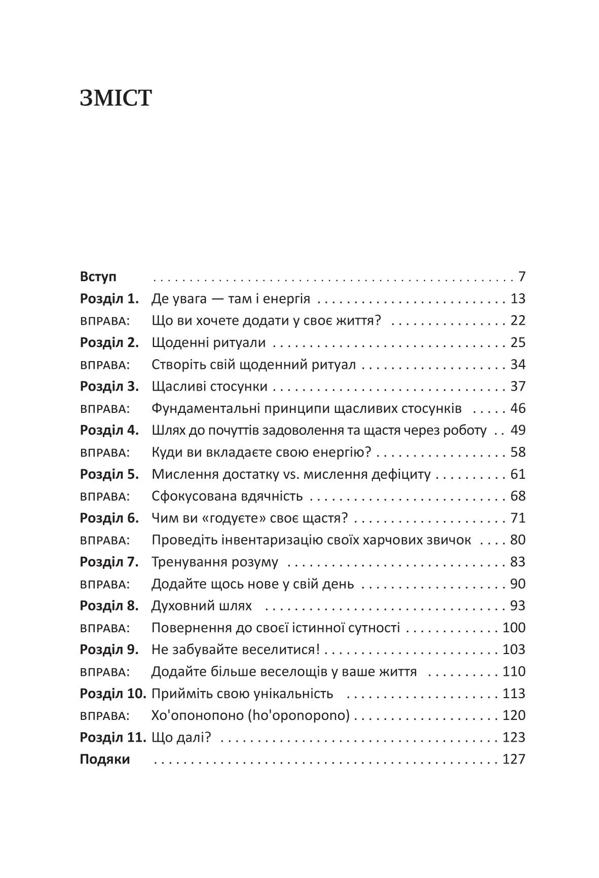 Посібник зі щастя – це своєрідна інструкція з надихаючими прикладами історій реальних людей, які змогли створити своє щасливе життя. Кожна практична вправа, незважаючи на свою простоту, допоможе вам подолати перешкоди на шляху до наповнення щастям вашого власного життя.У цій книзі автор зібрав історії людей із найяскравішими прикладами життєвої трансформації, щоб показати вам, як можна реально звільнитися від умовностей, які заважають вам отримувати від життя все, що ви хочете. Посібник зі щастя пропонує прості стратегії для створення більш щасливих стосунків, отримання задоволення від роботи, розвитку мислення достатку та багато іншого. Завдяки легким щоденним ритуалам ви зможете постійно підтримувати свій намір жити щасливо щодня.