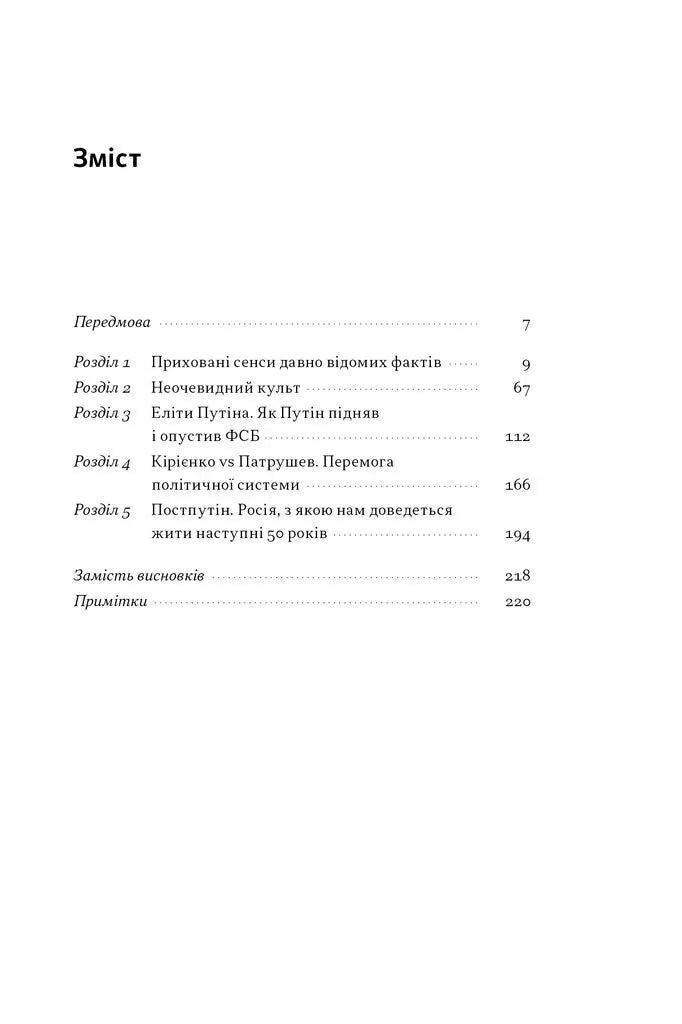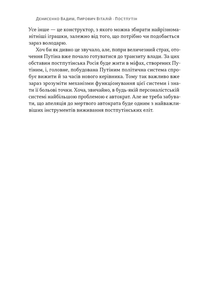 Якою буде Росія в наступні 50 років? Чи зміниться траєкторія її руху після Путіна в бік лібералізації? Або ж навпаки, диктатор і після смерті залишиться впливовим фактором життя країни-агресора, а консервація режиму продовжиться на основі його «культу»?Автори цієї книжки «анатомічно» розкладають путінський режим на складові частини та пояснюють, чому Путін більше не довіряє ФСБ і не спирається на силовиків, роблячи вибір на користь «політичної системи».Проаналізована в книзі еволюція відносин Путіна з різними елітами допоможе зрозуміти, хто залишиться при владі в «постпутінський» період і власне визначатиме майбутнє Росії.