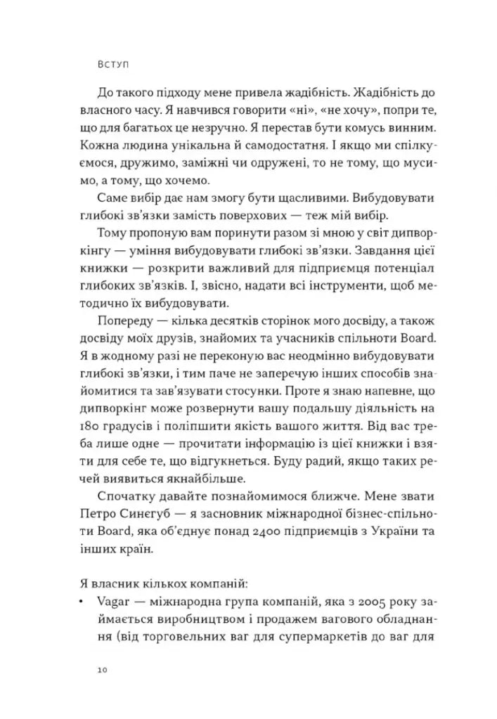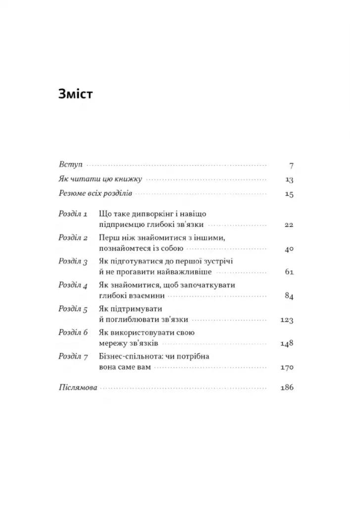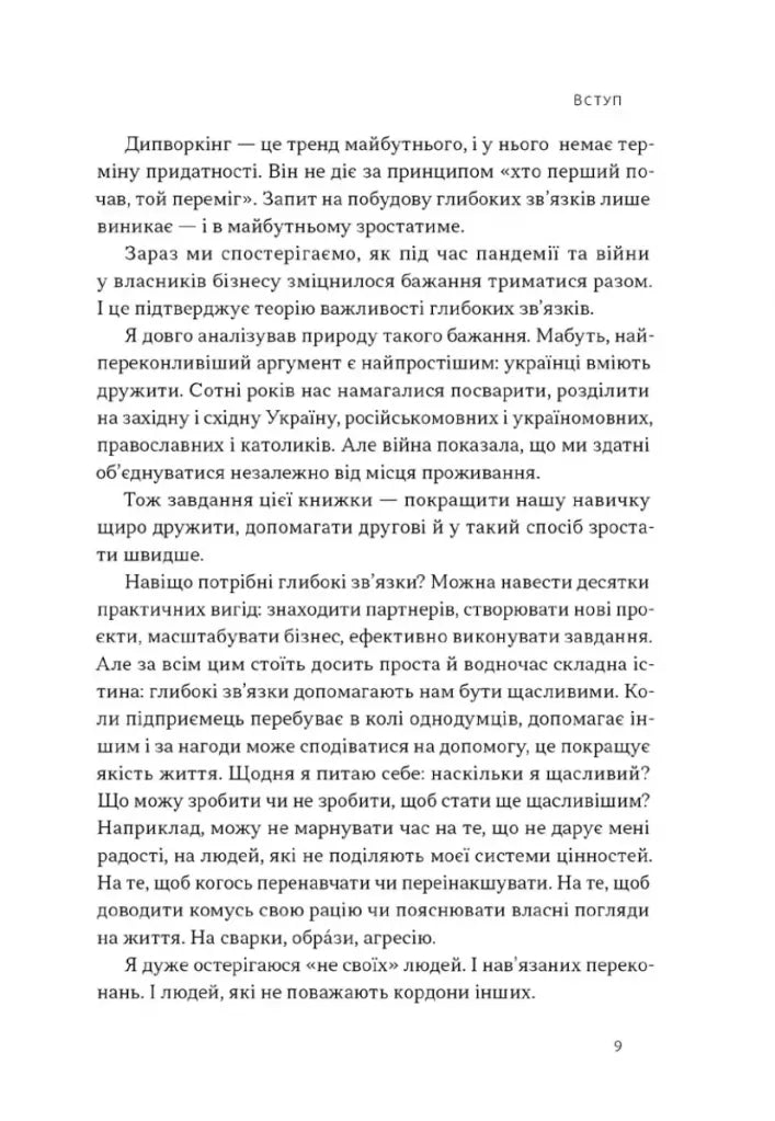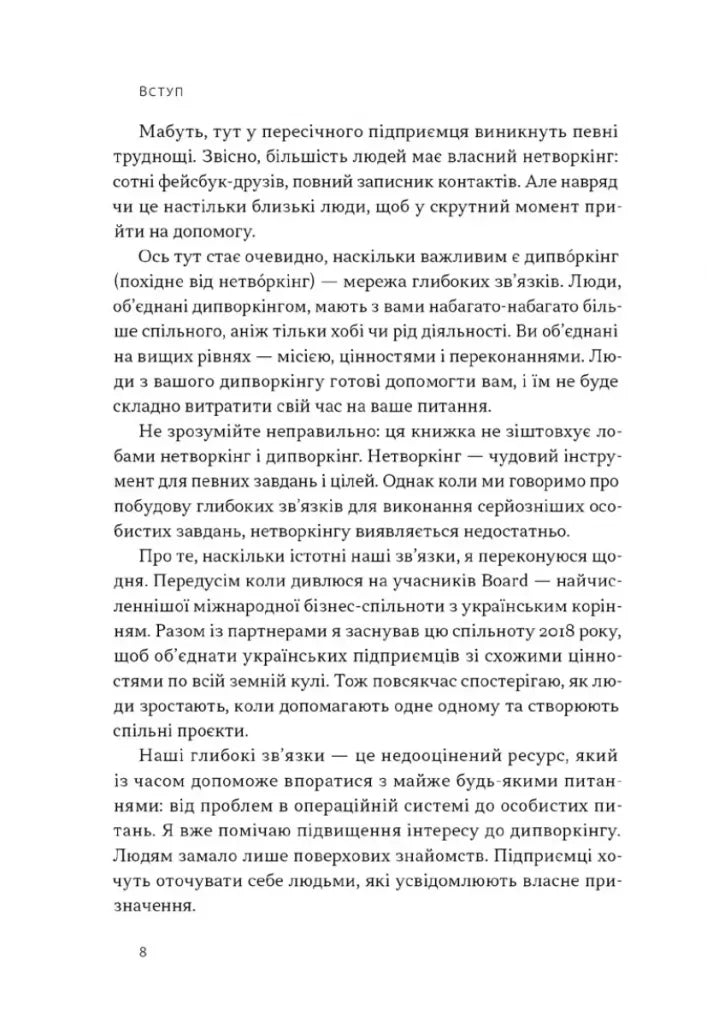 Дипворкінг (похідне від нетворкінг) — це мережа ваших глибоких зв’язків. Такі люди мають з вами набагато більше спільного, аніж тільки хобі чи рід діяльності. Ви об'єднані на вищих рівнях — місії, цінностей і переконань. Дипворкінг — це тренд майбутнього. Запит на побудову глибоких зв'язків лише виникає. У майбутньому він посилюватиметься. Тож саме зараз варто інвестувати свій час у вибудовування глибоких зв’язків.Навіщо? Можна навести багато практичних вигод: знаходити партнерів, створювати нові проєкти, масштабувати бізнес, ефективно виконувати завдання. Але за всім цим стоїть досить проста й водночас складна перевага: глибокі зв'язки допомагають нам бути щасливими. Тому пропоную вам поринути у світ дипворкінгу — вміння вибудовувати глибокі зв'язки. Це перша в світі книжка, що розкриває потенціал дипворкінгу, і, надає всі інструменти для методичного вибудовування глибоких зв’язків.