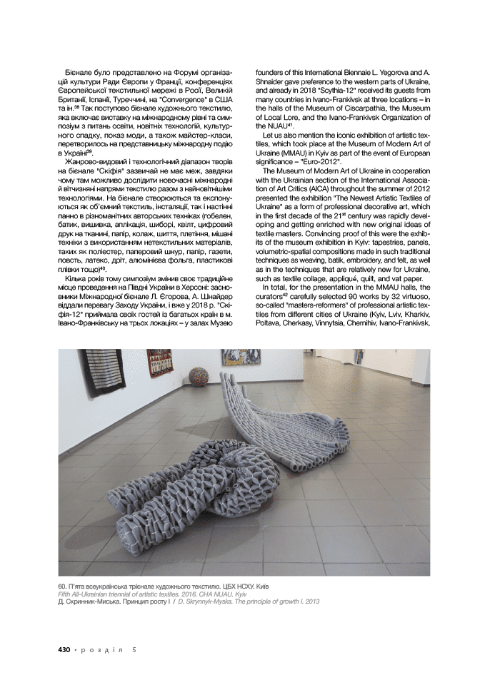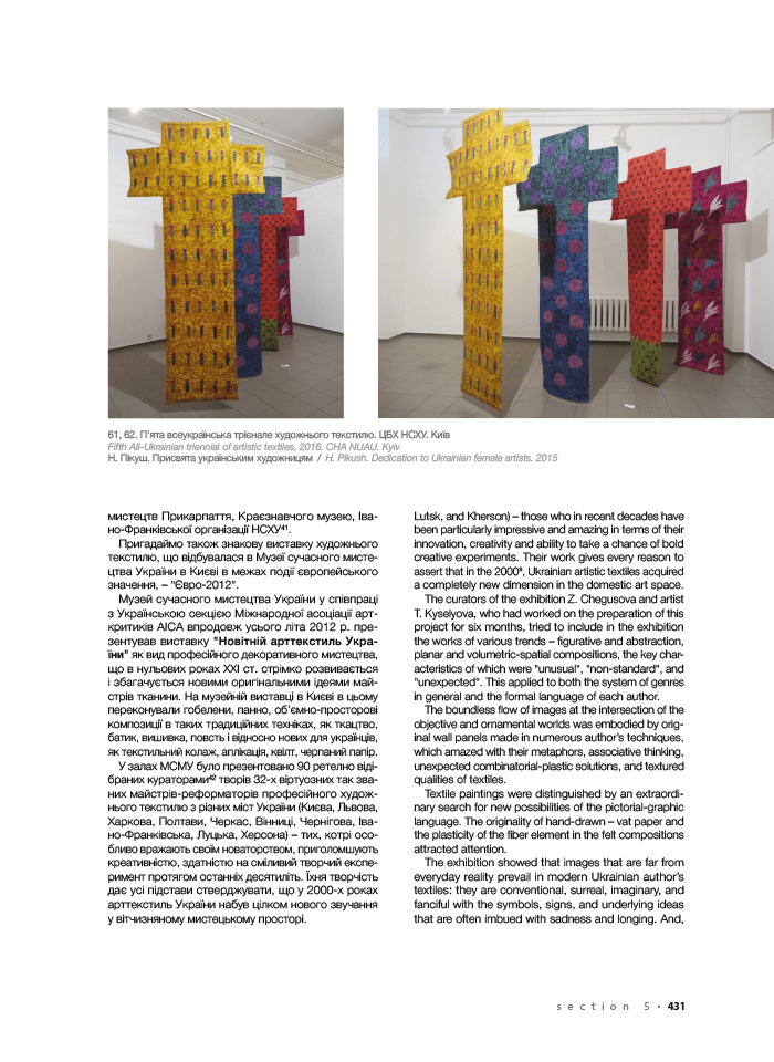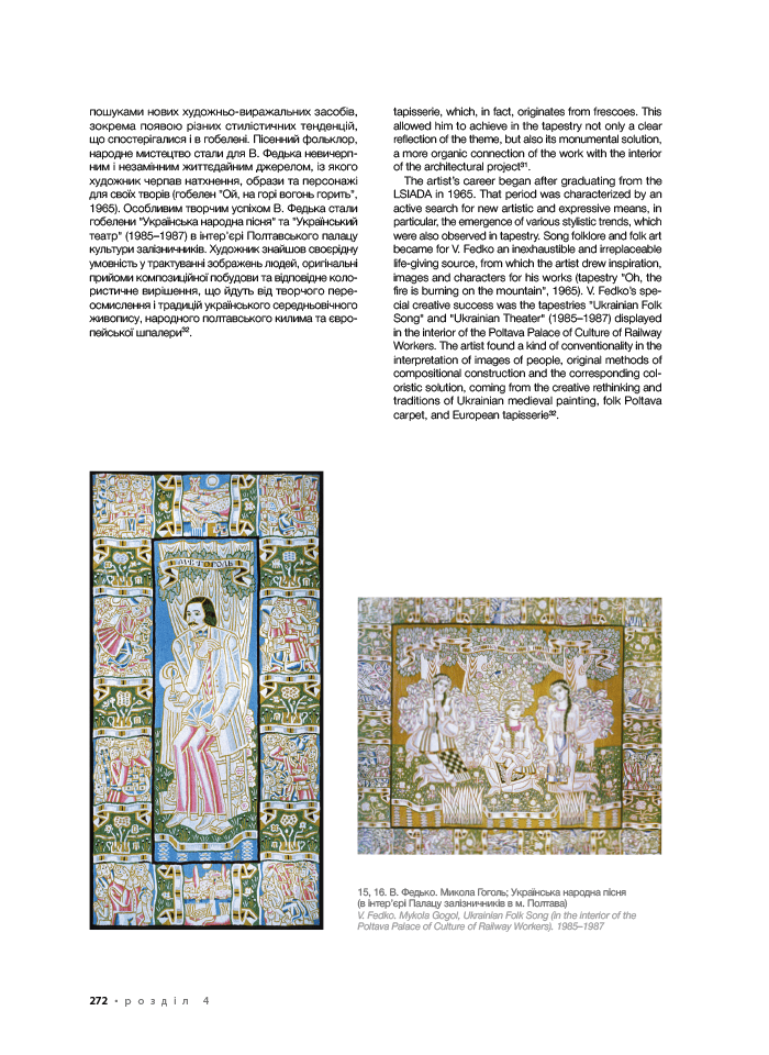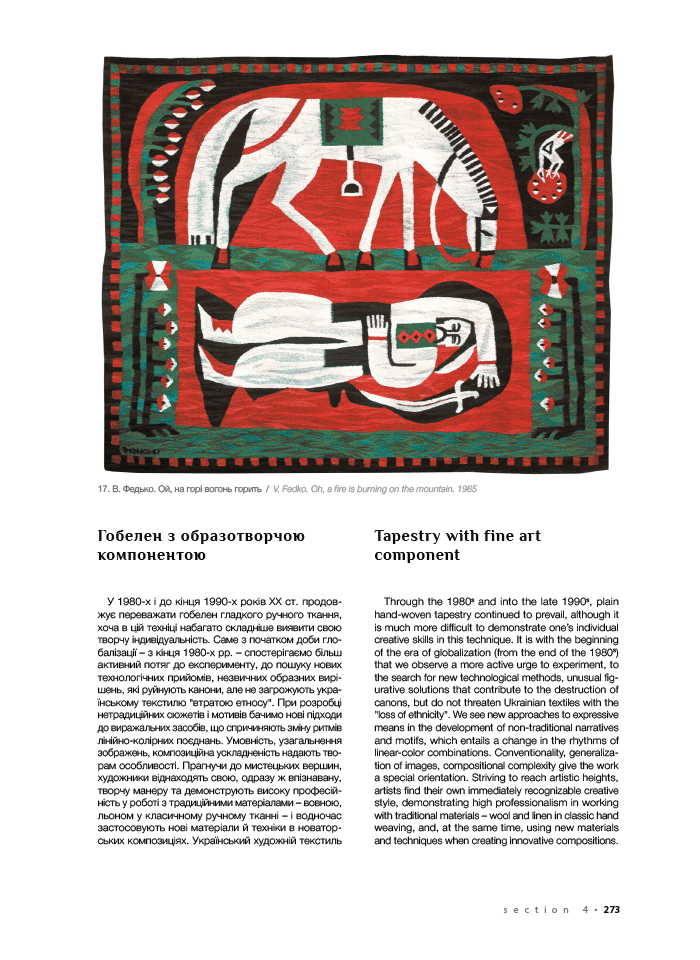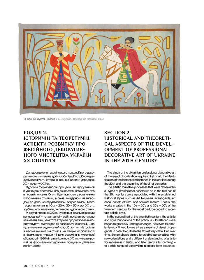 Книга пропонує аналіз широкого історико-культурного матеріалу, що дозволило авторці виявити та розкрити значні образно-пластичні й художньо-стильові трансформації в добу глобалізації в таких видах професійного декоративного мистецтва України як кераміка, скло, художня обробка дерева, гобелен, батик, нетрадиційний текстиль. Дослідниця вважає, що культурна глобалізація підштовхує українських митців декоративного мистецтва у їхній творчості до національної ідентифікації, спрямовує до пошуків архетипів своєї культури, стимулює до збереження національної самобутності. Тому входження українського професійного декоративного мистецтва на зламі ХХ-ХХІ ст. у світовий контекст не викликає небезпеки розчинення в ньому. Авторка переконливо доводить, що історично утворене, але осучаснене професійне декоративне мистецтво, яке спирається на багатовікові традиції унікальної культурної спадщини, є ґрунтом для поширення в суспільстві України доби глобалізації ознак національно-культурної ідентичності. Українсько-англійське видання розраховане на мистецтвознавців, істориків, музейників, а також широке коло шанувальників українського мистецтва та культури. Монографія може слугувати науковцям, викладачам, студентам мистецьких вишів джерелом для вивчення декоративного мистецтва України періоду ХХ–ХХІ ст.