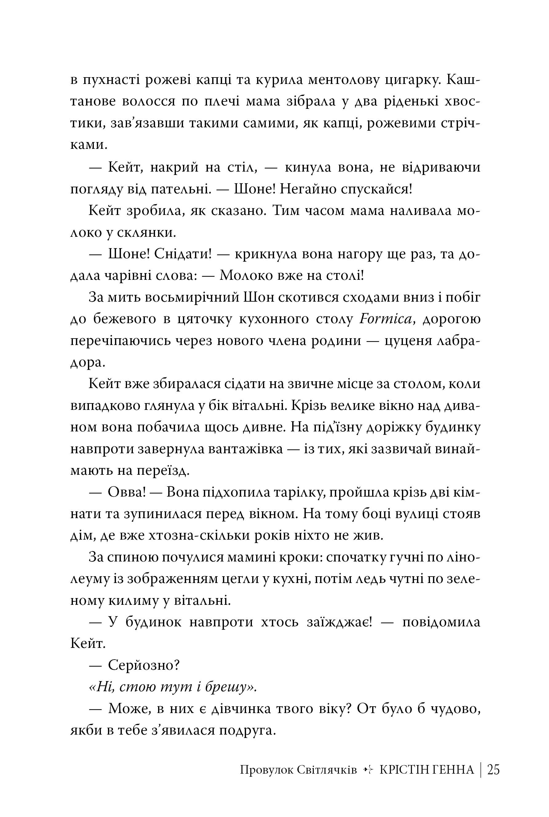 Від авторки бестселерів «Велика Глушина» та «Чотири вітри» — потужний роман про кохання, втрату й магію дружби… Вони зустрілися влітку 1974 року — Кейт Маларкі, така непоказна, що до восьмого класу втратила всіх подруг, і її нова сусідка Таллі Гарт — «найкрутіша дівчина у світі». Дві дівчинки, настільки різні, наскільки можуть бути різними дві людини. Але Кейт, сором’язлива й задумлива, має щось, конче потрібне яскравій та амбіційній Таллі, і щедро ділиться цим із нею. Вони обіцяють одна одній залишатися найліпшими подругами завжди й до кінця літа стають нерозлучними. Переживаючи зміни разом зі своїм поколінням — змінюючи зачіски, співаючи нових пісень, дивлячись інші серіали, діючи в різних соціальних і політичних обставинах, — Кейт і Таллі упродовж понад трьох десятиріч підтримують одна одну. Вони долають ревнощі, гнів, образи, нерозуміння, аж поки їхня дружба постає перед найгіршим випробуванням — зрадою. Чи зможе Таллі, яка зійшла на найвищий щабель слави, зрозуміти свою подругу-домогосподарку? Чи здатна Кейт переступити через власні упередження та біль? «Провулок Світлячків» — це більше ніж роман про дорослішання, це історія покоління жінок, які були одночасно благословенні та прокляті вибором. Це оповідь про обіцянки, таємниці та зради. І, зрештою, про єдину людину, яка по-справжньому знає вас і розуміє, що може завдати вам болю і може зцілити. «Провулок Світлячків» — це роман, який ви ніколи не забудете, який захочете передати своєму найліпшому другові.