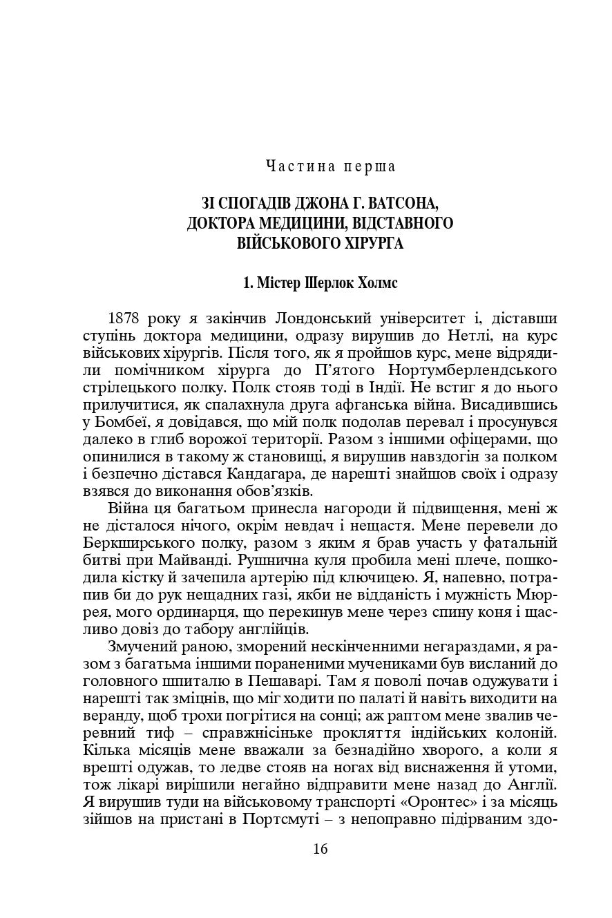 Понад століття тому ім'я «Шерлок Холмс» уперше з'явилося з-під пера автора - англійського письменника Артура Конан Дойля.Не одне покоління читачів усього світу зацікавлено стежить за дивовижними пригодами «самітника із Бейкер-стрит», спостережливого, кмітливого, здатного розплутати якнайхимернішу детективну загадку... Численні шанувальники Дойлевого таланту охоче відвідують Музей-квартиру Шерлока Холмса в Лондоні, надсилають на його адресу тисячі листів. Чим же так приваблює нас цей герой, створений фантазією письменника?Відповідь на це запитання дістане кожен, хто прочитає невмирущі детективні твори Артура Конан Дойля.Цей том - перший із чотиритомного видання, до якого увійшли в українському перекладі усі твори англійського класика про пригоди Шерлока Холмса.