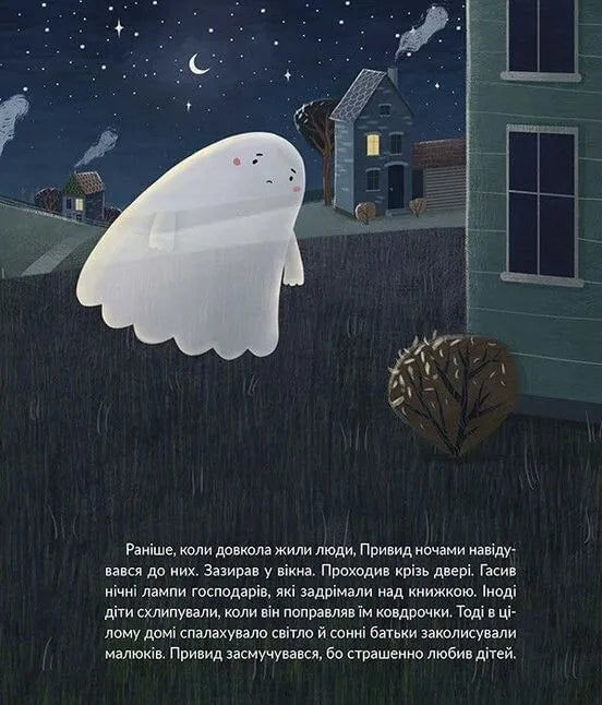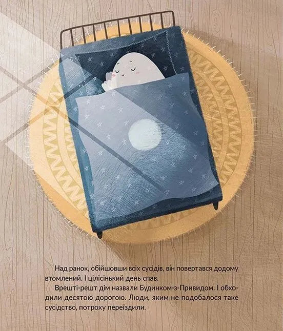 У покинутому будинку на околиці міста живе собі привид. Він страшенно самотній, оскільки довкола немає людей, яких можна було б навідати увечері. Загасити нічну лампу тому, хто заснув з книжкою, вкрити дитину ковдрочкою. А потім, повернувшись додому, солодко спати цілісінький день. Привид втратив сон, відколи усі його сусіди виселилися. Проте одного разу все змінюється. Адже в будинок-з-привидом переїздить молода сім’я з дівчинкою…