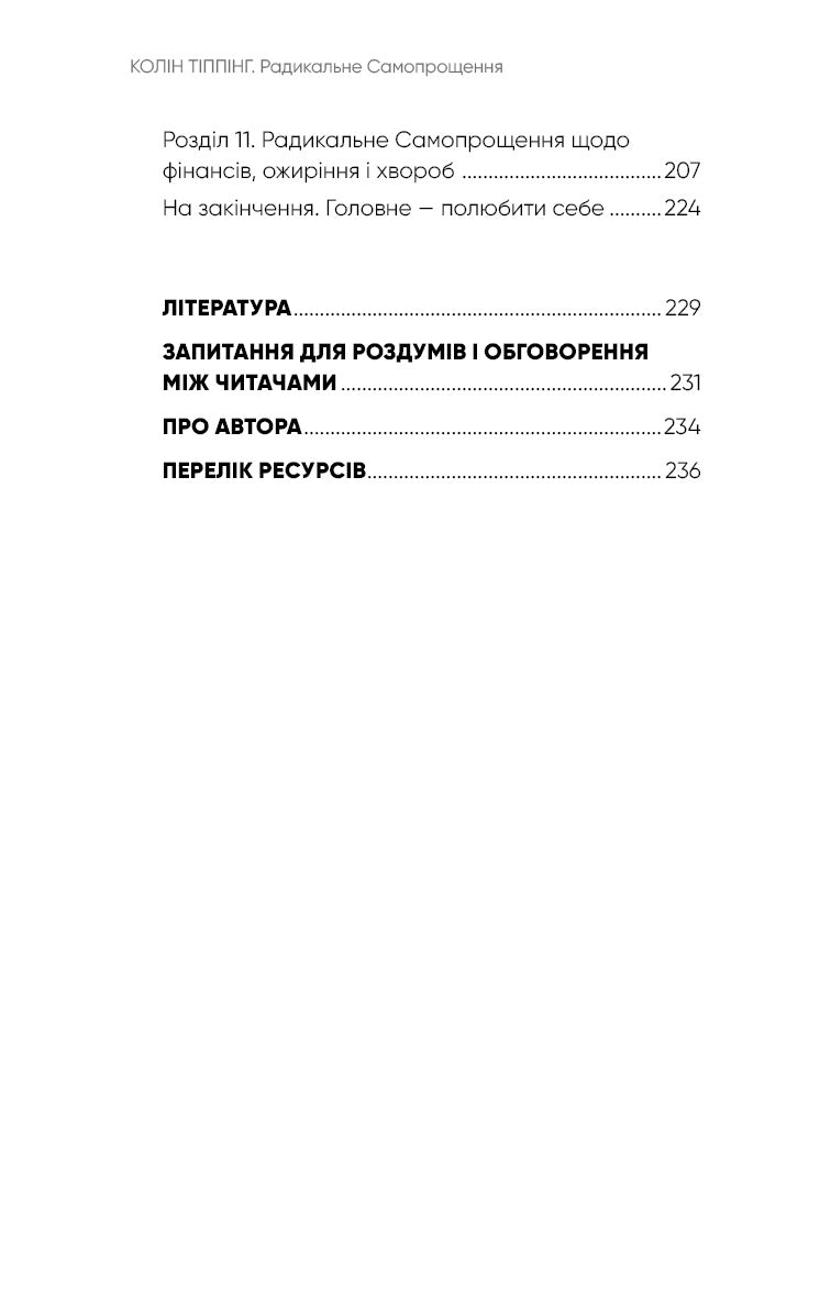 Кожен із нас має досвід самозвинувачення й нарікань на себе, на свої вчинки чи рішення. І кожен, напевно, знає, що себе пробачити значно складніше, ніж когось іншого, — цей процес вимагає розподілу ролей між «злочинцем» і «жертвою», а це практично неможливо зробити, коли ми займаємо обидві позиції одночасно. Часто це спричинює стан постійного стресу, а то й призводить до фізичного нездужання. Метод Радикального Прощення Коліна Тіппінга дає змогу виплутатися з цієї дилеми, звільнитися від надмірної внутрішньої критики й прийняти себе повністю. До цього вас найкоротшим шляхом проведе набір чітких інструментів і вправ, перевірених мільйонами читачів.