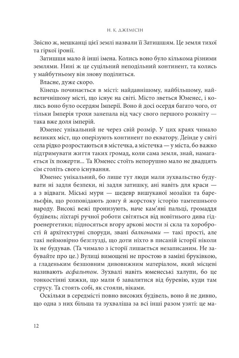 «П'ята пора» відкриває читачам світ Затишшя — багатостраждального континенту, що, за гіркою іронією, тисячоліттями не знає тиші та спокою, і де людство полишене на милість Батечка Землі. Обранці Землі — орогени, які володіють здатністю відчувати планету й переспрямовувати земну енергію, відвертаючи або спричиняючи лихо. Раз на кількасот років аномальна сейсмічна активність зумовлює смертельні захмарення й холод, що можуть тривати роками, і які прадавня наука, викарбувана в камені, іменує П'ятою порою. І найдовша Пора, яку знала ця земля, от-от розпочнеться; так настає кінець світу. Але, крім планетарного кінця світу, є й особистий — кінець світу настає для Ессун, жінки з містечка Тіримо. Кінець світу — тільки початок; попереду ще багато болю і страждань, зрад і несправедливості, жару й попелу. Назустріч цьому, щоби повернути втрачене, помститися кривдникам та — хай як неймовірно — вибороти своє місце в цьому жорстокому світі, й вирушить Ессун. А з нею — і ви.