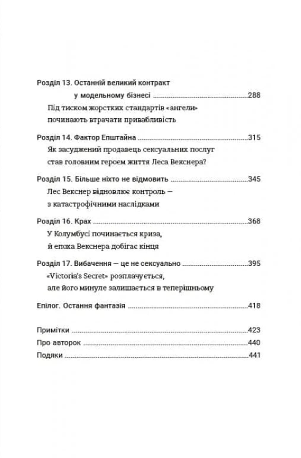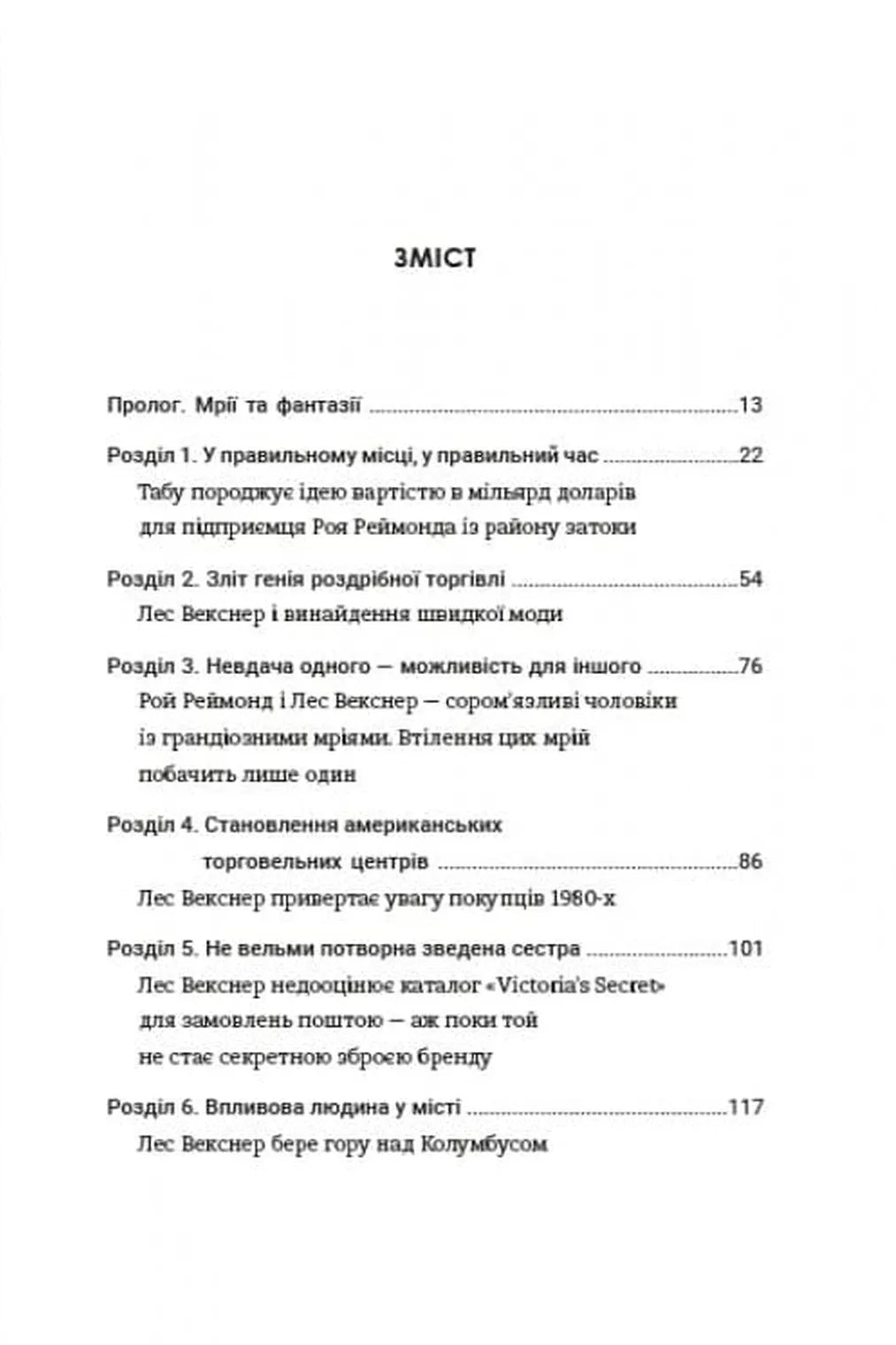 Захоплива, пізнавальна й майже документальна історія кількох десятиліть розвитку моди й бізнесу, еволюції ідеалу краси і сприйняття сексуальності, трансформації торгівлі, становлення модельного бізнесу і безпрецедентного піару — все це про легендарний бренд «Victoria’s Secret», з яким росли покоління жінок і який є прикладом одного із найуспішніших бізнесів.Як зародилась ідея бренду і творилася легенда про Вікторію, якими були її таємниці, злети на ангельських крилах і падіння. Книжка про один із найуспішніших і найвідоміших брендів розкриває не лише бізнесову історіюй залаштунки «Victoria’s Secret», а й дає безліч ідей, як розвивати бренд інноваційно, вгадувати тренди майбутнього й самим визначати їх, плисти у морі бізнесу не лише за часом, а на гребені хвилі.
