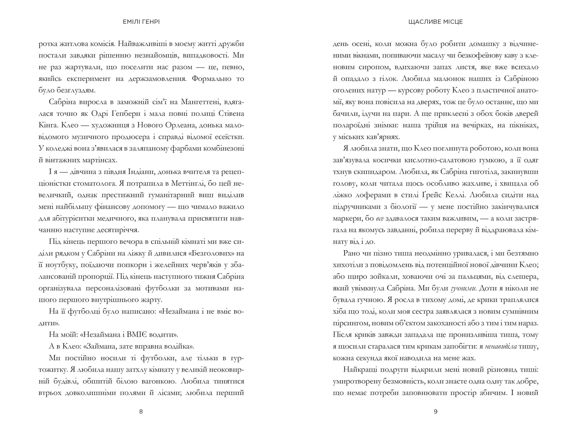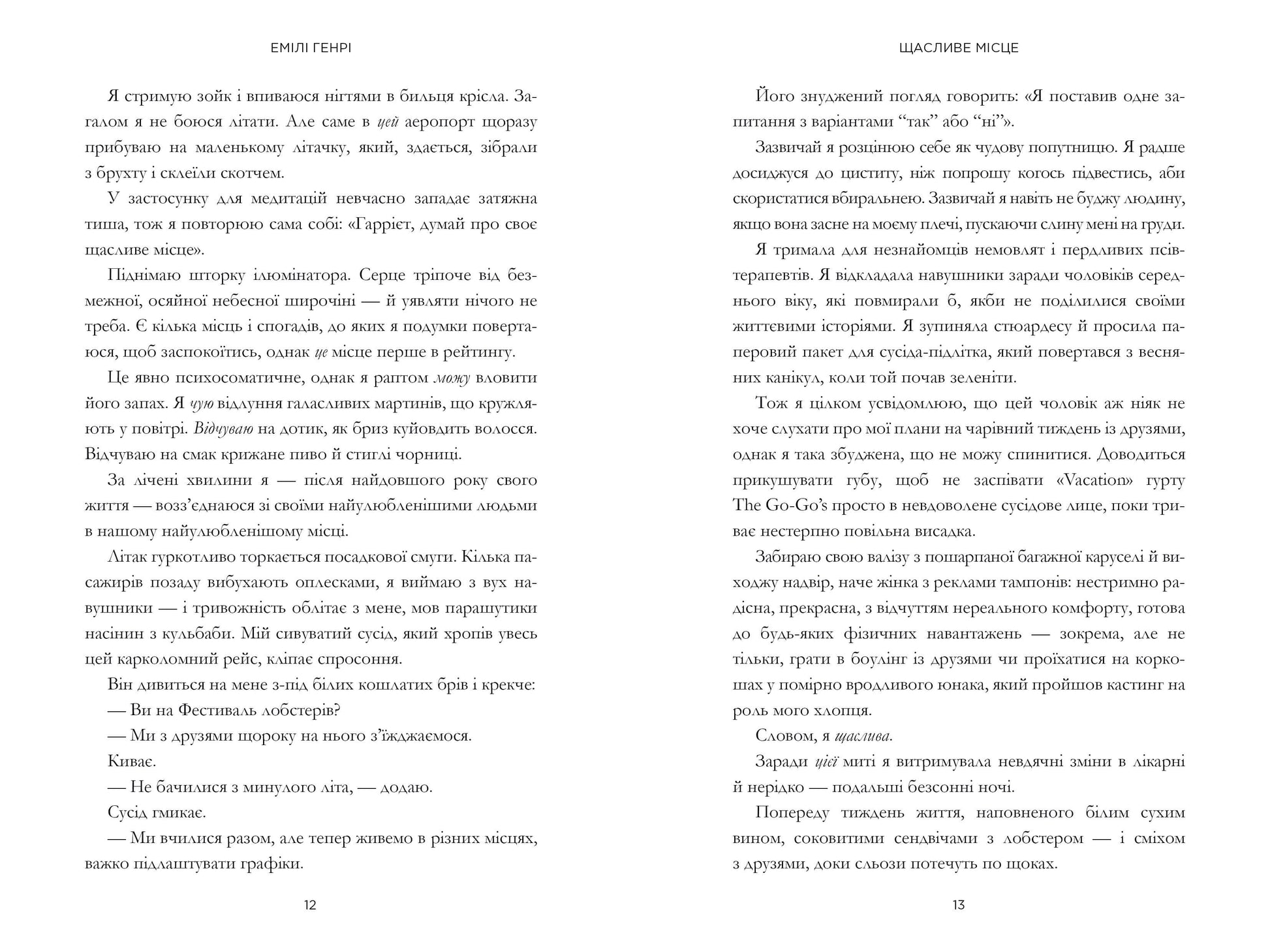 Подумайте про своє щасливе місце… Гаррієт і Вейн познайомились у коледжі й упродовж років були ідеальною парою. Однак ситуація змінилася — з причин, яких вони не обговорюють. П’ять місяців тому вони розійшлися… І досі не розповіли про це навіть найближчим людям. Так і виходить, що Гаррієт із Вейном опиняються в одній спальні котеджу, де їхня компанія відпочиває щоліта ось уже десять років. Не розбивати ж серця найкращим друзям у спільному найулюбленішому місці на Землі! Краще тиждень повдавати з себе закоханих перед людьми, які знають вас як ніхто. Здається, план бездоганний (особливо якщо дивитися крізь темні окуляри, заляпані сонцезахисним кремом)… Чи ні? Попередження: книжка містить відвертий опис сцен сексуального характеру.
