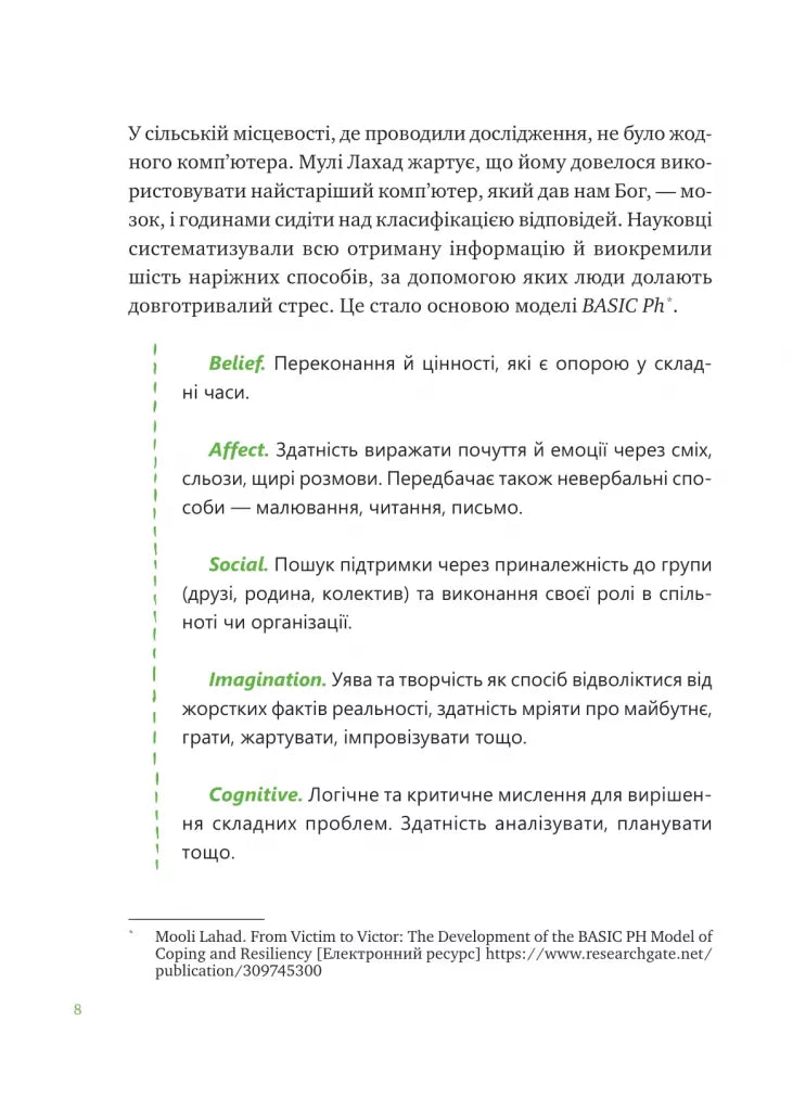 Журналіст Марк Лівін і психологиня Софія Терлез об’єднали досвід, дружбу і сотні годин розмов із найвпливовішими дослідниками психології та нейронауки, щоб створити інструмент турботи про себе у часи потрясінь. Адаптована до українських реалій модель пояснює, як саме ми можемо підтримувати себе під час довготривалого стресу, і спирається на 11 елементів стійкості: тіло, емоції, звички, їжа, цінності, відповідальність, корисне мислення, креативність, соціальні зв’язки, дружба, любов. Кожному з них присвячено розділ, який доповнено практичними вправами для самодопомоги. Це не чергова книжка з порадами на кшталт «будь кращою версією себе», а інтимна, щира й структурована розмова, яка дозволяє зупинитися, побачити себе у складних обставинах і відповісти на головне запитання: «Що саме зараз мені допоможе?».