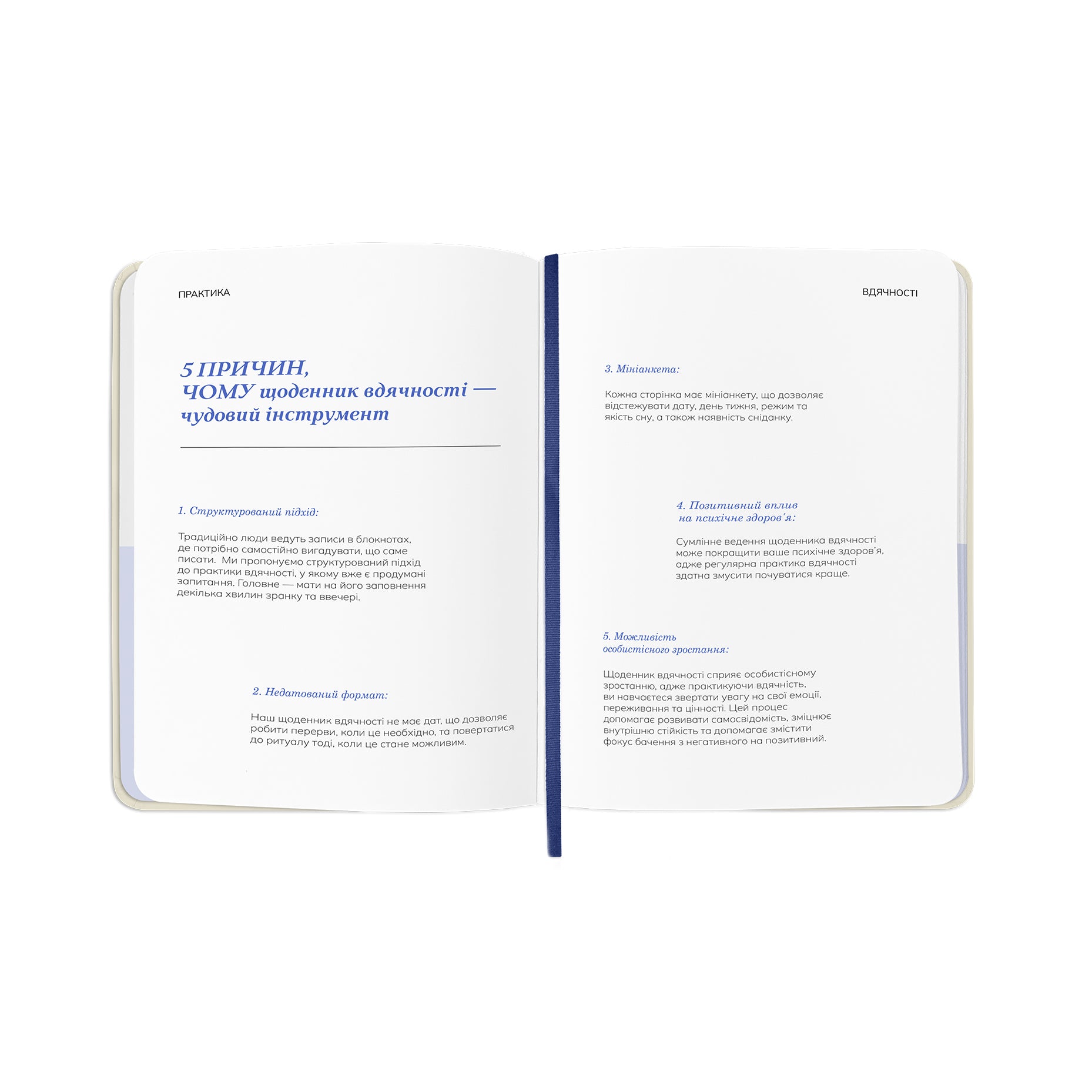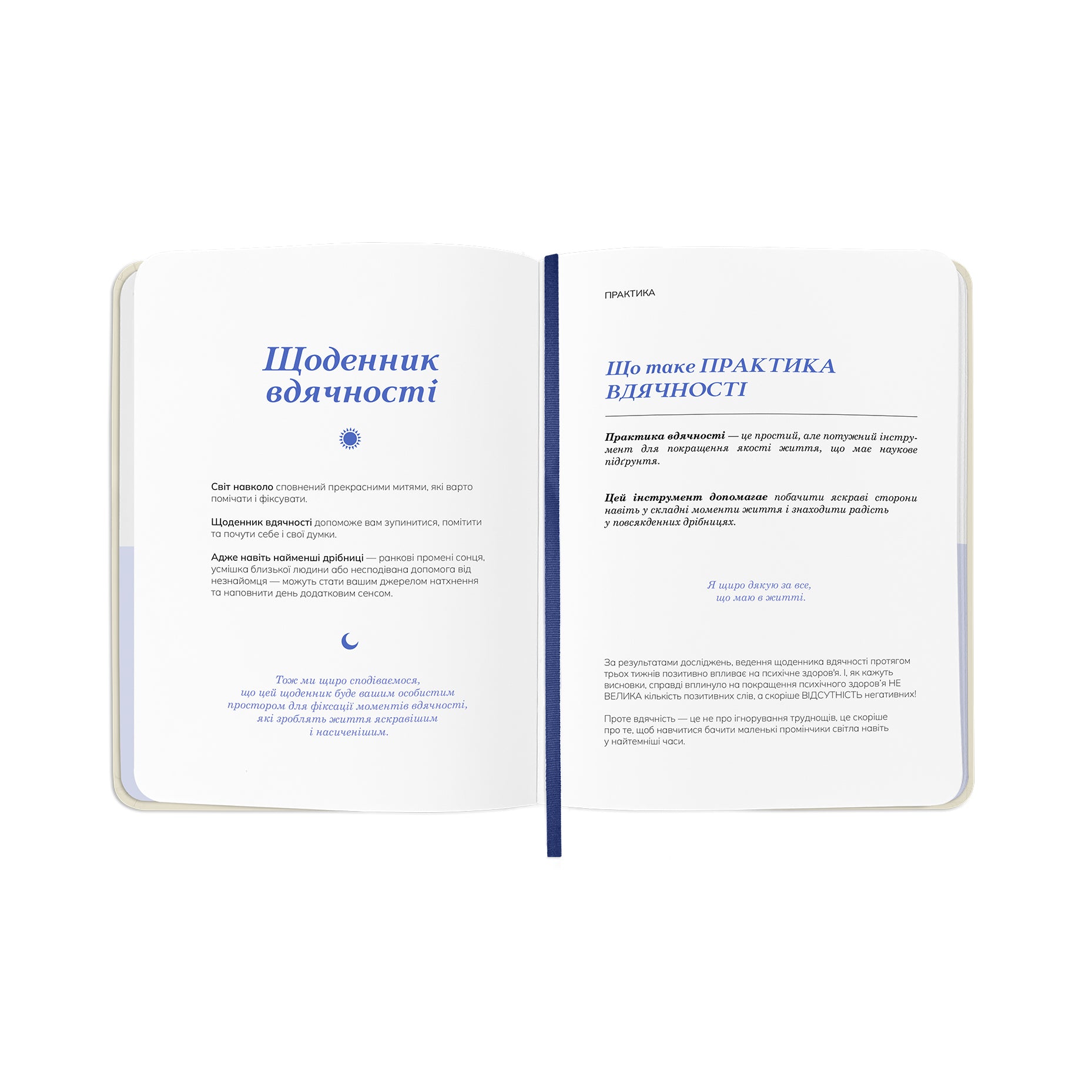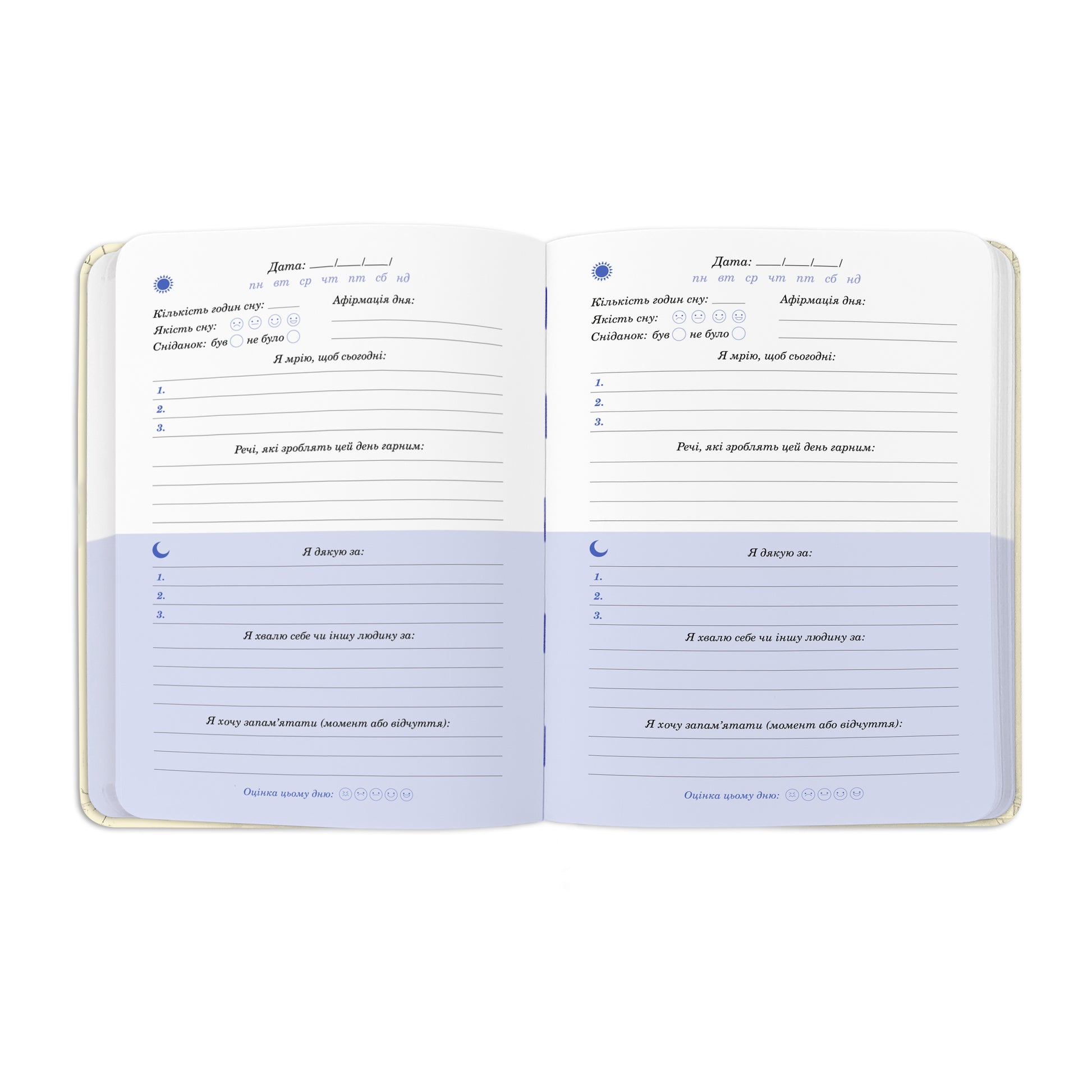 Обкладинка з матовою ламінацією Щоденник вдячності допомагає помічати світлі моменти навіть у темні часи. Усередині — два блоки: ранковий і вечірній. Ранковий допомагає м’яко почати день: зафіксувати якість та кількість сну, оцінити самопочуття, сформулювати афірмацію, мрію та маленькі приємні плани на день. Вечірній — підтримає у важливій звичці помічати хороше та допоможе підсумувати день. Тут можна подякувати за щось, похвалити себе або іншу людину, зберегти пам’ять про теплий момент дня, а також оцінити день загалом.