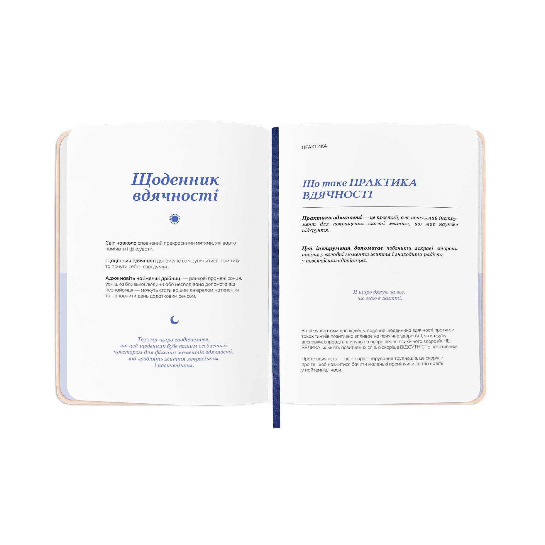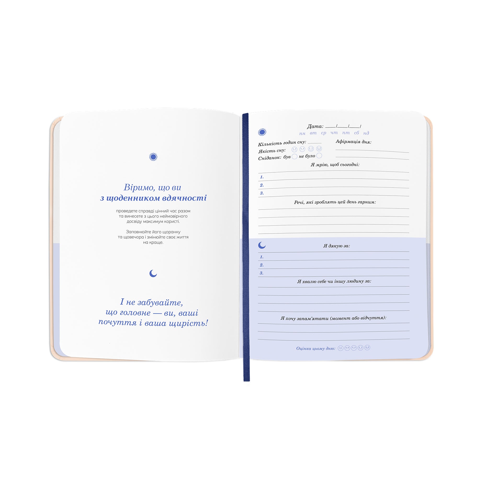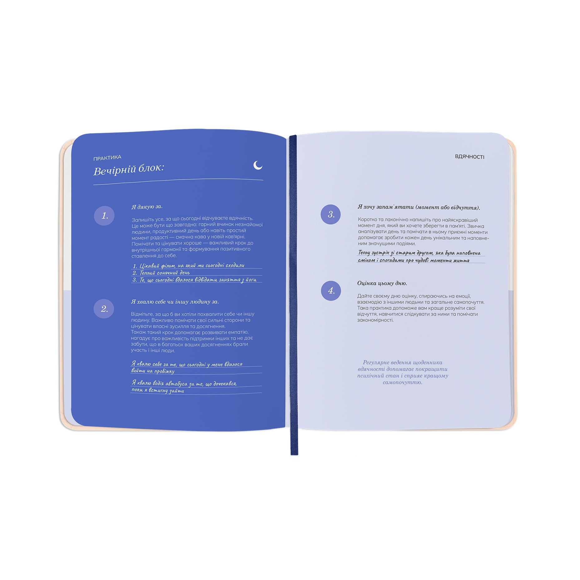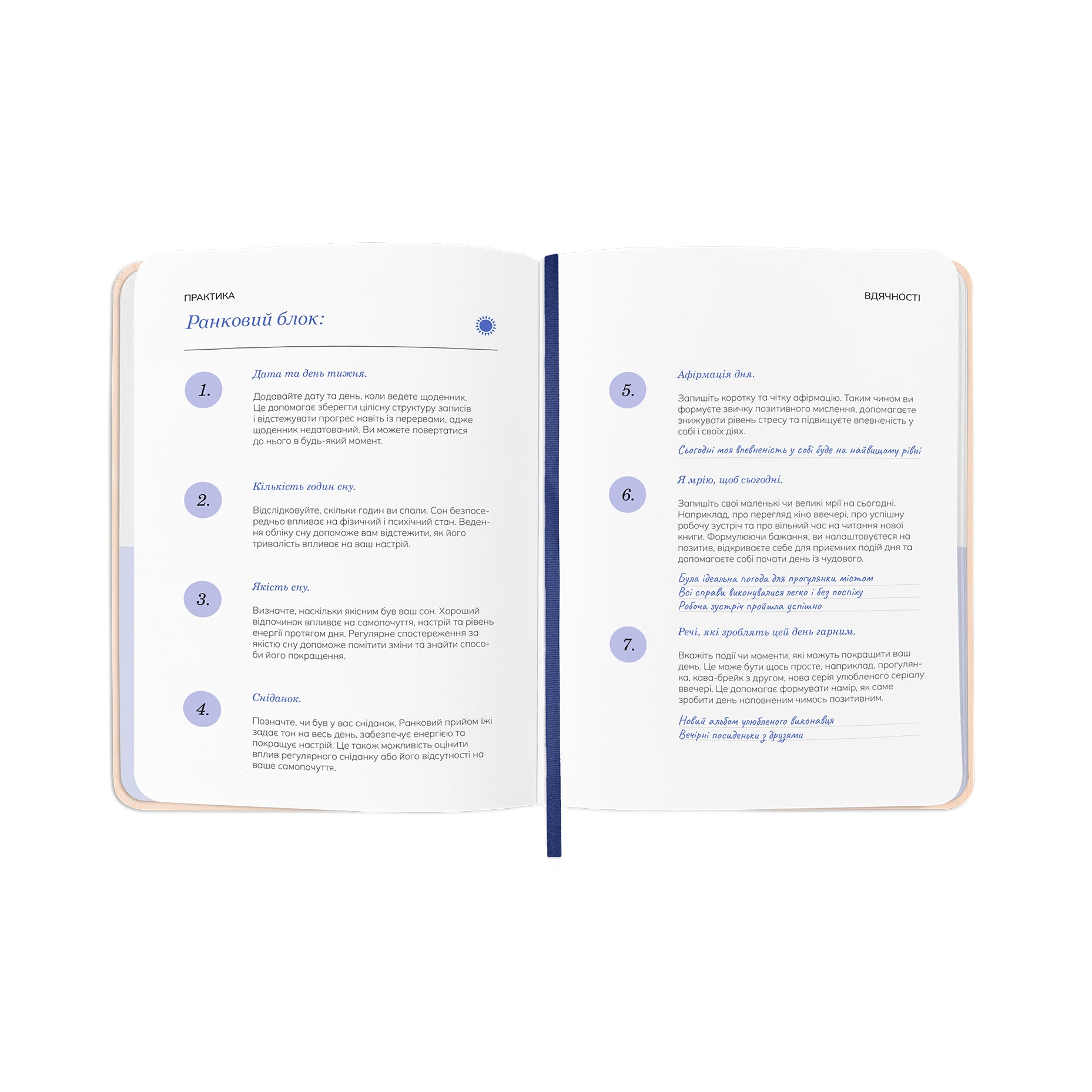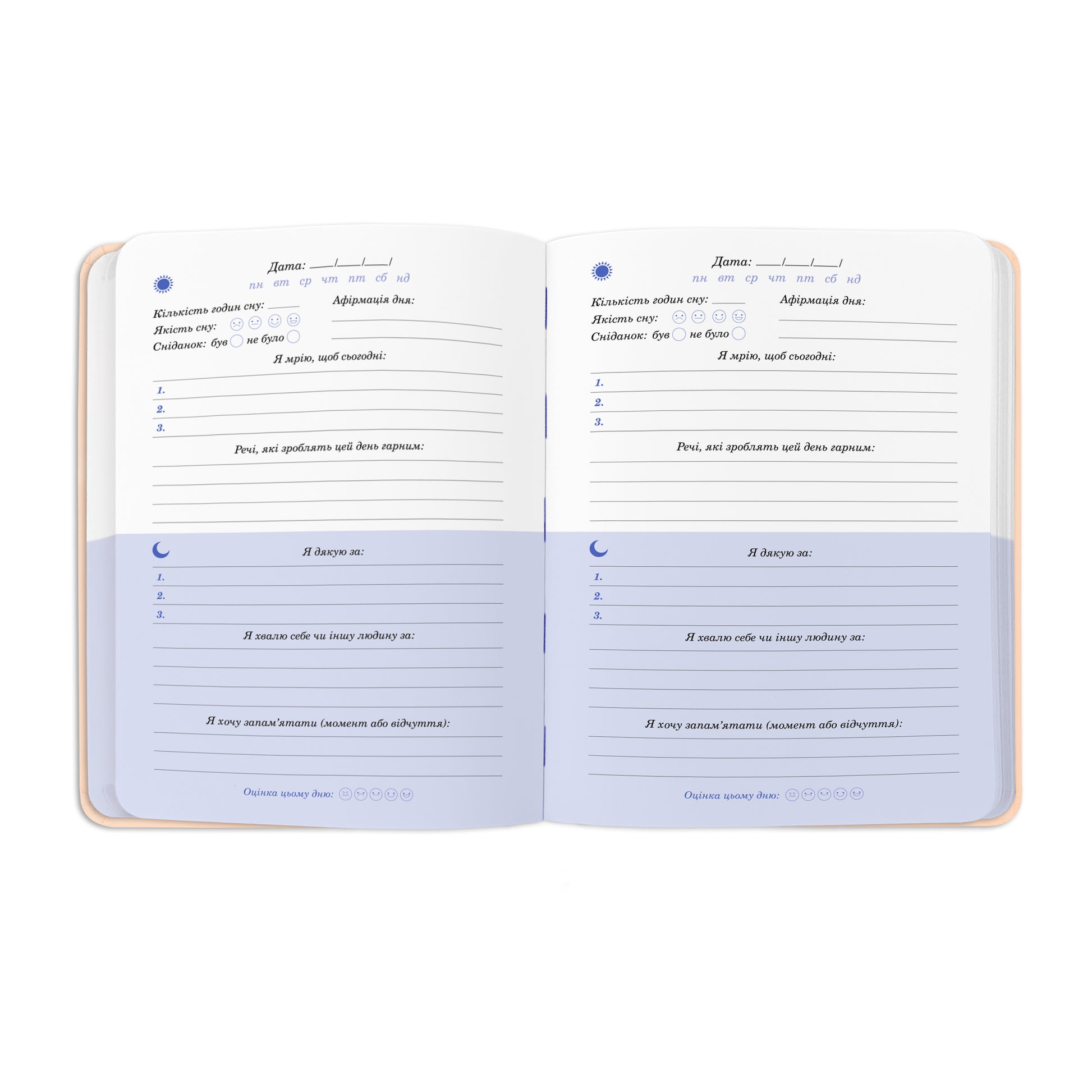 Щоденник вдячності допомагає помічати світлі моменти навіть у темні часи. Усередині — два блоки: ранковий і вечірній. Ранковий допомагає м’яко почати день: зафіксувати якість та кількість сну, оцінити самопочуття, сформулювати афірмацію, мрію та маленькі приємні плани на день. Вечірній — підтримає у важливій звичці помічати хороше та допоможе підсумувати день. Тут можна подякувати за щось, похвалити себе або іншу людину, зберегти пам’ять про теплий момент дня, а також оцінити день загалом.