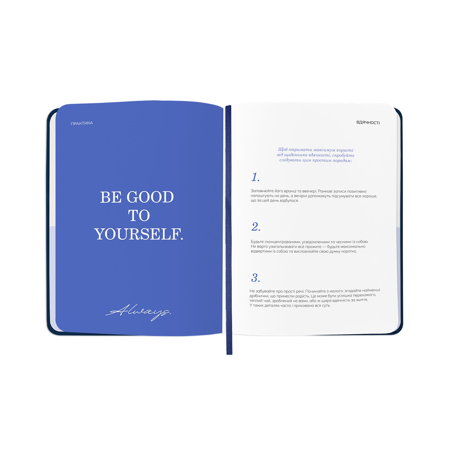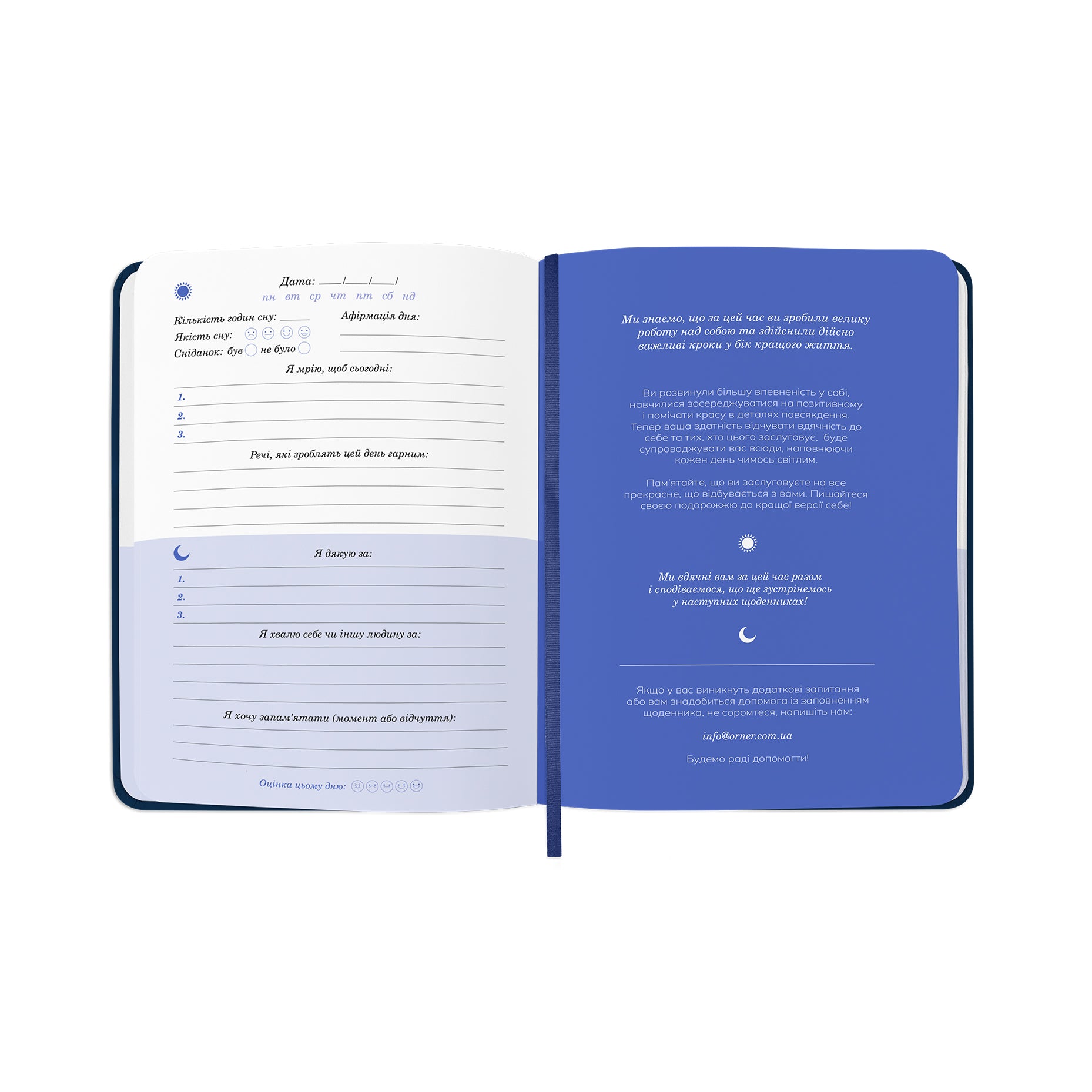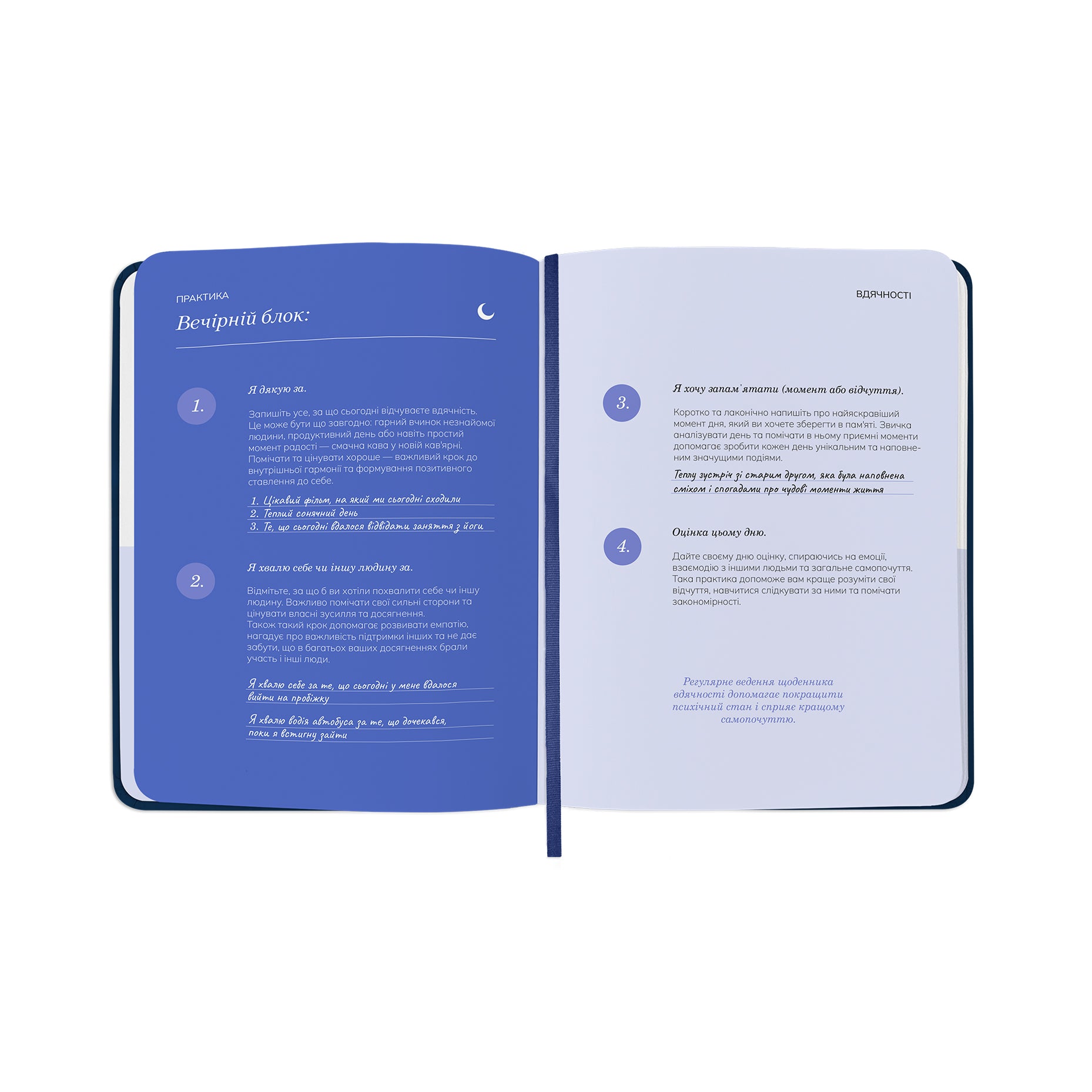 Щоденник вдячності допомагає помічати світлі моменти навіть у темні часи. Усередині — два блоки: ранковий і вечірній. Ранковий допомагає м’яко почати день: зафіксувати якість та кількість сну, оцінити самопочуття, сформулювати афірмацію, мрію та маленькі приємні плани на день. Вечірній — підтримає у важливій звичці помічати хороше та допоможе підсумувати день. Тут можна подякувати за щось, похвалити себе або іншу людину, зберегти пам’ять про теплий момент дня, а також оцінити день загалом.