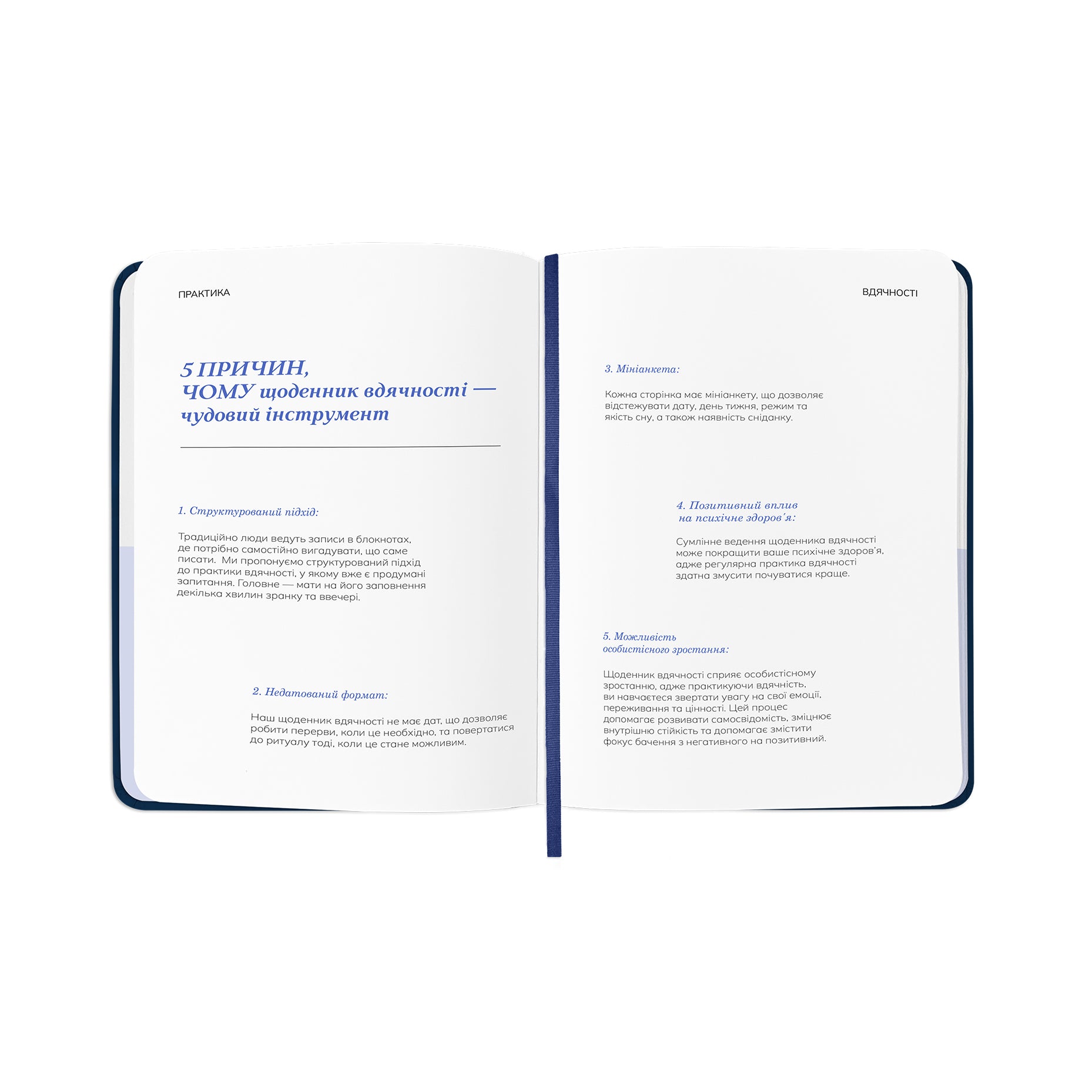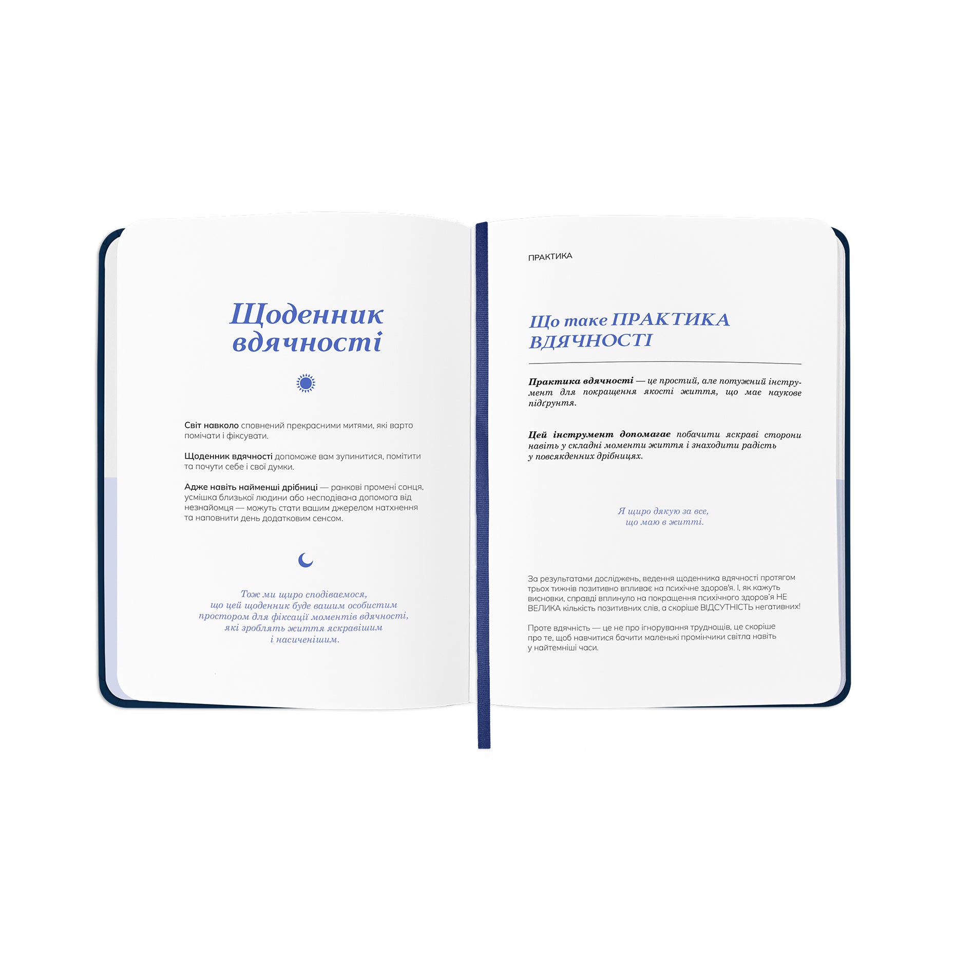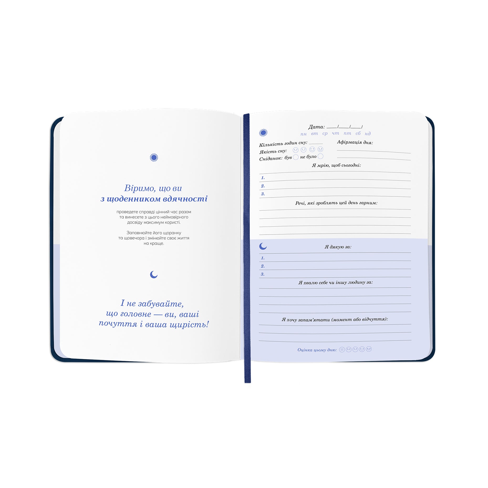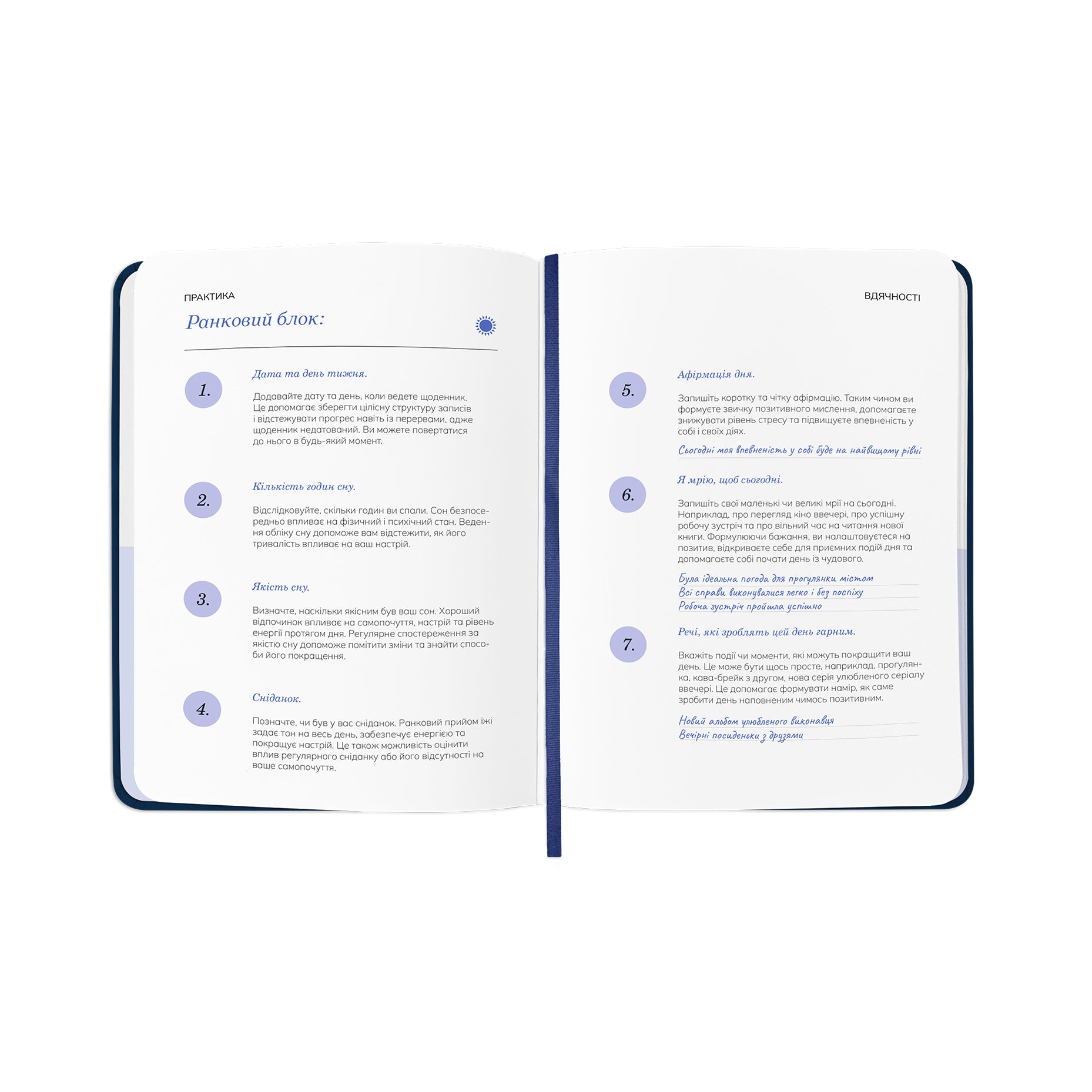 Щоденник вдячності допомагає помічати світлі моменти навіть у темні часи. Усередині — два блоки: ранковий і вечірній. Ранковий допомагає м’яко почати день: зафіксувати якість та кількість сну, оцінити самопочуття, сформулювати афірмацію, мрію та маленькі приємні плани на день. Вечірній — підтримає у важливій звичці помічати хороше та допоможе підсумувати день. Тут можна подякувати за щось, похвалити себе або іншу людину, зберегти пам’ять про теплий момент дня, а також оцінити день загалом.