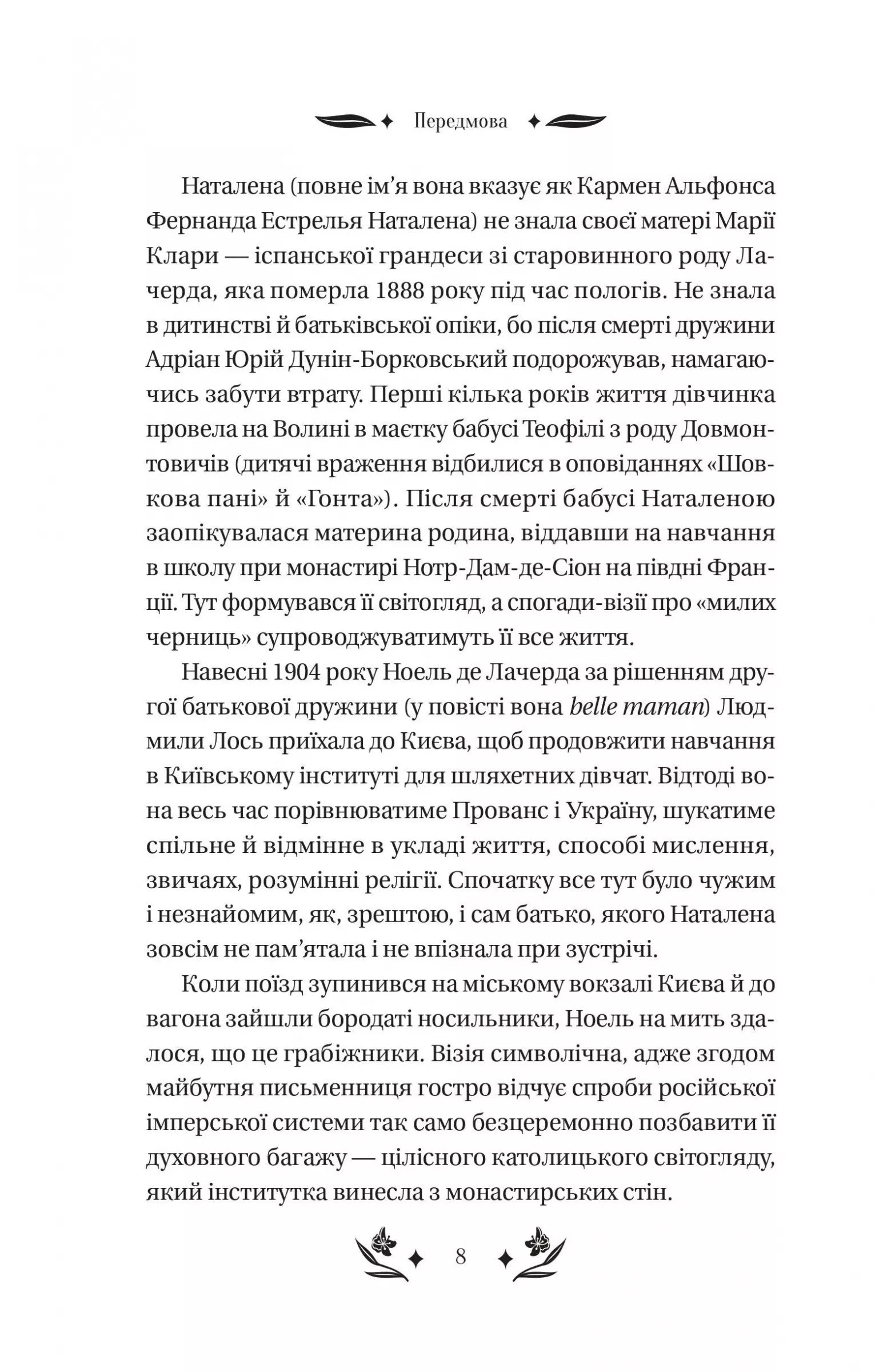 Ім’я Наталени Королевої оповито легендами й загадками. Письменниця не залишила нам жодних документів — лише неймовірну автобіографію та художні твори, які називала «життєписом». До таких належить і «Без коріння» — повість із життя вихованок Київського інституту шляхетних дівчат. Головна героїня, чужинка, уважно придивляється до всього довкола неї і вловлює те, що ховається від інших. У цьому екзотичному коктейлі є і роман виховання, і тонкий психологізм, і київські реалії початку ХХ століття, і ностальгія за юністю. Спробуйте скуштувати і визначити, скільки серед його інгредієнтів правди й легенди, — ось вам загадка, яку залишила Королева. Книга «Шовкова пані» — це збірка припорошеної містикою автобіографічної короткої прози Наталени Королевої. Твори класичної української літератури занурюють читача у світ, де реальність переплітається з уявним, а життя і смерть стають нероздільними супутниками. Письменниця майстерно вводить елементи тонкого психологізму та європейської художньої традиції до своїх напрацювань, чим створює унікальний простір, де панують загадковість і таємничість. У книзі «Шовкова пані» Наталена Королева веде читача похмурими коридорами, в них чується шелест шовкових суконь і зустрічаються тіні минулого. Головна героїня, неначе слідчий в пошуках відповідей, блукає між примарними спогадами та реальністю. Її спостережливість та вразливість до навколишнього світу дозволяють спіймати тонкі межі між буттям і небуттям, що відбиваються у її спілкуванні із загадковими персоналіями.