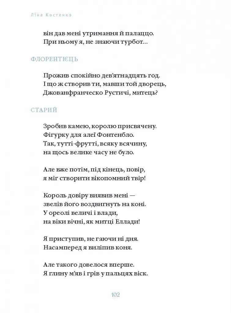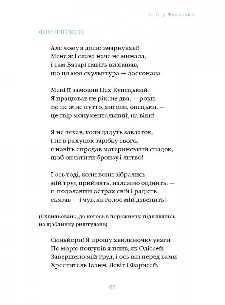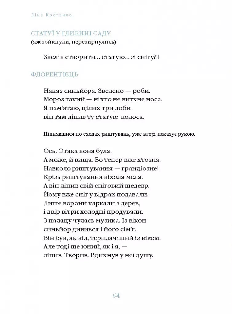Видатний, але напівзабутий скульптор італійського Відродження Джованфранческо Рустичі був заново відкритий в Італії 2010 року. Однак Ліна Костенко звернула на нього свій погляд на чверть століття раніше — в середині 1980-х. У поетичному шедеврі «Сніг у Флоренції» сплітаються філософія мистецтва і пронизлива любов, психоаналіз і бурхливі події в Європі ХVІ століття.Вишукано і фантазійно побачена в драматичній поемі ренесансна Флоренція стає глибоко актуальною метафорою свободи митця, а відтак його здатності творити непідвладний часові «сад нетанучих скульптур».