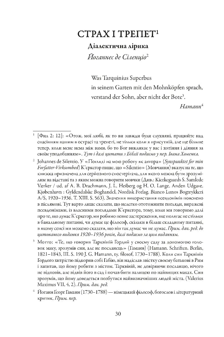 Уперше українському читачеві запропоновано переклад шедевра світового значення, одного з ключових творів відомого данського філософа Сьорена К’єркеґора «Страх і трепет», опублікований 1843 року під псевдонімом Йоганнес де Сіленціо. У творі мислитель всебічно інтерпретує жертвопринесення Ісаака, яке здійснив його батько Авраам, і на тлі цього біблійного сюжету порушує ґрунтовні проблеми моральної філософії та богослов’я, зокрема проблематику Бога й віри, етики й моралі, пристрасне ставлення до віри «Лицаря віри» на противагу «Лицареві нескінченності». Порушено проблему існування абсолютного обов’язку перед Богом, неспівмірної вищості внутрішнього світу людини за зовнішній світ, вказуючи на відносний характер етики та помилки модерної геґельянської філософії. Без абсолютного обов’язку перед Творцем не існуватиме й віри, а вибір Авраама сприйматиметься як злочин. Незамінний путівник духовними маршрутами релігії та філософії, адресований поціновувачам мудрості.