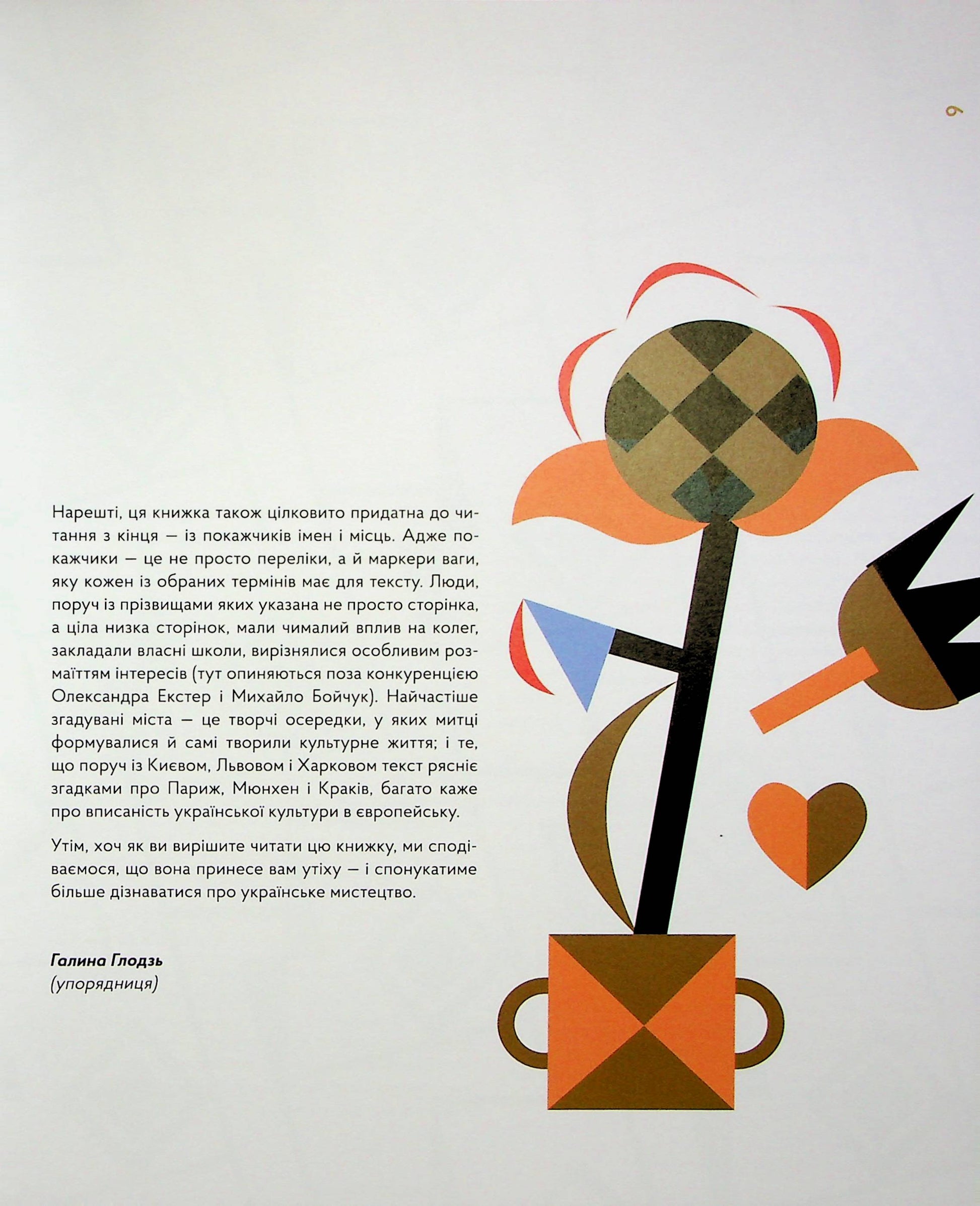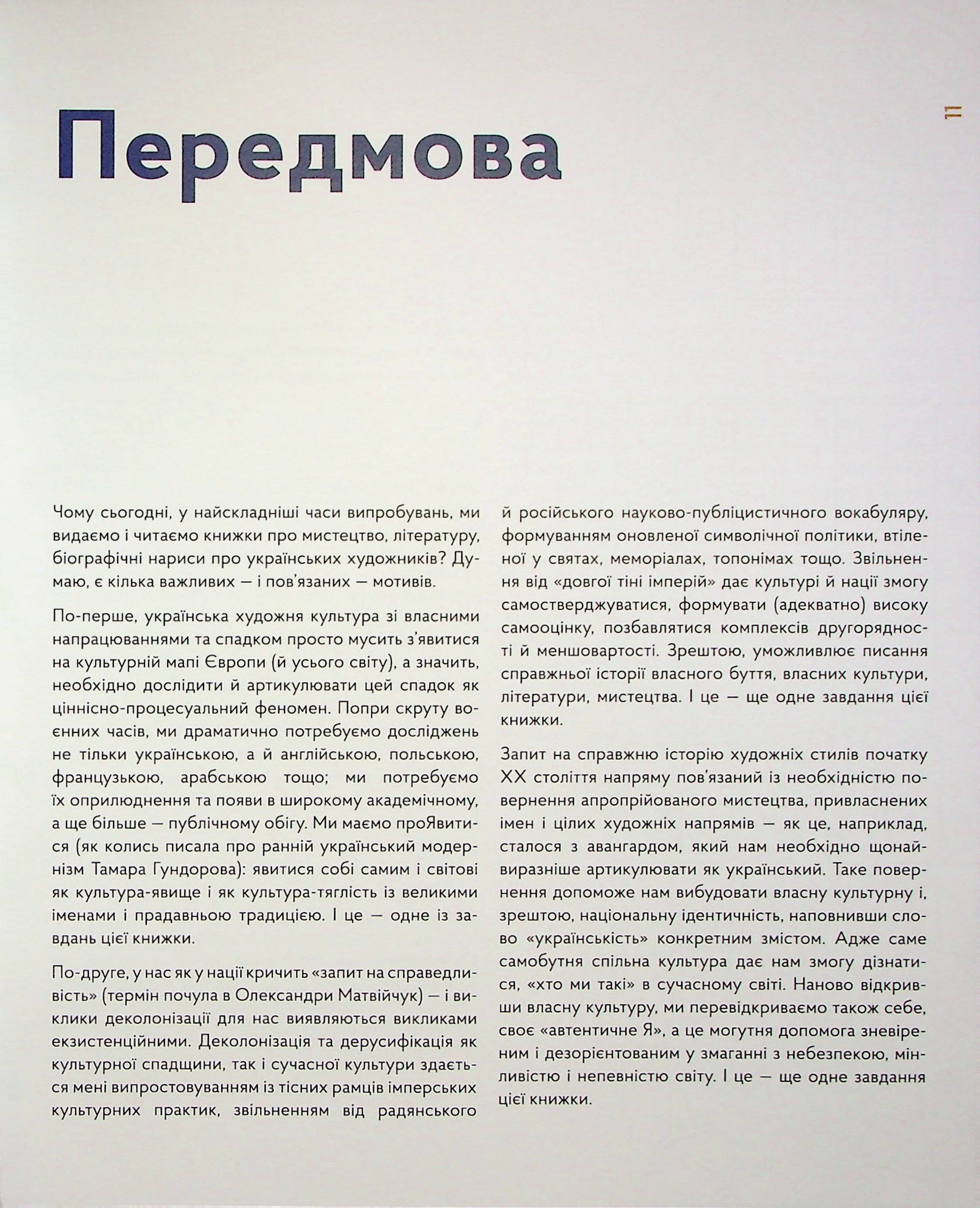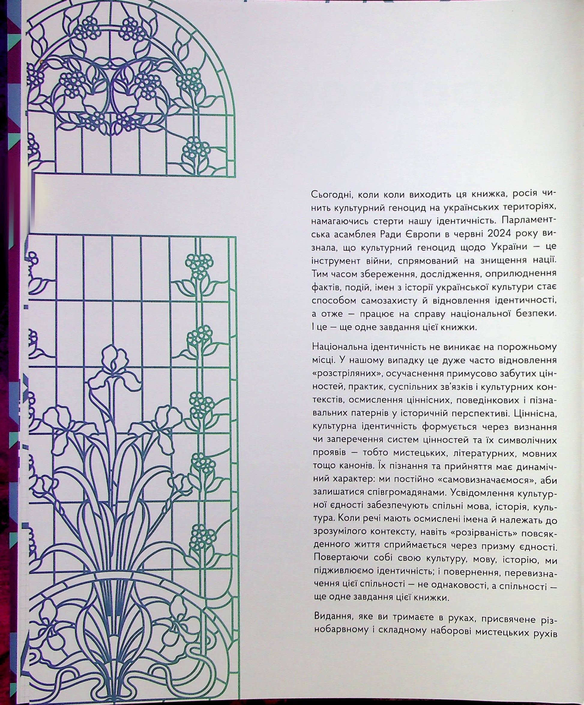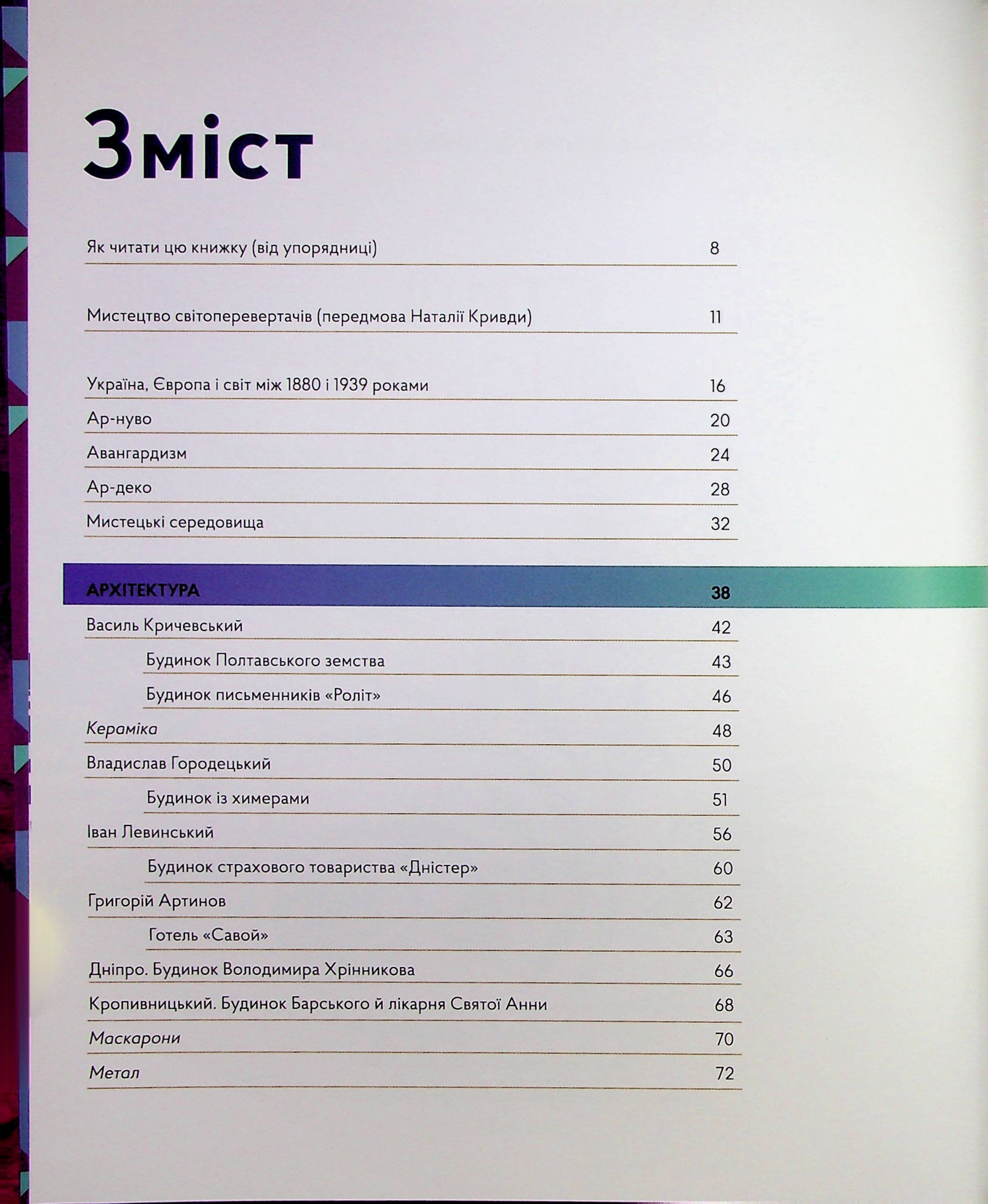 Проєкт «Стилі українського мистецтва» — це розповідь про український модернізм, завдяки якій читач може скласти цілісне враження про мистецьке середовище першої половини ХХ століття. Книжка розглядає три стилі, що домінували в мистецтві початку ХХ століття, у їхній органічній тяглості і взаємодії. Текст не просто вказує на особливості кожного стилю чи розповідає про митців, які в ньому працювали. Зіставлення на сусідніх сторінках різних явищ — наприклад, залізничних вокзалів, збудованих у стилях ар-нуво й ар-деко, чи сецесійного і футуристського пейзажів — забезпечує краще сприйняття властивих кожному стилю рис і дає змогу помітити в них те спільне, що притаманне саме українському модернізму. Автори прагнуть не просто зацікавити читачів українським модернізмом, а й спонукати до локального туризму, тому в тексті звернуто увагу на роботи з українських музеїв, запропоновано мапу пам’яток, наголошено на зв’язках персоналій і явищ із місцевостями тощо. Ілюстроване видання для широкого кола читачів.