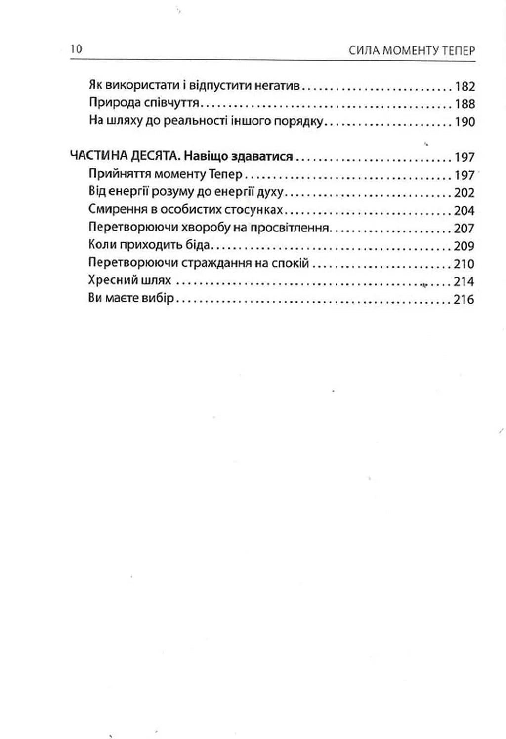 Усі наші емоційні страждання, проблеми та біль породжуються егоцентричним розумом, який міцно тримається за хибне уявлення. Звільнитися від цього внутрішнього полону можна лише через повну присутність у теперішньому моменті єдиній істинній реальності, яку ми часто не помічаємо. Саме в цій миті ми відкриваємо свою справжню сутність, відчуваємо радість і усвідомлюємо, що цілісність і досконалість це не щось далеке й недосяжне, а стан, доступний нам тут і зараз.«Сила моменту Тепер» Екгарта Толле відкриває читачам двері до глибокого розуміння справжнього моменту. У своїй праці автор пояснює, як надмірна зосередженість на минулому та майбутньому стає причиною стресу, тривоги та нещастя. Він закликає до повного занурення у теперішній момент, адже саме він є джерелом справжнього внутрішнього миру.Книга «Сила моменту Тепер» - це справжній путівник для тих, хто шукає шлях до внутрішнього пробудження та гармонії з собою, автор пропонує практичні поради та духовні вправи, що допоможуть відчути значущість кожної миті життя та знайти глибокий сенс у найпростішому.Мотиваційно-психологічне видання «Сила моменту Тепер» стало світовим бестселером та надихнуло мільйони людей змінити своє ставлення до життя, навчитися відпускати негативні думки та знайти щастя в теперішньому моменті. Ця книга - незамінний інструмент для тих, хто прагне жити усвідомлено, в гармонії з собою та світом.