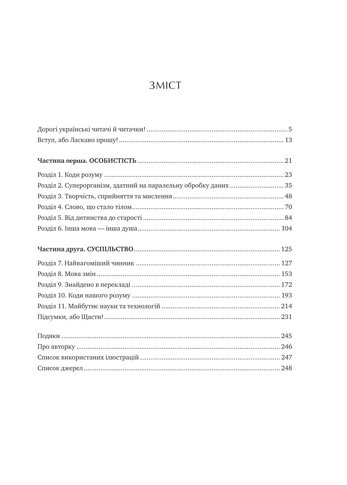 Ми живемо у світі кодів. Поезія, музика, математика, англійська, мова жестів — окремі мовні коди, що гармонійно поєднуються в нашому мозку. І що більше таких кодів ми маємо, то легше нам діставати й інтерпретувати інформацію, генерувати нові ідеї, будувати кар’єру, прискорювати радикальний прогрес. Тому що ці коди визначають, як ми сприймаємо себе й інших, навколишній світ, як розв’язуємо проблеми, на що звертаємо увагу, що пам’ятаємо. Авторка цієї книжки розглядає мову не просто як засіб спілкування та обміну інформацією, а як інструмент, який поліпшує наше життя і стан здоров’я, розвиває когнітивні здібності. Адже науково доведено: знання кількох мов відтерміновує розвиток хвороби Альцгеймера щонайменше на чотири-шість років, розвиває критичне мислення і суттєво збільшує шанси на успіх в усіх сферах життя.