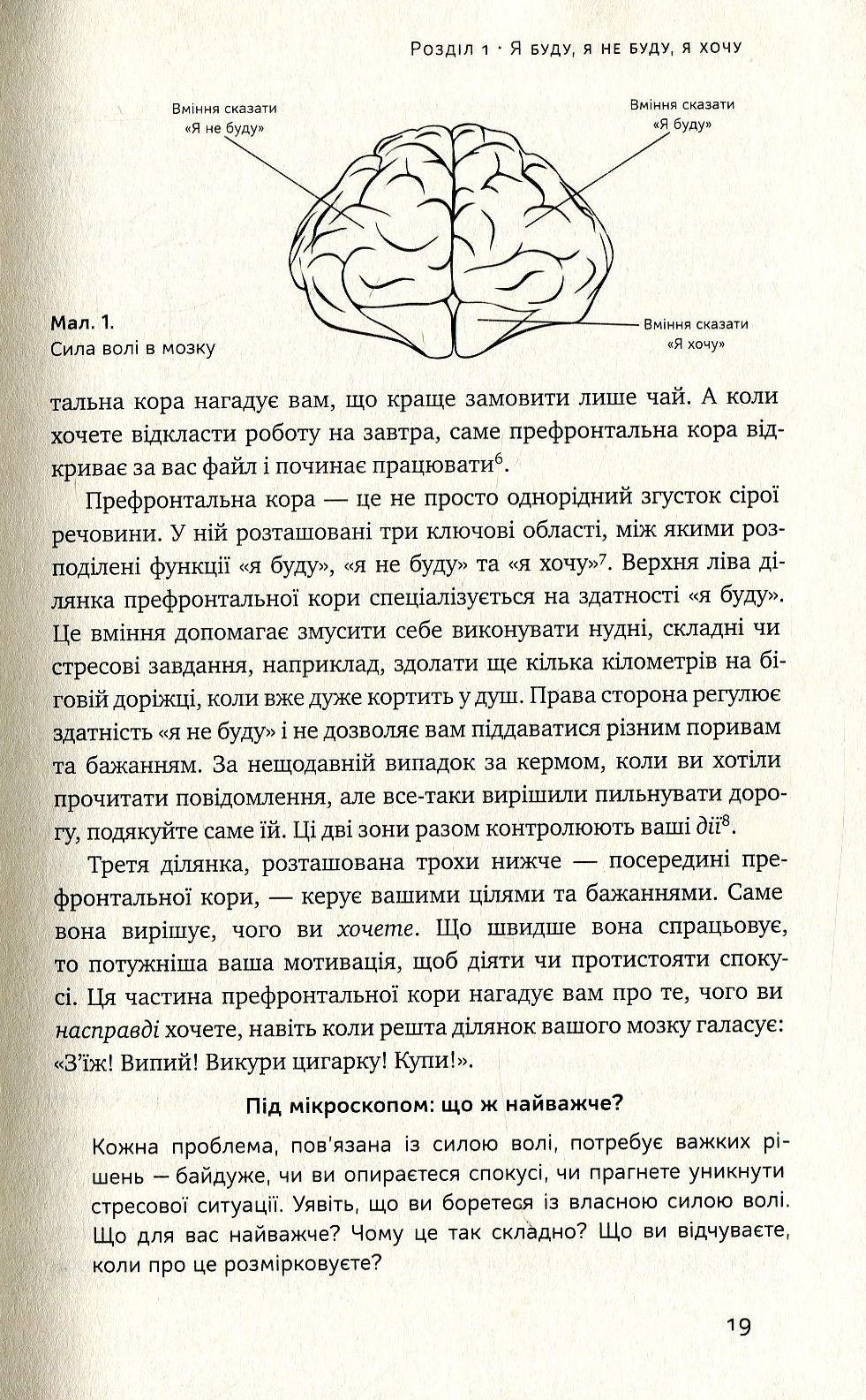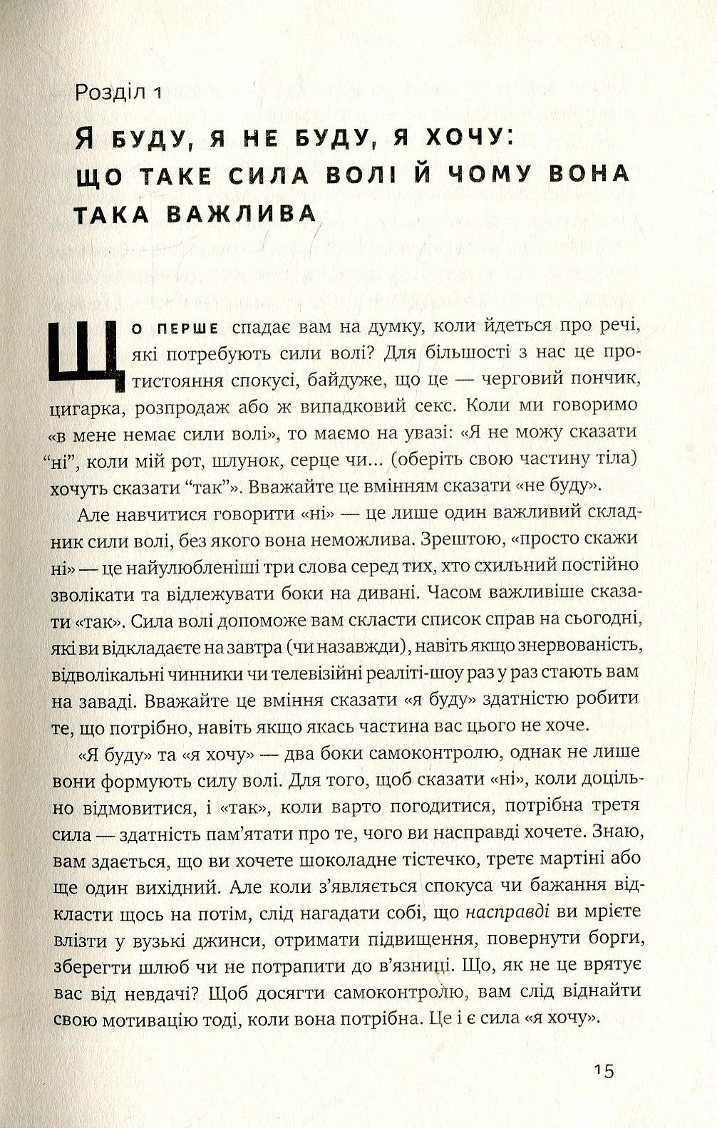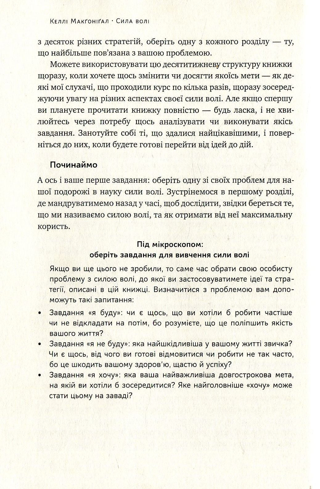Авторка з наукового боку показує, як влаштовано наше мислення, чому ми уникаємо змін і сповна не використовуємо власний потенціал. Але, окрім теорії, Макґоніґал подає безліч фактів і цікавих прикладів. Та найбільша перевага книжки — це вправи. Виявляється, завдяки ним мозок можна натренувати, як м’язи.