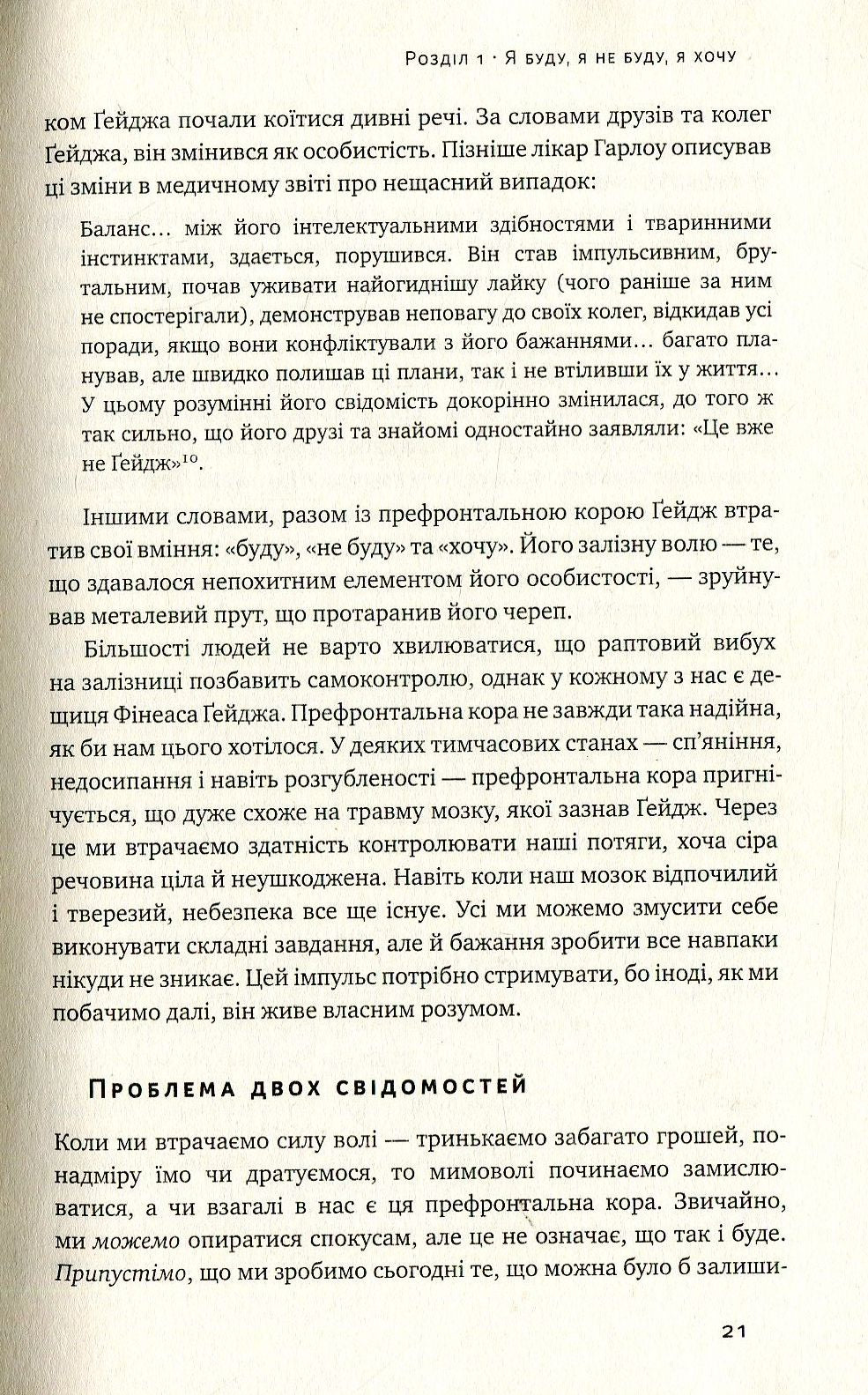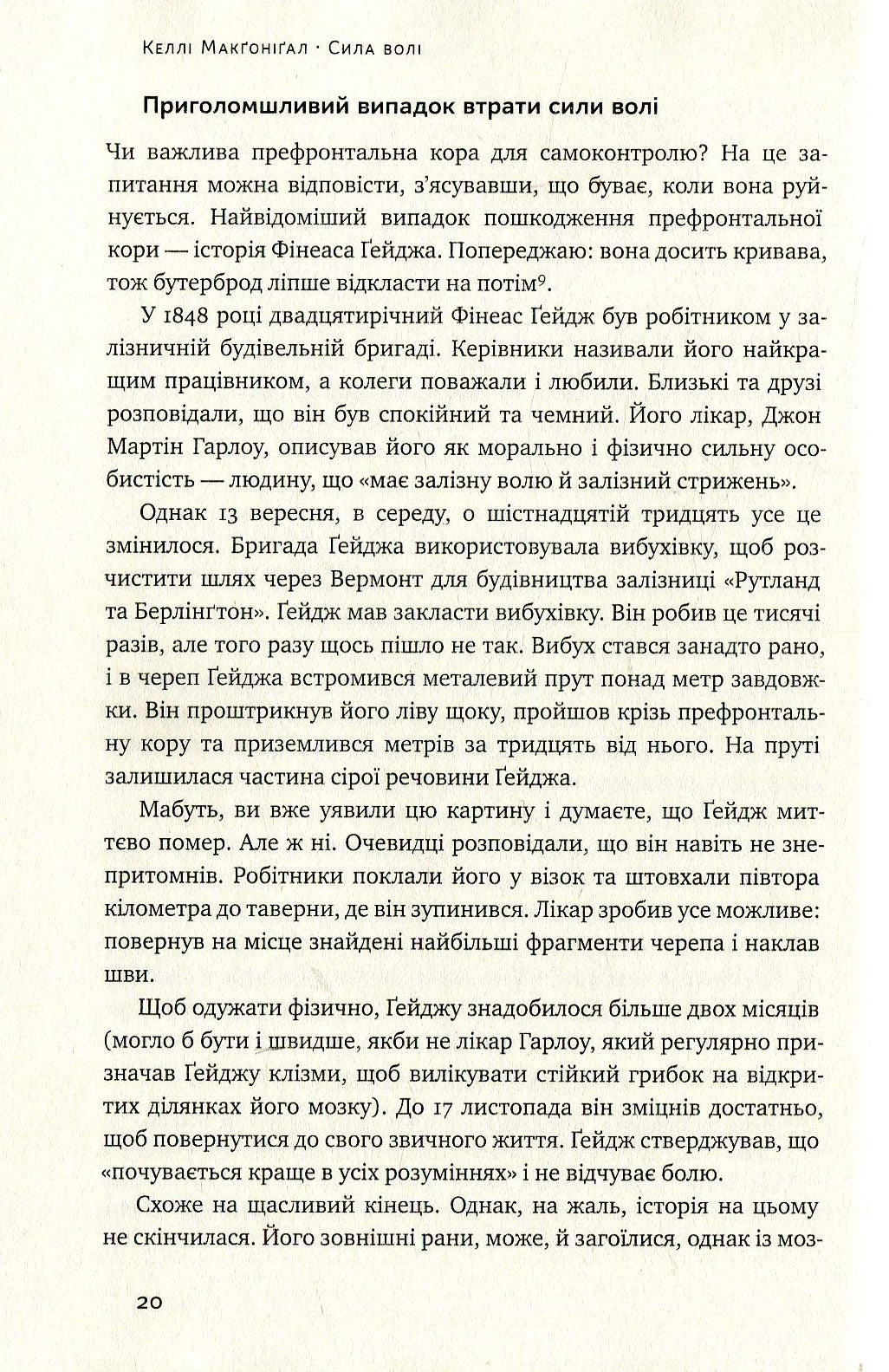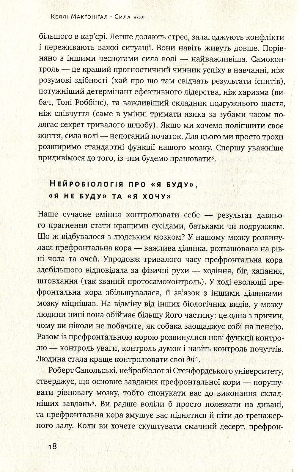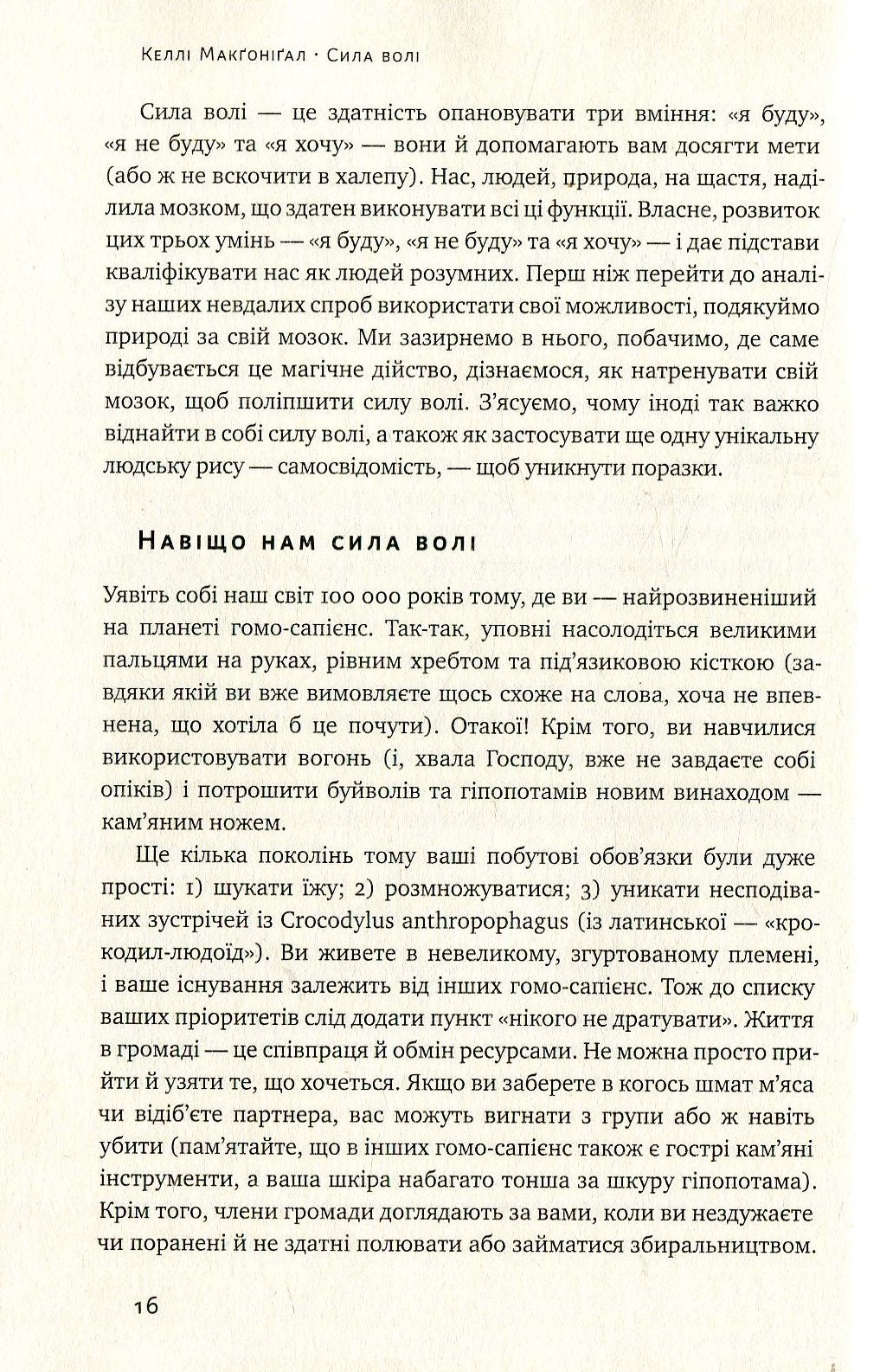 Авторка з наукового боку показує, як влаштовано наше мислення, чому ми уникаємо змін і сповна не використовуємо власний потенціал. Але, окрім теорії, Макґоніґал подає безліч фактів і цікавих прикладів. Та найбільша перевага книжки — це вправи. Виявляється, завдяки ним мозок можна натренувати, як м’язи.