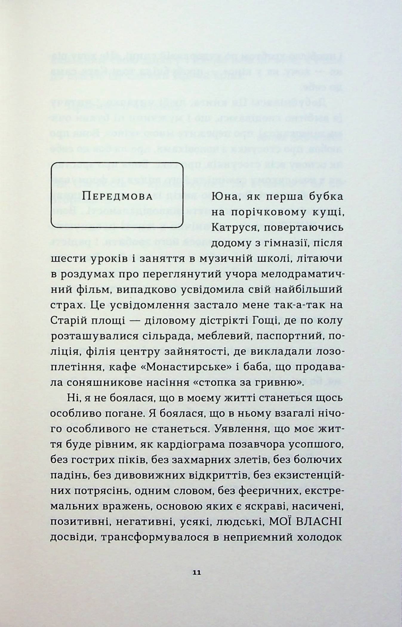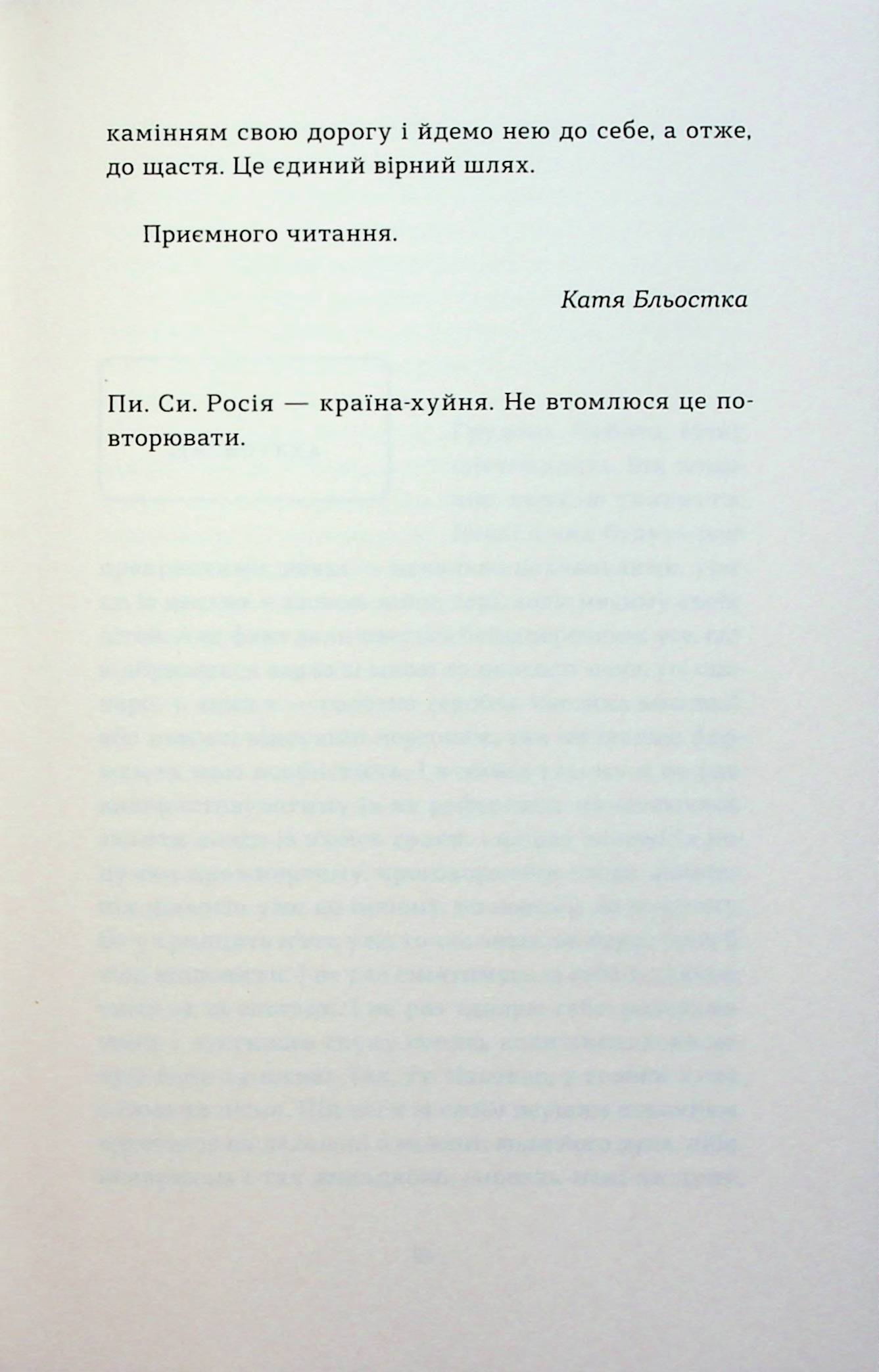 «Не хочу рівно, хочу, як у кіно». Від першої закоханості й метеликів у животі до конфліктів та важких рішень. У своїй новій книжці блогерка й авторка книжки «Матера вам не наймичка» Катя Бльостка відверто ділиться власною історією,починаючи від посиденьок з подружкою під дискотекою та перших побачень і до сварок із чоловіком й усвідомлення власних потреб. Ця історія про любов, секс і стосунки з чоловіками, вона про зростання у невеликому селищі та дорослішання. А ще ця історія про вибір та любов до себе, як основу всіх стосунків. Від дівчинки-підлітки до дорослої жінки – авторка ділиться своїми поглядами з гумором, самоіронією та легкою дозою вишуканого матюччя