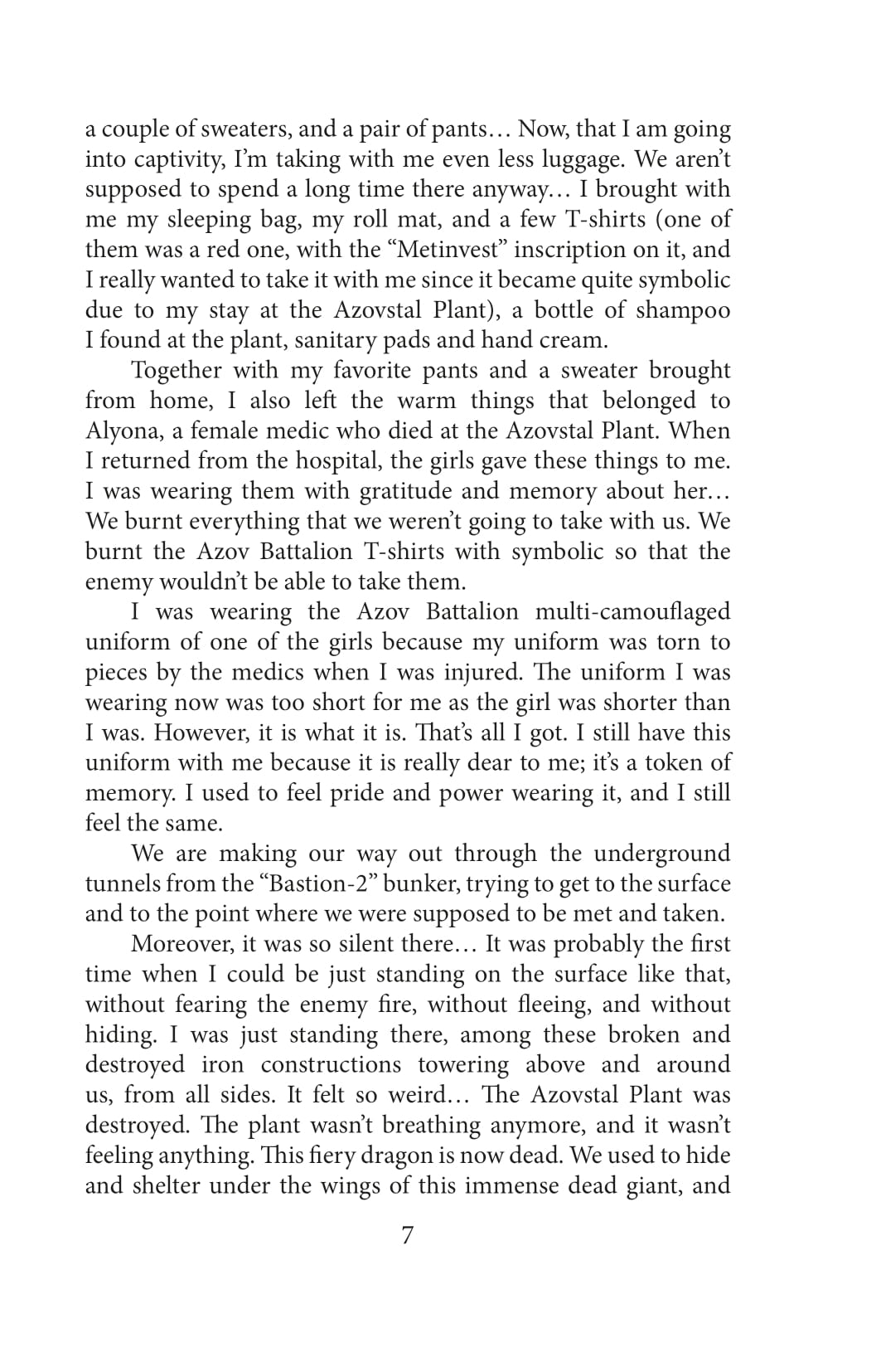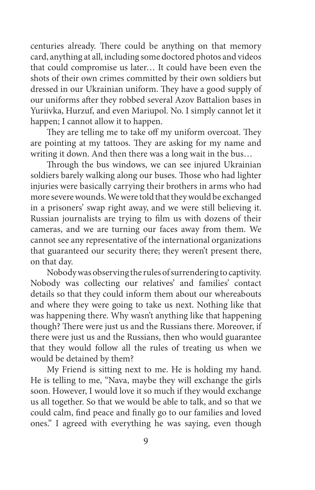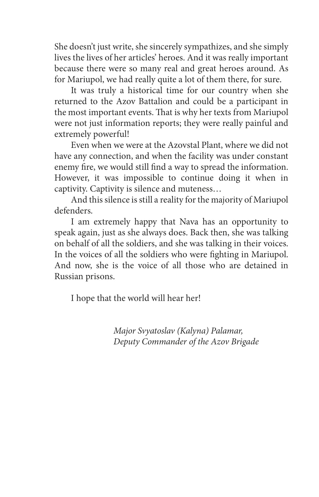 For 86 days, the Ukrainian military held defenses in the surrounded Mariupol and on the territory of the Azovstal plant. In order to preserve the lives of the soldiers and save the wounded, the defenders—by order of the higher military command—stopped standing on the defensive, left the territory of the plant and were to surrender to the so-called honorable captivity in the presence of international organizations and observers, with the condition of exchange within 3-4 months. Valeriya Nava Subotina was part of the press service of the Azov regiment. She was enforced to stay in captivity—first in Olenivka, then in Taganrog prison—for over 11 months. In this book, Valeriya described all the circles of hell that she went through for almost a year. Constant surveillance, control, humiliation, inhumane conditions of detention, critical shortage of food and water, attempts of the enemy to break her physically and morally, subjugate her, intimidate her, and push her to treason—Valeriya had to experience all these. Interrogations and torture were exhausting. The impossibility of getting in touch with friends and relatives, misinformation and enemy propaganda would take away the last hope for exchange and freedom. Nevertheless, captivity did not break the intrepid woman; now she is a witness to the crimes of the Russian Federation.