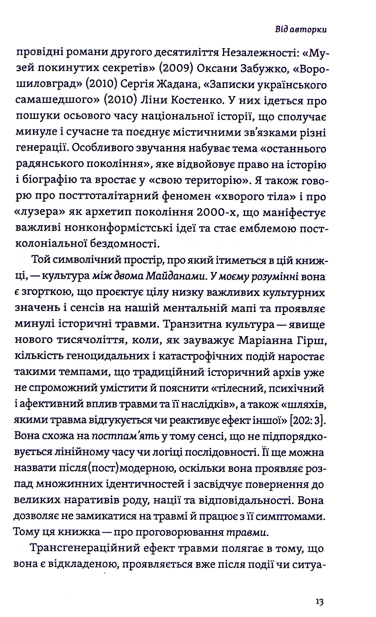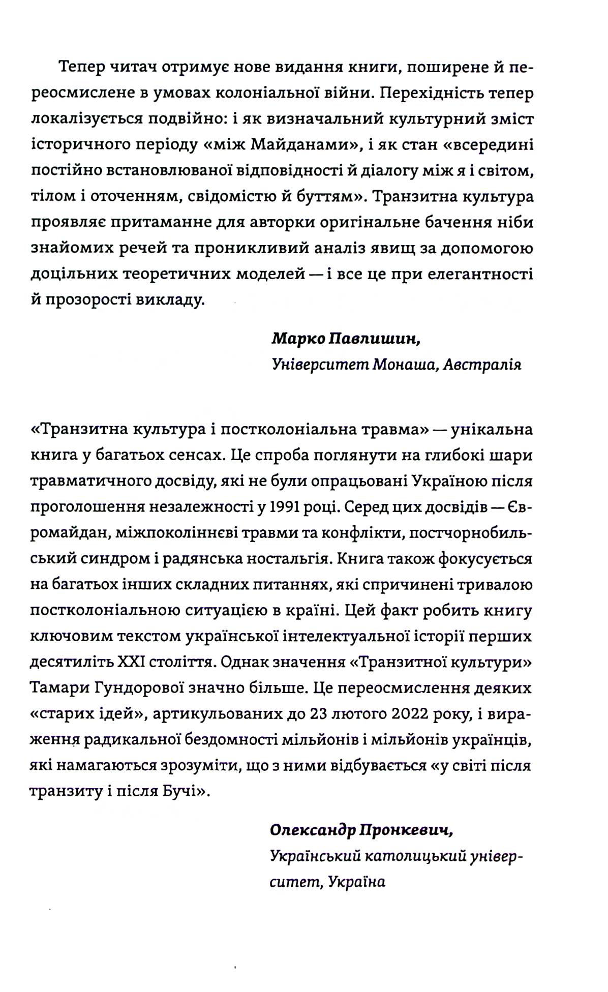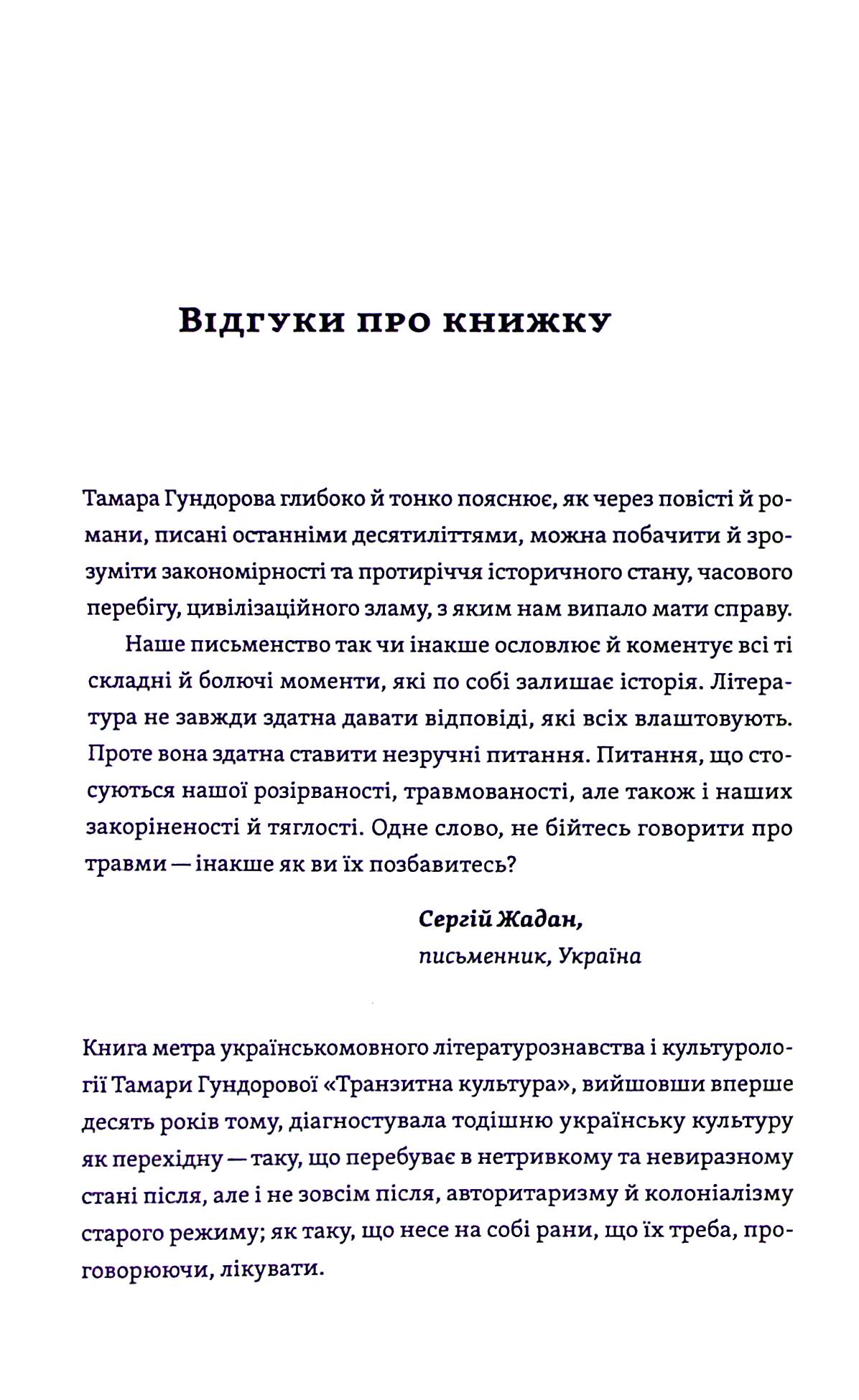 Романи Сергія Жадана, Оксани Забужко та Ліни Костенко стали знаковими творами української літератури початку 2000-х. У цій книжці Тамара Гундорова аналізує їх та низку інших символічних текстів і явищ культури між двома Майданами через призму трьох основних тем: постколоніальної травми, посттоталітарної свідомості та постпам’яті. Хто такий «лузер» в українській літературі? Як українські автори окреслюють «свою» Європу? Чому сімейні епопеї 2000-х стають музеями пам’яті? Про що розповідає Чорнобиль? І, зрештою, як Вєрка Сердючка стала емблемою транзитної культури? Авторка аналізує пострадянський культурний транзит, ресентимент і міжгенераційну пам’ять, розглядає «останнє радянське покоління», яке відвойовує право на національну історію, та аналізує покоління Незалежності як культурний архетип. Тамара Гундорова – професорка, літературознавиця, членкиня-кореспондентка НАН України, асоційована дослідниця Українського наукового інституту Гарвардського університету, головна співробітниця Інституту літератури ім. Т. Г. Шевченка, запрошена дослідниця Принстонського університету.