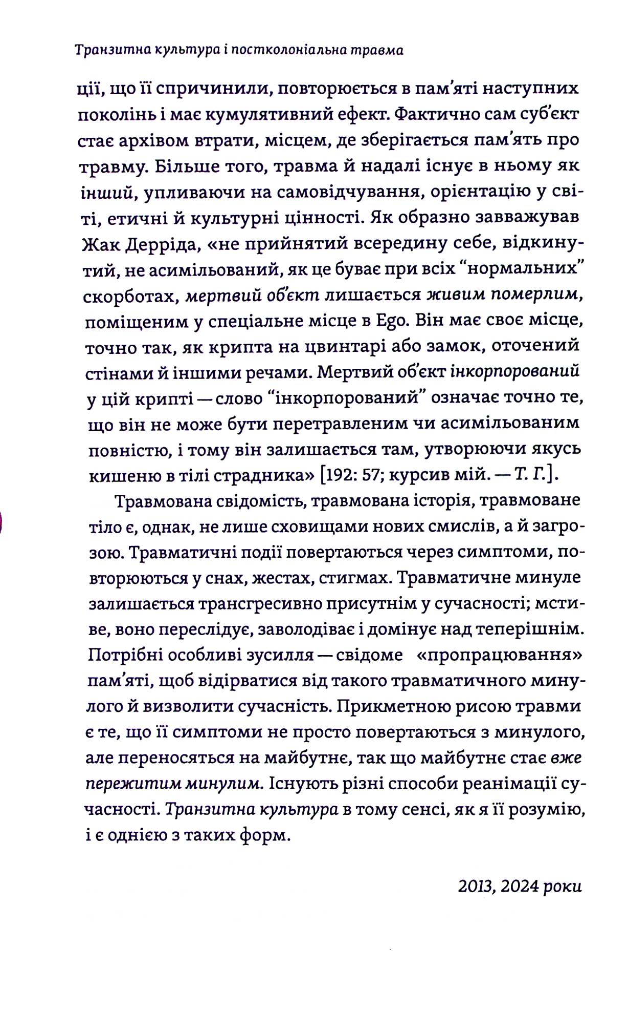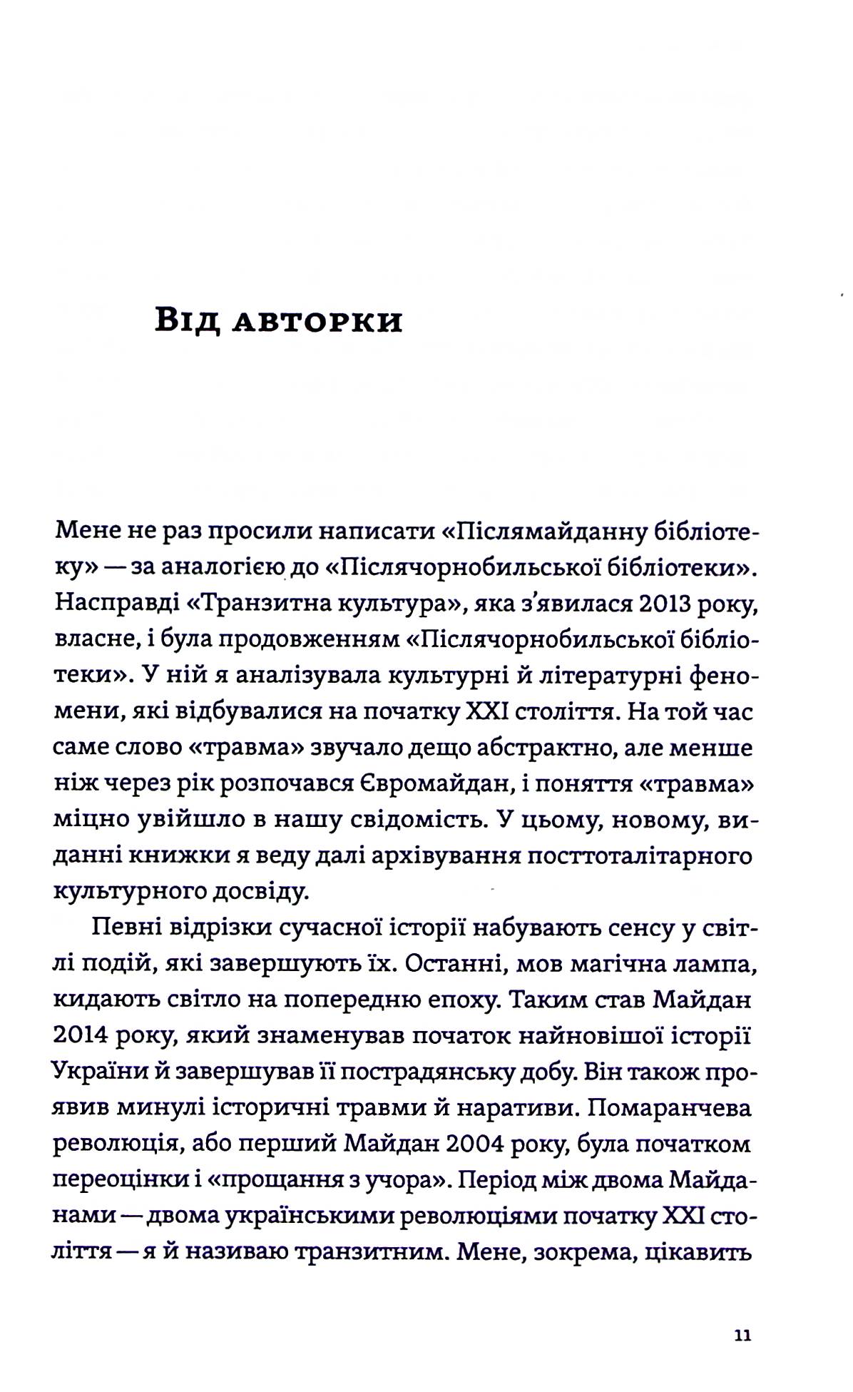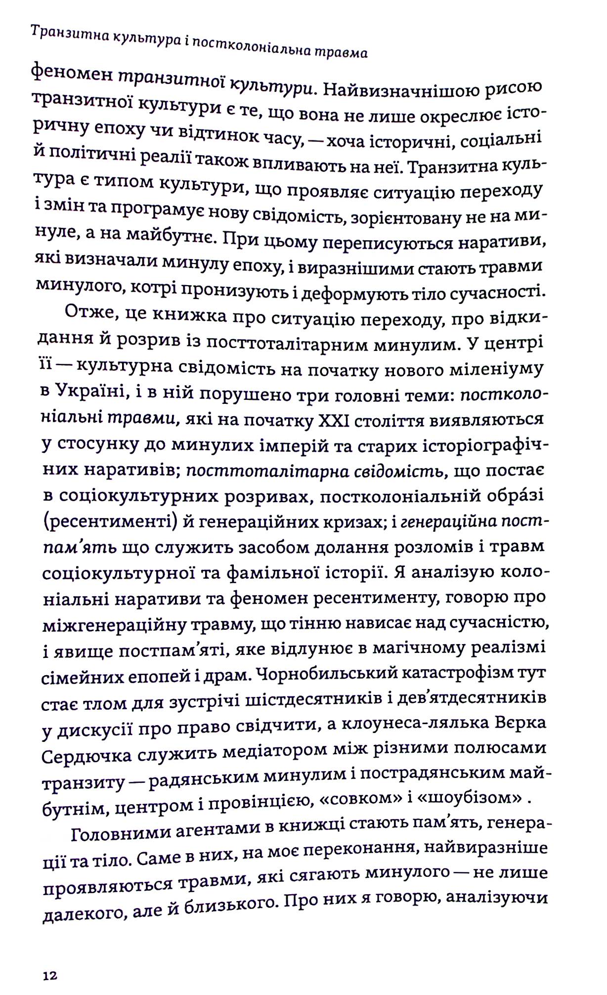 Романи Сергія Жадана, Оксани Забужко та Ліни Костенко стали знаковими творами української літератури початку 2000-х. У цій книжці Тамара Гундорова аналізує їх та низку інших символічних текстів і явищ культури між двома Майданами через призму трьох основних тем: постколоніальної травми, посттоталітарної свідомості та постпам’яті. Хто такий «лузер» в українській літературі? Як українські автори окреслюють «свою» Європу? Чому сімейні епопеї 2000-х стають музеями пам’яті? Про що розповідає Чорнобиль? І, зрештою, як Вєрка Сердючка стала емблемою транзитної культури? Авторка аналізує пострадянський культурний транзит, ресентимент і міжгенераційну пам’ять, розглядає «останнє радянське покоління», яке відвойовує право на національну історію, та аналізує покоління Незалежності як культурний архетип. Тамара Гундорова – професорка, літературознавиця, членкиня-кореспондентка НАН України, асоційована дослідниця Українського наукового інституту Гарвардського університету, головна співробітниця Інституту літератури ім. Т. Г. Шевченка, запрошена дослідниця Принстонського університету.