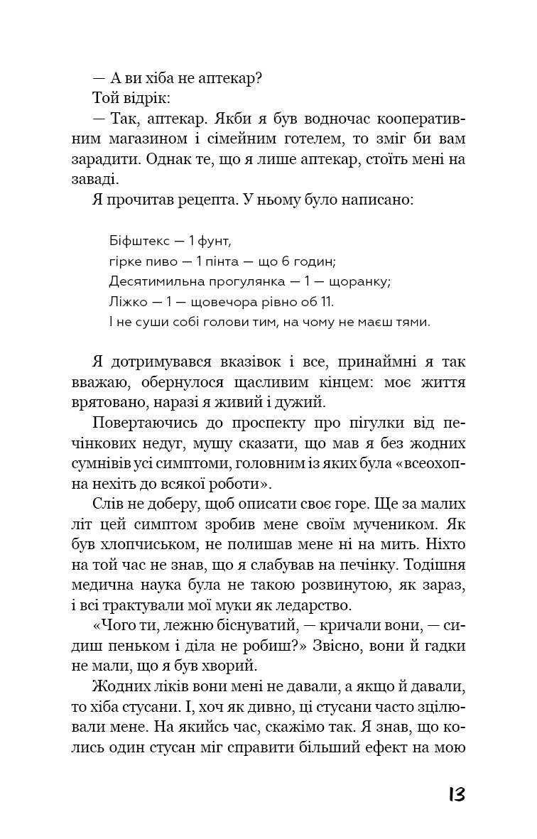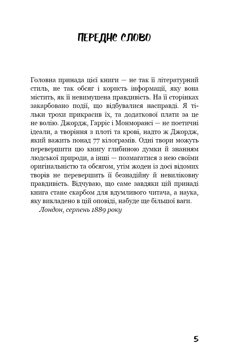 Троє друзів, які обтяжені лишень парубоцьким життям, іпохондрією та цілковитою побутовою непристосованістю, наміряються податися на вакації. Щоб набратися молодечої сили, здужання й здоров’я, вони замірилися утнути річкову мандрівку Темзою, адже дозвілля на лоні природи — набагато ліпше, ніж прокурені потяги і курні кеби. Які ж пригоди чекають на трьох молодиків, які ледь дають раду зі зборами й провіантом та частенько плутають назви місцин і селищ, до яких потрапляють. І за всією цією чудасією спостерігає енергійний і водночас поміркований фокстер’єр!