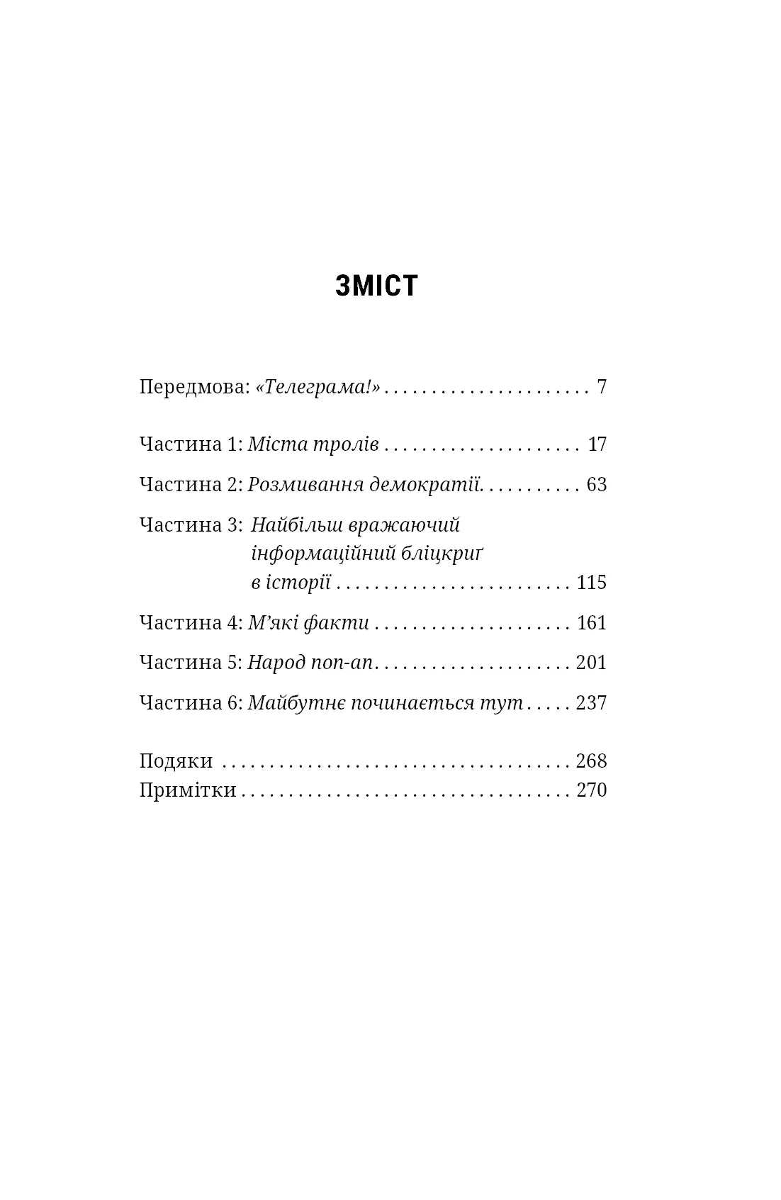 Ця книжка про величезну індустрію маніпулювання нашими думками, рішеннями, бажаннями, про нові та старі інструменти залякування і брехні, які використовують політики і наркомафія, релігійні фанатики і популісти, і що можна їм протиставити.Ця книжка про інформаційні війни, ботів і погоничів ботів, про тролів і хакерів, про фейкові новини і втрату прозорої політичної дискусії. А ще – про ХХ століття, про його інтелектуальний спадок, про Холодну війну і КҐБ, про втрачену ілюзію, що більше інформації означатиме більше свободи та глибші дискусії, про пошук надії. Це також сімейна історія, й історія дисидентства, яка, здавалося, закінчиться у ХХ столітті, але триває.Переклад цієї книжки здійснено за підтримки Міжнародного фонду Відродження. Партнер проекту hromadske.ua.Тираж цієї книги видано із залученням коштів Гранту інституційної підтримки наданих Українським інститутом книги.Відгуки про книгуПомеранцев детально описує, як погані хлопці зробили соціальні медіа своєю зброєю… Контраст між суворими обмеженнями доступу до інформації репресивними режимами у ХХ столітті та безкінечна халява сучасного медійного середовища робить цю книжку до збентеження потужною.— EconomistГлибоко… Це діагноз нашої недбалої до фактів епохи, вдумливий і гострий.— New York Times