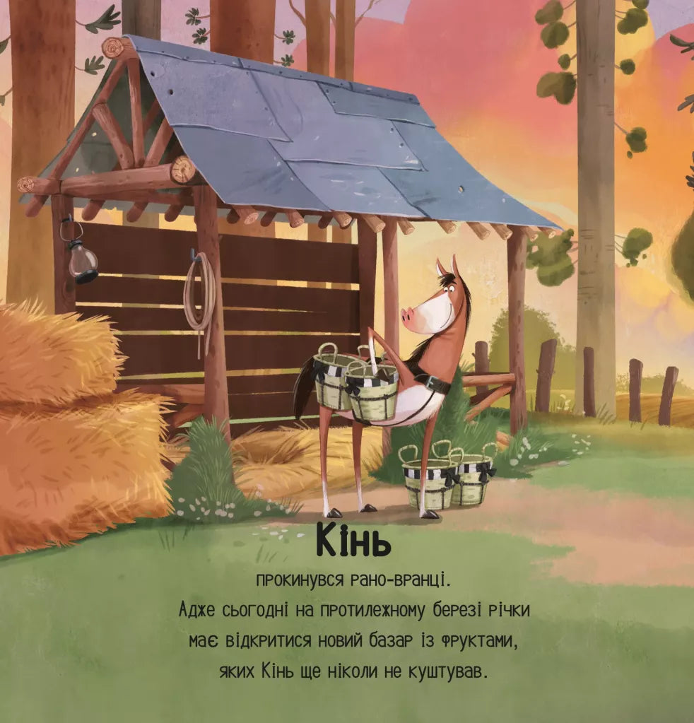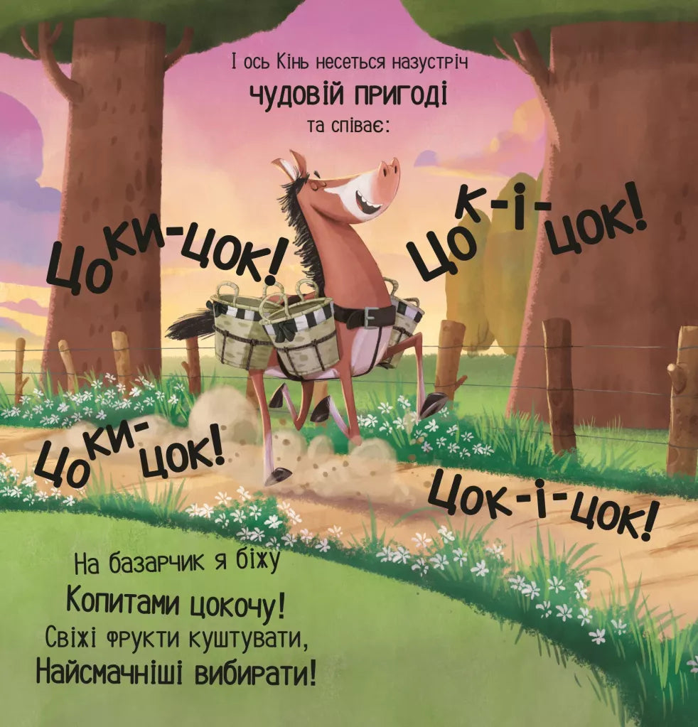 Рано-вранці Кінь вирушає на новий базарчик, аби придбати найсмачніші фрукти. Однак він не єдиний, кому це спало на думку. Чи зможе він туди дістатися без перешкод? І чи вистачить фруктів на всіх? Ця книжечка домініканської письменниці Аньї Дамірон подарує вам незабутні моменти, проведені разом із дітьми. Під час читання ви співатимете, відтворюватимете різноманітні звуки та ще йвідтворюватимете різноманітні звуки та ще й рахуватимете. Завдяки яскравим ілюстраціям Пабло Піно це буде неабияк весело й захопливо.