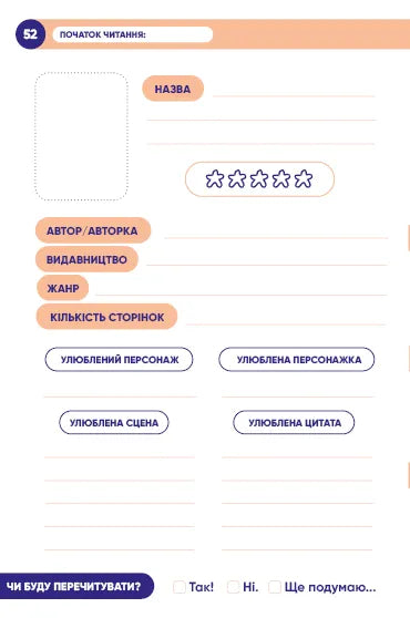 Незамінний помічник для книголюбів і наших reading ambassadors!Обожнюєш читати, відстежуєш усі новинки улюблених видавництв і маєш довжелезний перелік книжкових бажанок? Тоді цей щоденник — для тебе! Занотовуй читацькі враження, досліджуй свої книжкові вподобання, плануй, мрій і розвивайся разом із читацьким щоденником АРТБУКС.Щоденник складається з таких розділів:Книжкова шафаЧитацький портретКнижкові вподобанняЧитацькі бажанкиКнижкові челенджіЧитацькі планиМої прочитані, недочитані та перечитані книжкиЧитацькі підсумкиРозрахований на 50 книжок.