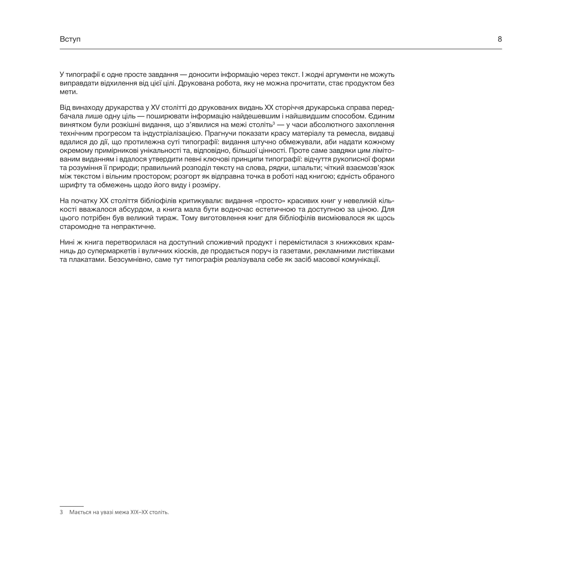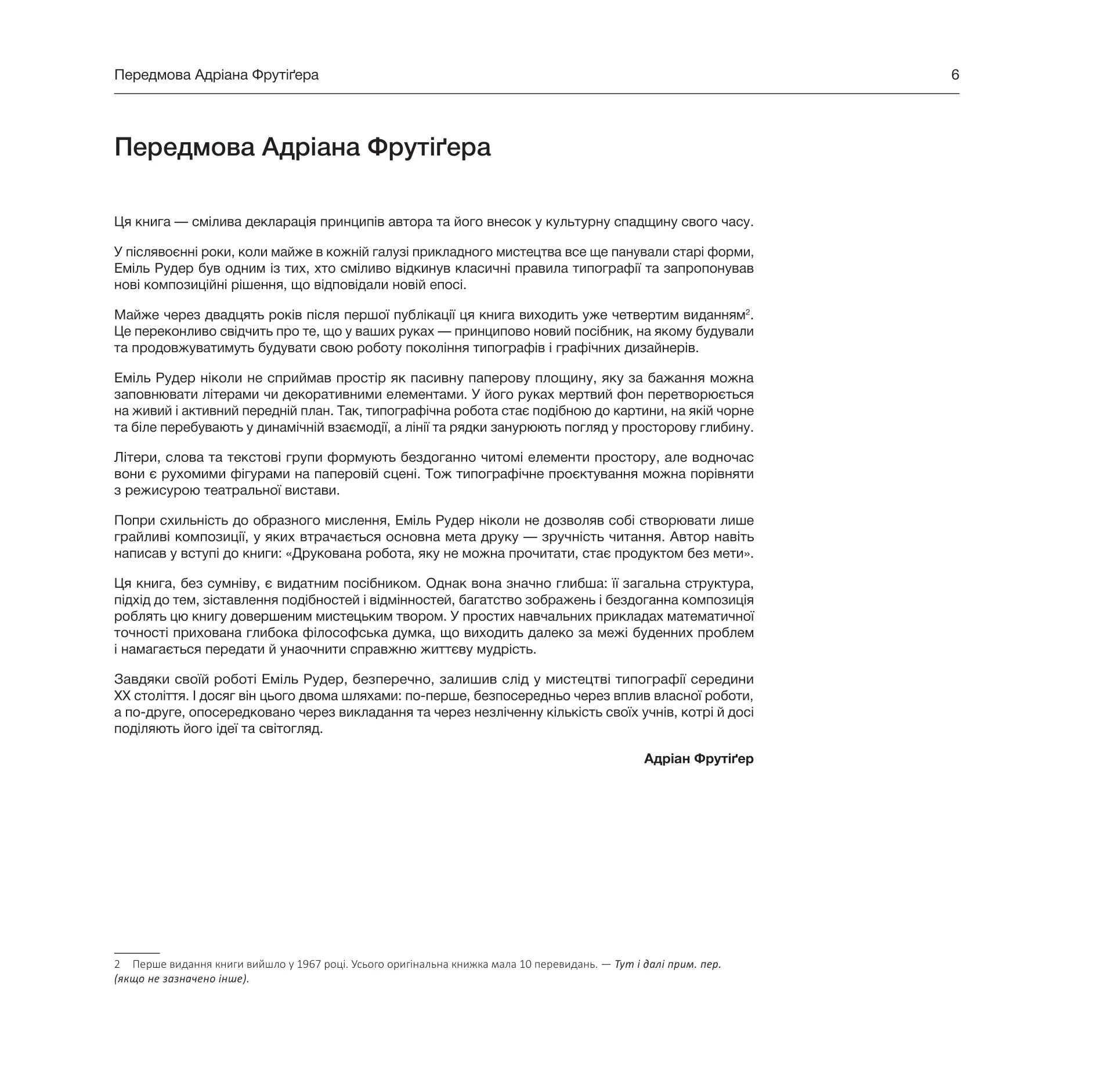 Книга «Типографія» є спадщиною Еміля Рудера, одного із засновників швейцарського стилю в дизайні, відомого в усьому світі за використання асиметричної верстки, модульної сітки, шрифтів без засічок, вирівнювання по лівому краю та порожнього простору на сторінці.Його методологічний підхід до типографії визнаний графічними дизайнерами в усьому світі. Видання містить чітко структуровані теми, ілюстрації та гармонійно дібрані шрифти, а також міркування автора про принципи дизайну загалом.Сьогодні, через більш ніж п'ятдесят років після першої публікації цієї книги, чимало її тез досі є актуальними та засадничими, водночас з деякими ви можете подискутувати, враховуючи нові тенденції у світовому дизайні.