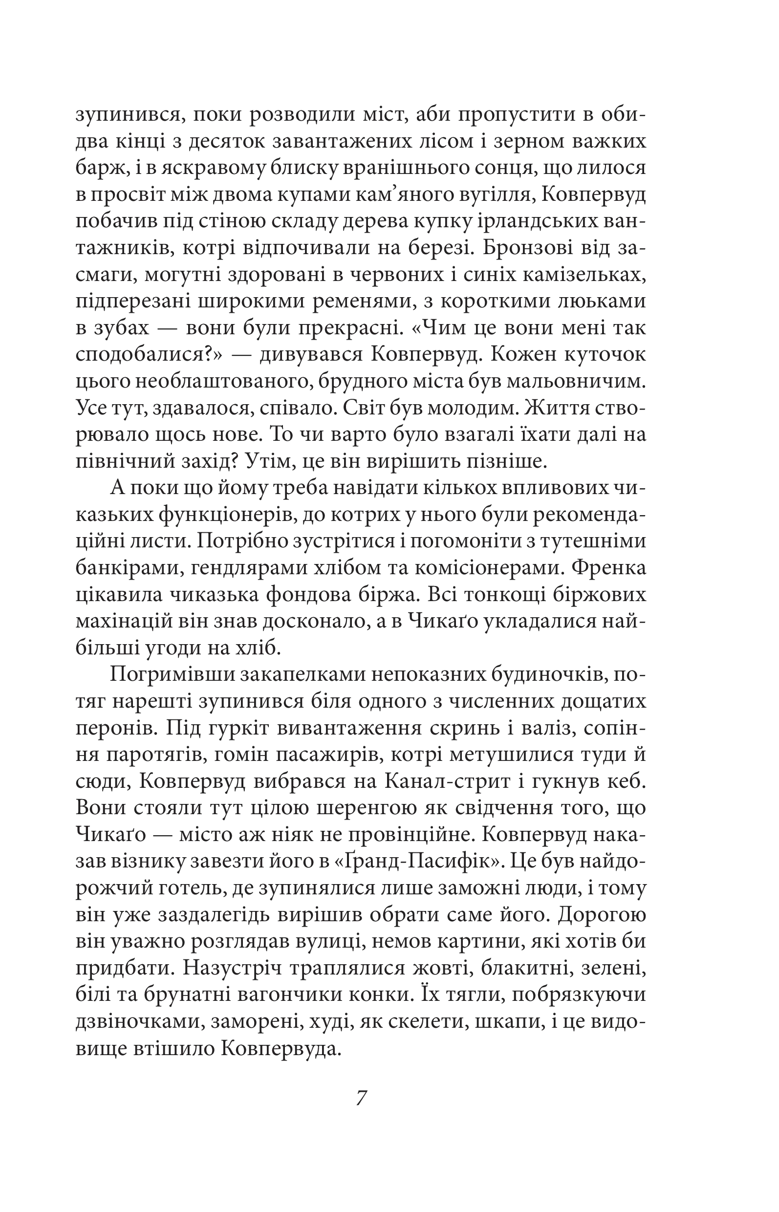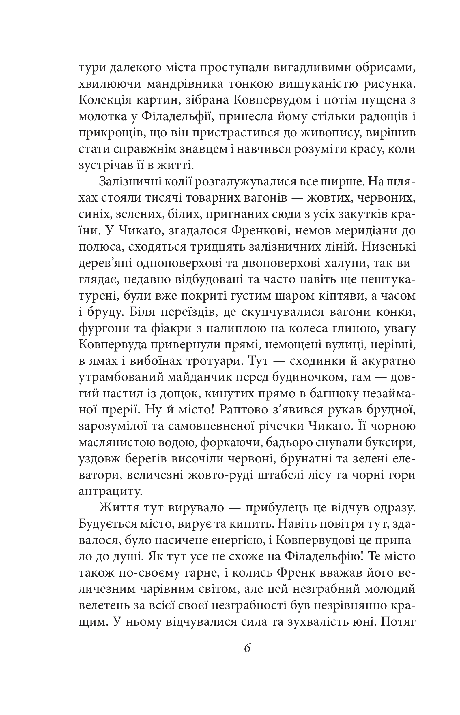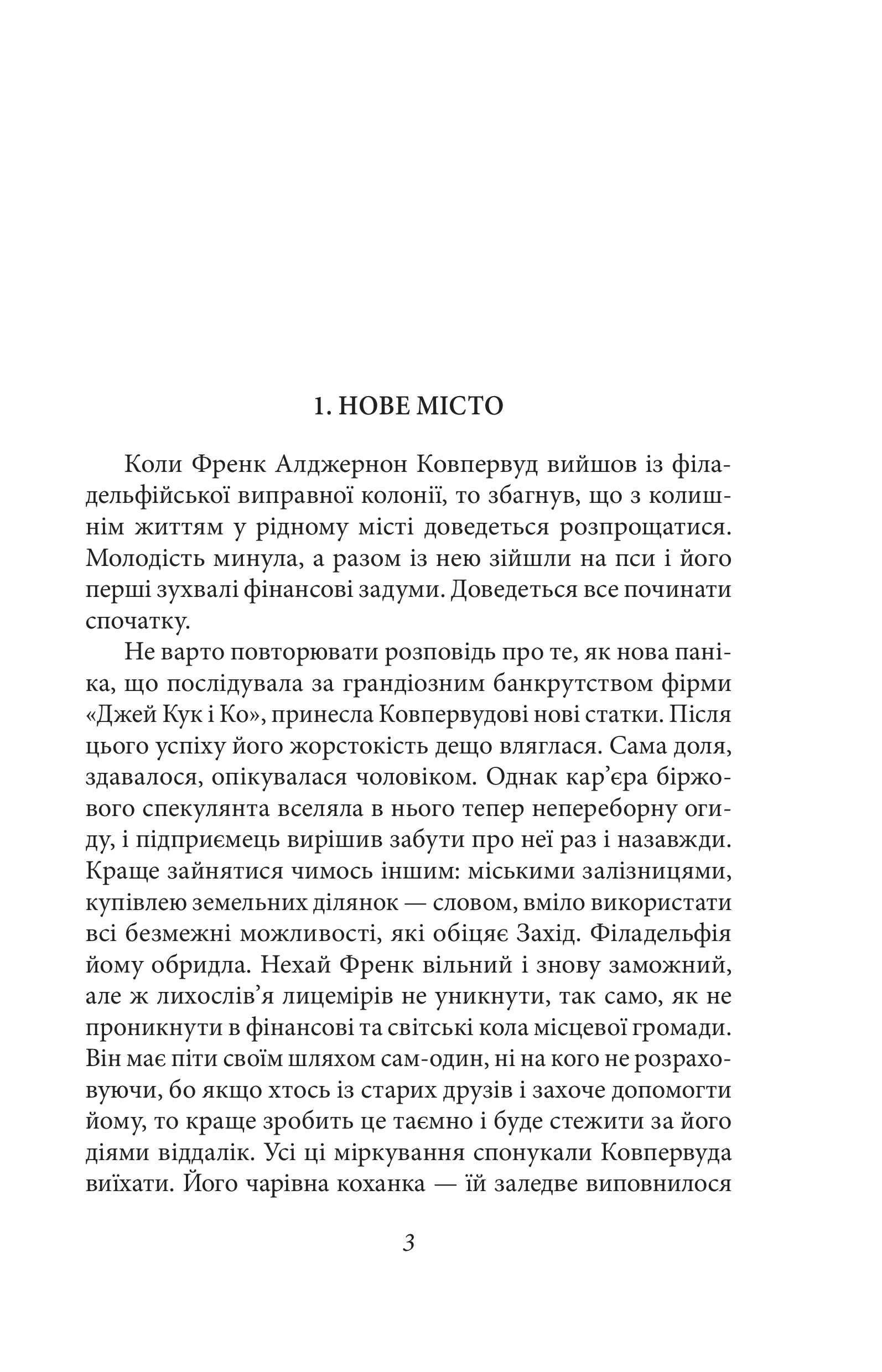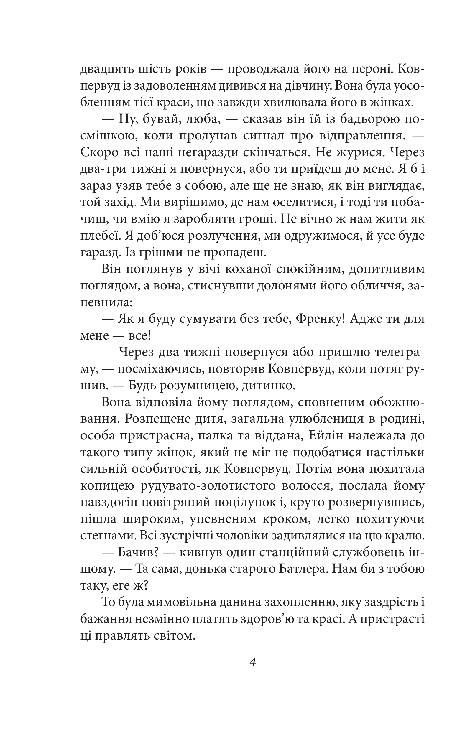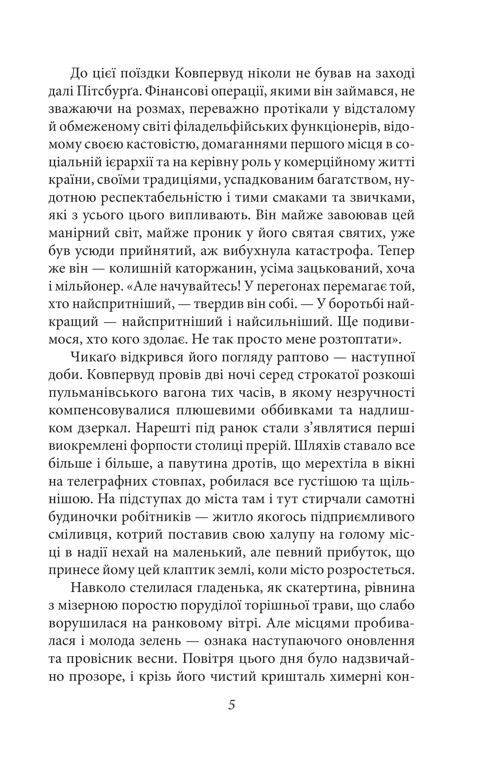 Теодор Драйзер (1871—1945) — відомий американський письменник і громадський діяч, чиїми творами вже понад сто років захоплюються читачі в усьому світі. «Титан» (1914) — друга частина циклу «Трилогія бажання», в основу якого покладено історію життя американського мільйонера Чарлза Йєркса.Френк Ковпервуд, вийшовши із філадельфійської в’язниці, разом з Ейлін переїжджає до Чикаго, де знову намагається створити власну імперію. Низка вдалих спекуляцій під час біржевої паніки робить його мільйонером. В особистому житті Френк віддаляється від Ейлін, змінює безліч коханок, поки не закохується у Береніс Флемінґ — юну красуню з гарними манерами. Людина, яка добилася успіху в житті, накопичивши мільйони, людина, яка не зупиниться ні перед чим, добиваючись вищих щаблів влади, людина, яка має магнетичну харизму, що підкорює всіх, хто зустрічається на її шляху... — саме таким постає в романі «Титан» Френк Ковпервуд.