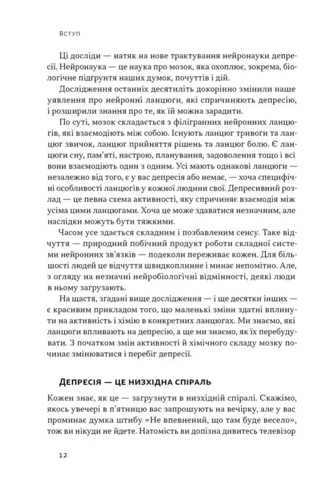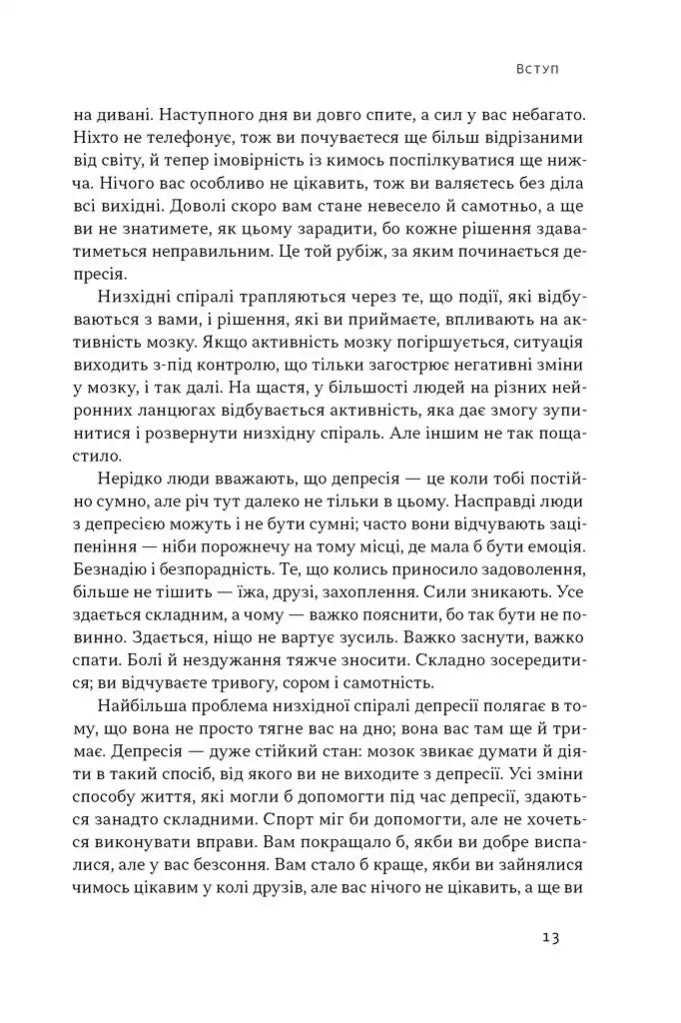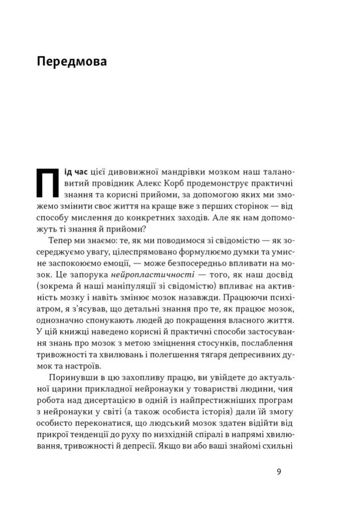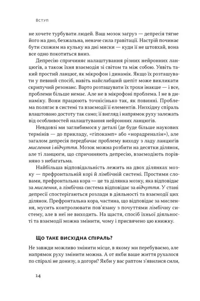 Депресія схожа на спіраль, яка дедалі більше затягує нас на дно й утримує там. Там, де мала би бути якась емоція, люди відчувають порожнечу. Те, що колись дарувало задоволення, більше не тішить. Усе здається складним, і ніщо не вартує зусиль. Однак по спіралі можна рухатися і догори, роблячи маленькі кроки. Часом лише кілька позитивних емоцій запускають процес, який дає сили для позитивних змін у різних сферах життя. У цій книжці Алекс Корб пояснює, що відбувається в мозку людини у пригніченому стані, які думки ведуть униз та як «перепрошити» деструктивні патерни на підтримувальні. На відміну від типових порадників, книжка спирається на нові нейробіологічні дані, щоб показати: навіть найменші дії — фізична активність, дихання, соціалізація — здатні вплинути на активність різних нейронних ланцюгів і якісно змінити життя. Для усіх, хто дбає про ментальне здоров’я і шукає науково вивірених порад.