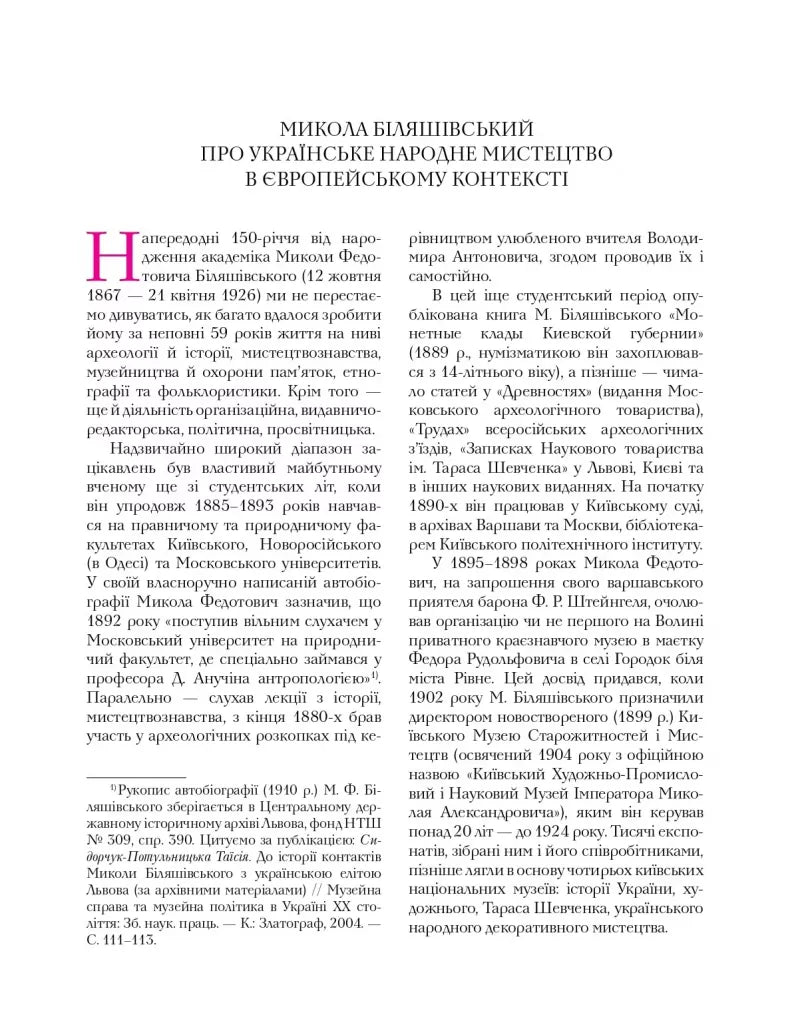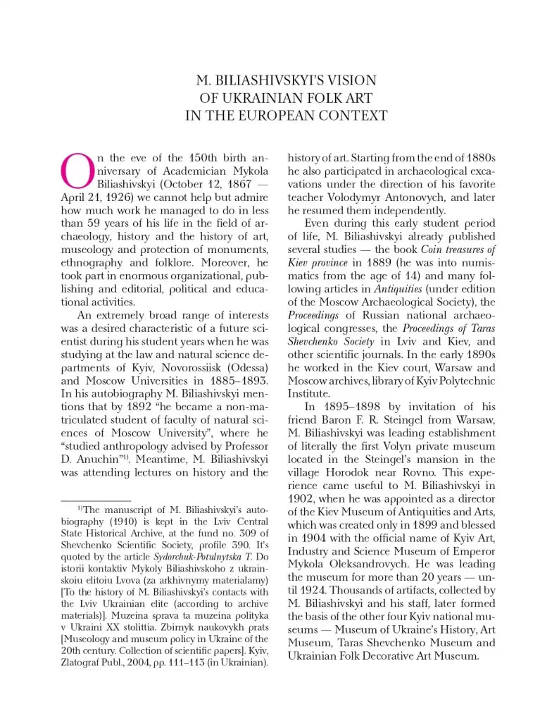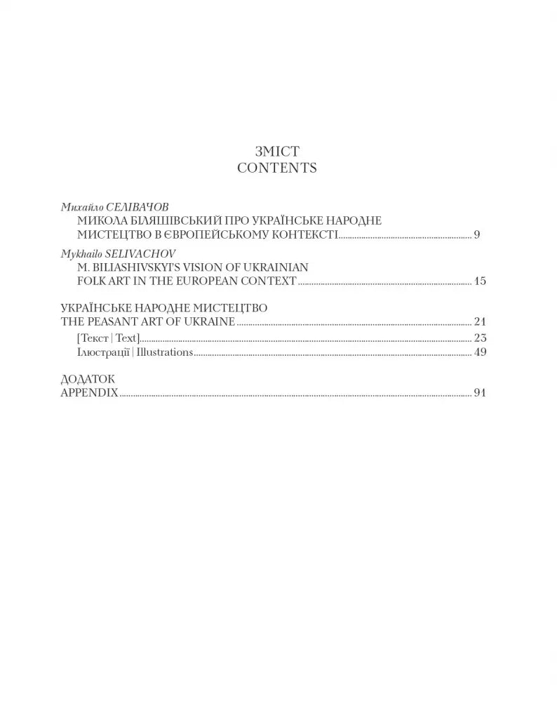 Це видання є першим українським перекладом англомовної праці видатного українського науковця та музейника Миколи Федотовича Біляшівского (1867–1926), що вийшла в Лондоні 1912 року у видавництві часопису «The Studio». Книгу доповнено унікальними світлинами етнографічного характеру кін. XIX – поч. ХХ ст. з колекції Національного художнього музею України (ДАФ НХМУ, ф. 33). Видання приурочено 155-літтю від дня народження М. Ф. Біляшівського. This edition is the first Ukrainian translation of the English study by the famous Ukrainian scientist and museum worker Mykola Biliashivskyi (1867–1926), which was originally published by The Studio art journal in London in 1912. The book is supplemented by exclusive ethnographic photographs of the late 19th and early 20th century from the collection of the National Art Museum of Ukraine (fund no. 33). The edition is dedicated to Mykola Biliashivskyi’s 155th birth anniversary.