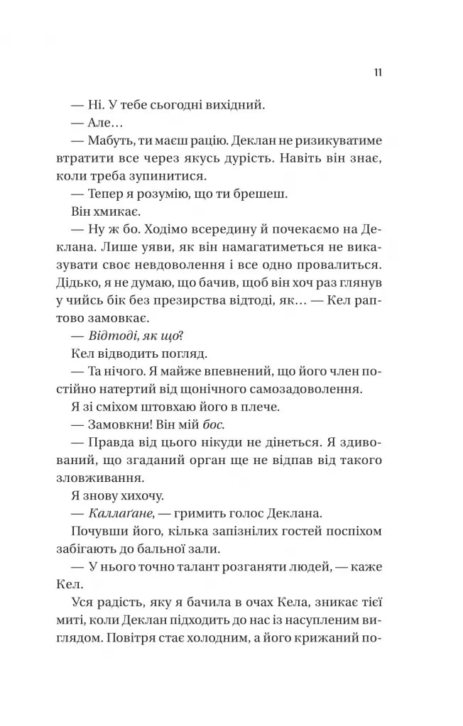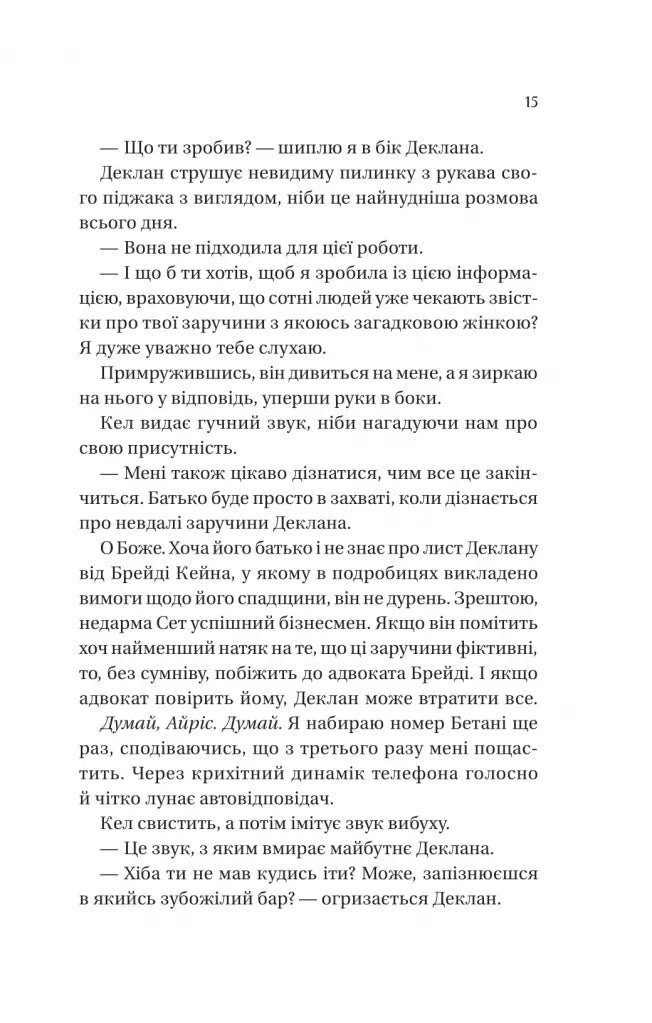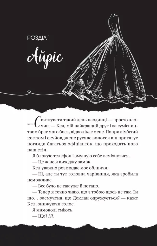 Вони ненавидять одне одного. Але ризикнуть зіграти в закоханих... Деклан Мені судилося стати наступним генеральним директором медіаімперії моєї родини. Єдина проблема — пункт про спадщину в дідовому заповіті. Виконання його останнього бажання — одружитися й народити спадкоємця — здавалося неможливим, доки моя асистентка не зголосилася допомогти. Наш шлюб мав стати моїм порятунком. Але що більше ми вдаємо закоханих на публіці, то менше я впевнений у цьому контракті. Умови угоди не передбачали турботу про Айріс. Тим паче коли розбите серце — це лише питання часу. Айріс Мій план одружитися з Декланом був простим у теорії. Жити разом. Зіграти весілля. Народити дитину. Ми визначили правила, щоб запобігти будь-яким проблемам. Правила, яких ніколи не можна порушувати, хоч би як Деклан мене спокушав. Але що, як наші фальшиві стосунки стануть справжніми? Про почуття не могло бути й мови. Принаймні для мене.