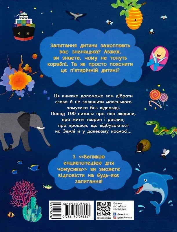 «Велика енциклопедія для чомусика» допоможе знайти відповіді на будь-які питання дитини. Книжка охоплює шість тем: людина, тварини, природа, космос, техніка, їжа. А запитання тут сформульовано, неначе з вуст дошкільника. Чому вночі немає сонця? Як мухи ходять по стелі? Навіщо в сирі дірки? Напевно, ви знаєте. Та з енциклопедією пояснити все це п’ятирічці значно простіше.