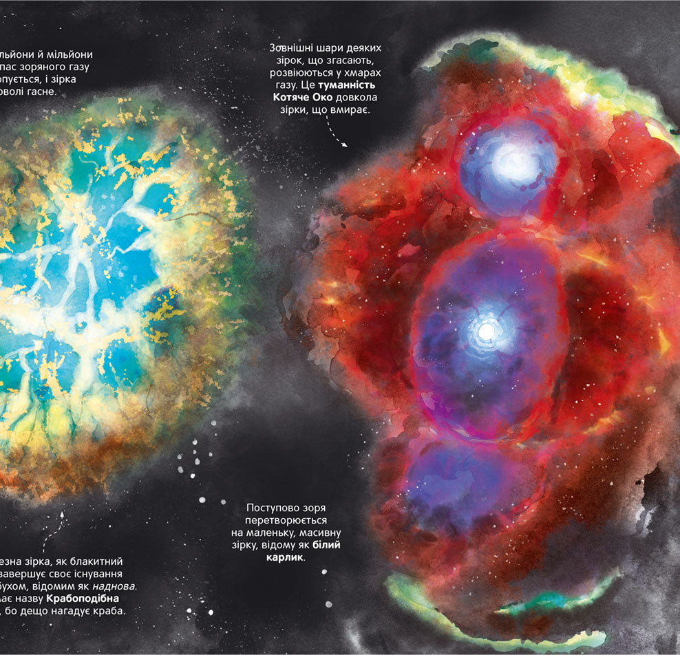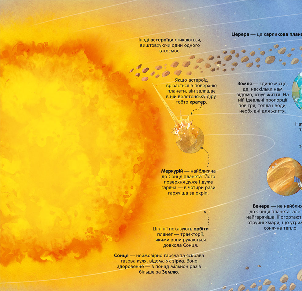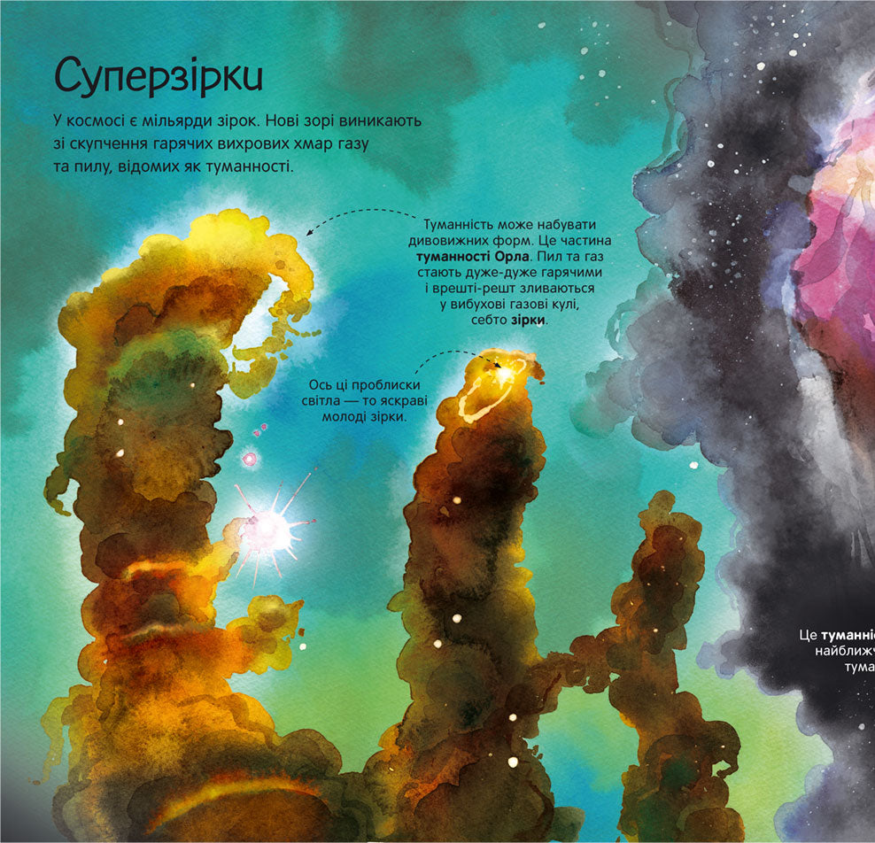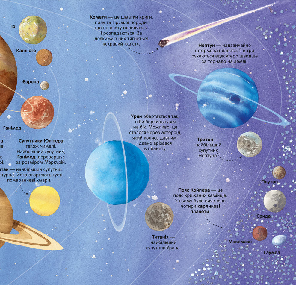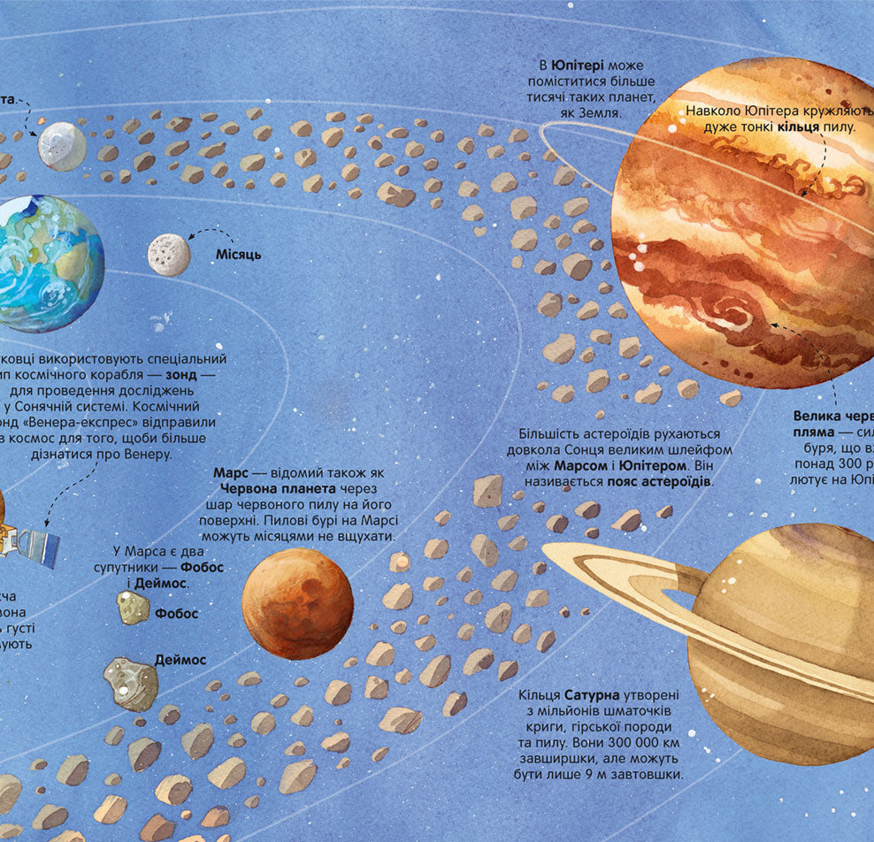 · У книжці є 4 велетенські розгортки із деталізованими зображеннями і поясненнями, які розкажуть дітям про небесні тіла: комети, планети, метеорити, астероїди, зірки, а також різноманітні пристрої для дослідження космосу.