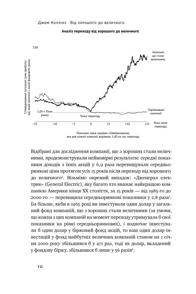 У цій книжці Джим Коллінз аналізує діяльність і структуру компаній, яким вдалося здійснити прорив у вищу лігу бізнесу. Він відібрав фірми, які, попри всі кризи, п’ятнадцять років поспіль показували найкращі результати у своїй галузі. Як Gillette, Kimberly-Clark, Philip Morris та іншим вдалося взяти настільки високу планку? Джим Коллінз вивів формулу — дев’ять кроків, які дозволять розкрутити маховик успіху до швидкості, яка приносить шалені прибутки.Для кого книжкаДля якнайширшого кола читачів, усіх, хто цікавиться бізнесом, менеджментом, саморозвитком. Особливо зацікавить СЕО, менеджерів та стартаперів.Чому ця книгаЯкщо ви відчуваєте, що до певного етапу піднімалися вгору, а вже кілька років пробуксовуєте на місці, то ця книжка — той червоний прапорець, який покаже, що ви робите не так і куди слід почати рухатися, щоб пробитися у вищу лігу бізнесу. Джим Коллінз пояснить, як вивести компанії, громадські і державні організації та установи з хорошого на величний рівень.Про автораДжим Коллінз— американський бізнес-консультант і письменник. Автор книжок «Від хорошого до величного», «Величні за власним вибором», «Зроблено на совість». Публікується в Harvard Business Review, BusinessWeek, Fortune та інших виданнях. Живе у Боулдері, штат Колорадо.ВідгукиТоп-менеджерам варто негайно купити цю книжку.— USA TodayКоллінз і його дослідницька команда знайшли відповідь на одне з найголовніших питань бізнесу.— FortuneЦе бізнес-ідея року.— Fast CompanyЦитатиЗагальнолюдська проблемаТвердження про те, що хороше — ворог величного, стосується не лише бізнесу. Це загальнолюдська проблема. Якщо нам вдасться знайти ключ до питання, як перейти від хорошого до величного, то наше дослідження буде корисним для організації будь-якого типу. Хороші школи зможуть стати величними школами. Хороші газети величними газетами. Хороші церкви величними церквами. Хороші урядові організації величними урядовими організаціями. А хороші компанії неодмінно стануть величними компаніями.Дзеркало й вікноЛідери п’ятого рівня дивляться у вікно, приписуючи успіх компанії тим факторам, що не пов’язані з ними самими. Коли вони не можуть знайти конкретної людини або події, завдяки якій це сталося, то списують усе на удачу. При цьому вони дивляться у дзеркало, щоб взяти на себе відповідальність, а не скаржитися на невезіння, коли справи йдуть не дуже добре. Лідери компаній із групи порівняння роблять абсолютно протилежне. Вони дивляться у вікно, щоб звинуватити когось іншого у поганих результатах. Проте вони годинами вдивляються у дзеркало, щоб приписати собі заслуги, коли справи йдуть добре.Люди в автобусіКерівники величних компаній не вирішували наперед, куди прямуватиме автобус, щоб потім набрати у нього пасажирів. Ні, вони спочатку набирали в автобус потрібних людей (і висаджували непотрібних), а потім вирішували, куди прямувати. По суті вони говорили: «Послухайте, я не знаю, куди нам треба їхати. Проте одне я знаю точно: якщо ми візьмемо в автобус потрібних людей, і вони будуть на своїх місцях, а тих, хто нам не підходить, висадимо, то обов’язково зрозуміємо, до якого чудового місця нам слід рухатися».ПрискорювачТі, хто створив величні компанії, розуміють, що основним прискорювачем зростання компанії є не ринки чи технології, не конкуренція чи продукція. Має значення одне-єдине: здатність знайти і втримати у комп
