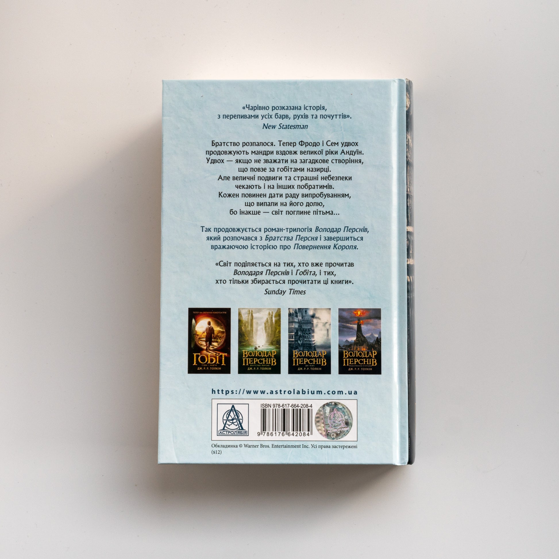 У другій частині трилогії подорож до Судної Гори триває. Загін, що супроводжував Фродо і Перстень Влади втратив двох учасників і розділився на три групи. Фродо і Сем попливли в човні, поспішаючи якомога швидше і непомітніше потрапити в Мордор, адже результат битви, яка наближається, залежить від того, чи встигнуть вони знищити Перстень Влади. Меррі та Піппін були захоплені в полон ворогами. По їх сліду поспішають на допомогу Арагорн, Гімлі та Леголас, в надії встигнути врятувати друзів.